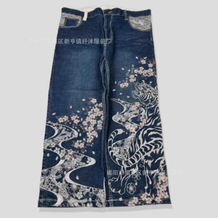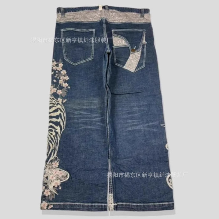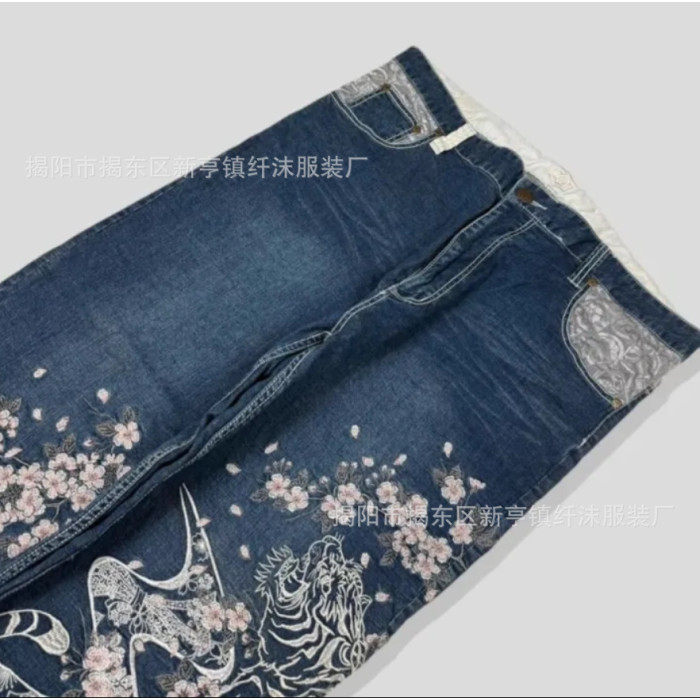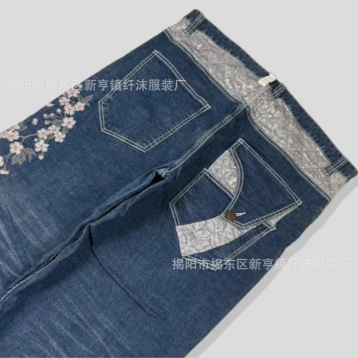 復古植物花卉寬松牛仔褲2025美式高街顯瘦直筒褲新款長褲