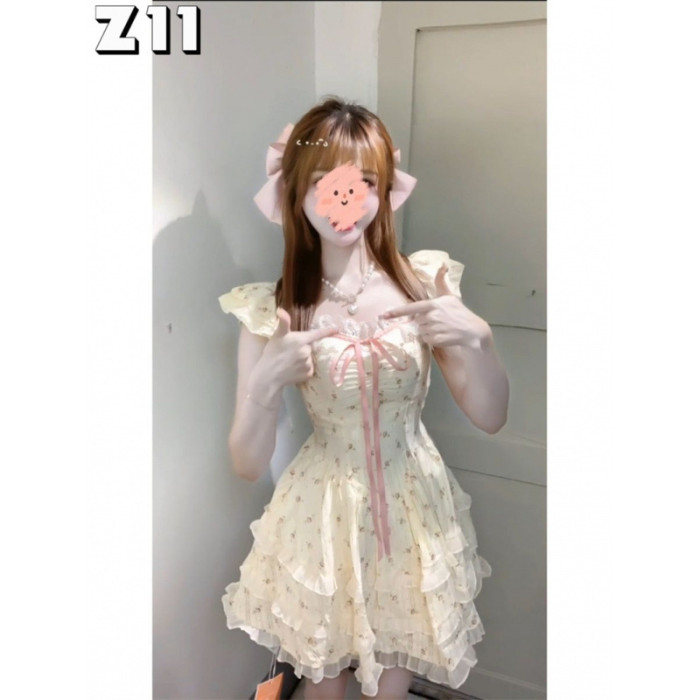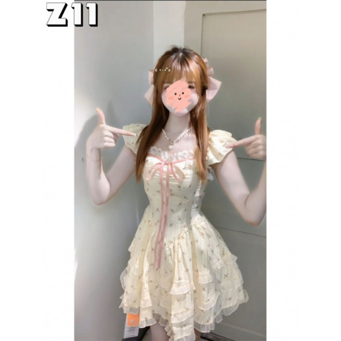 收腰顯瘦法式蝴蝶結綁帶公主蛋糕短裙女春季小飛袖碎花連衣裙