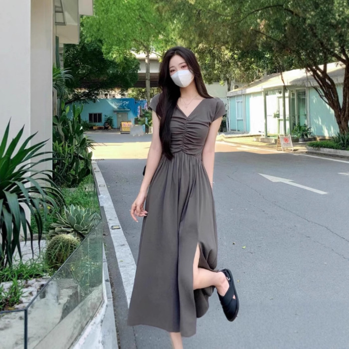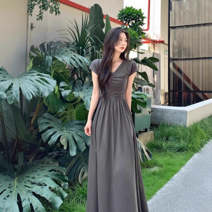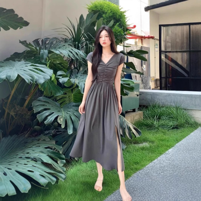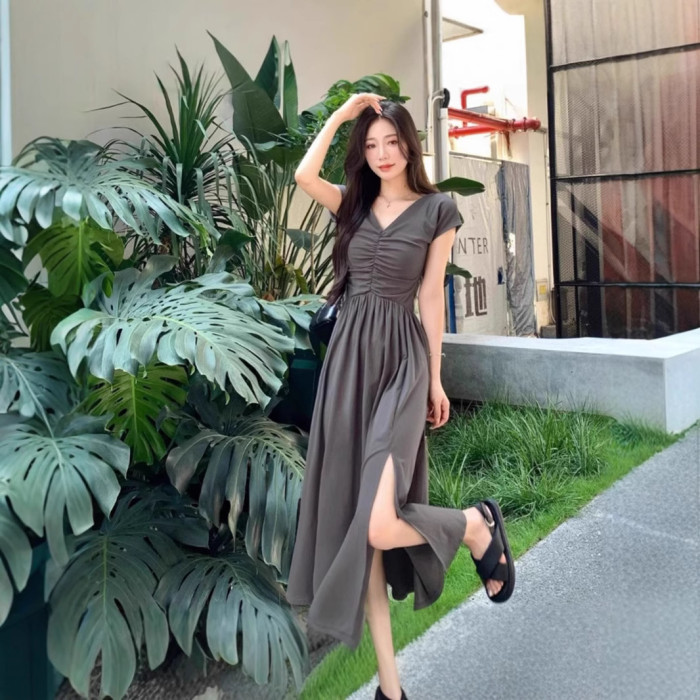復古赫本風V領收腰連衣裙夏茶歇法式高級感開叉長裙