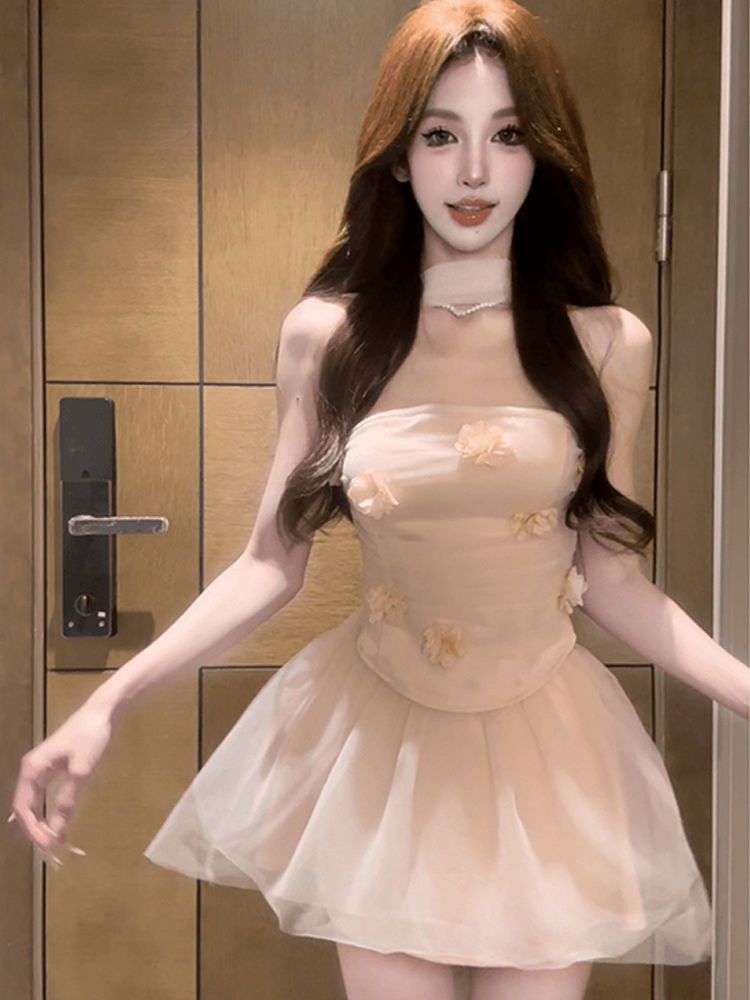 甜美立體花朵網紗性感抹胸背心上衣套裝夏季純欲辣妹半身裙兩件套