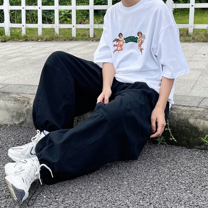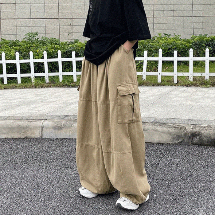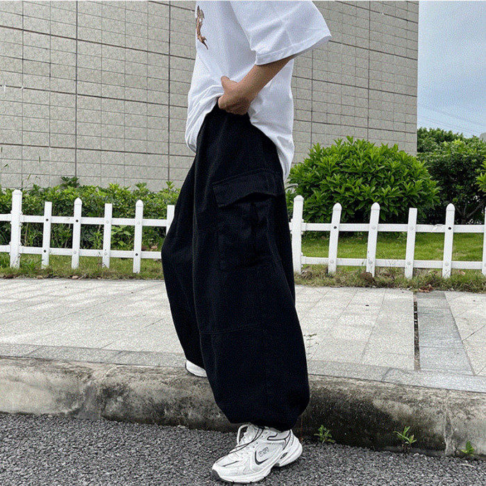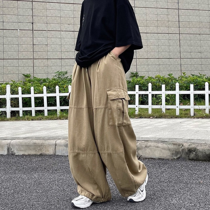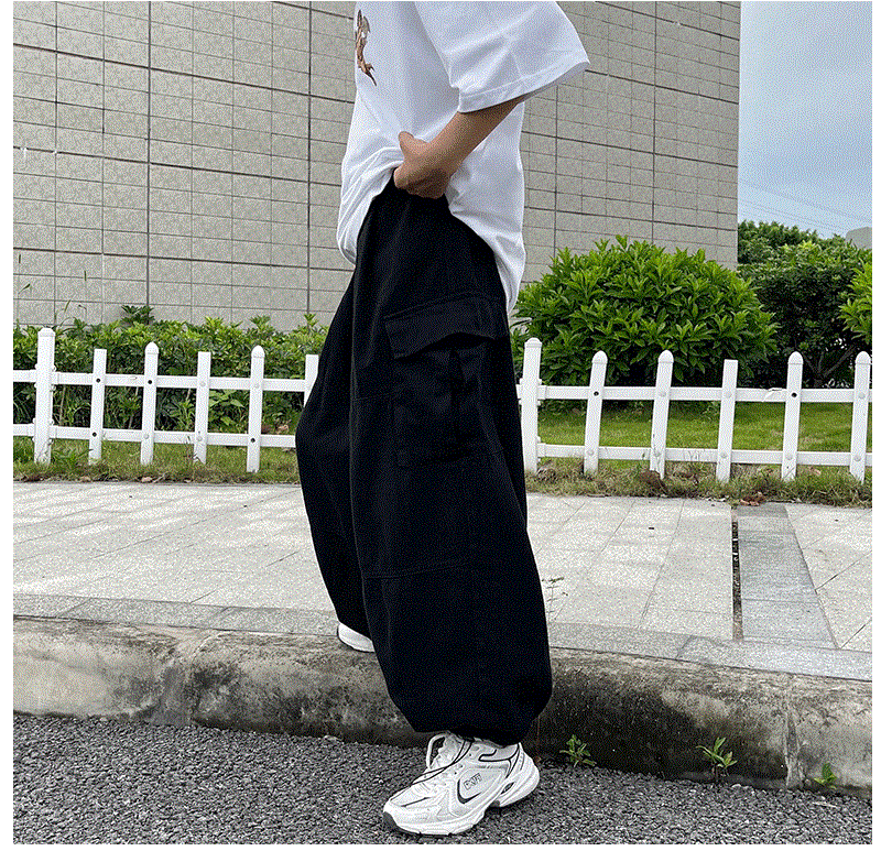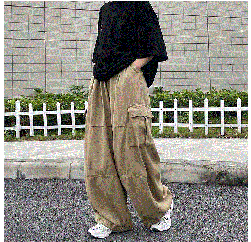 日系復古多口袋垂感工裝濶腿褲子男潮牌高街寬松直筒束腳燈籠長褲