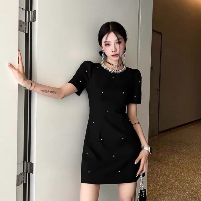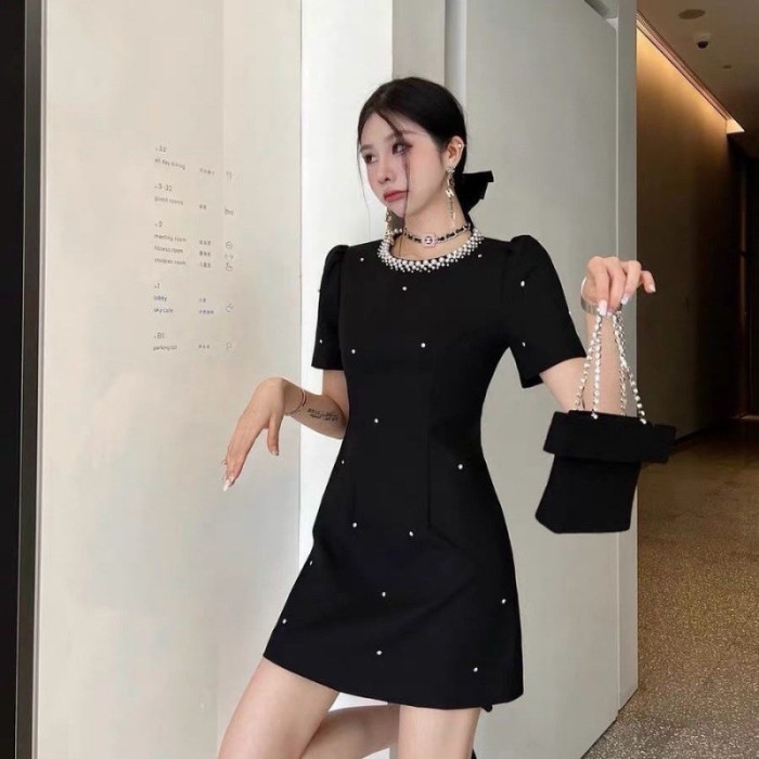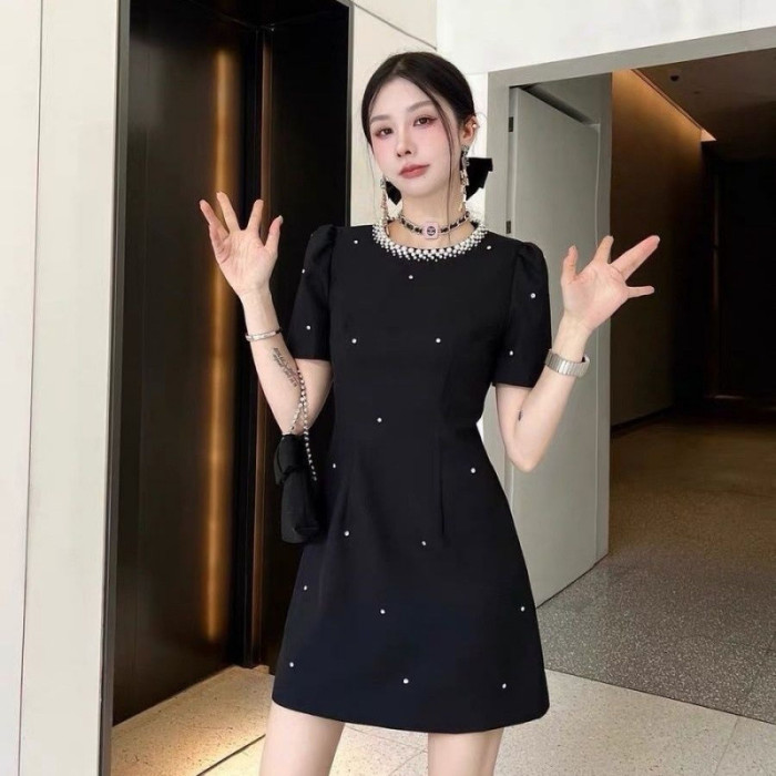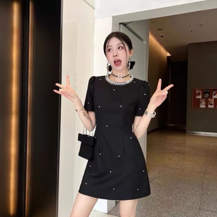 2025新款重工鑲鑽收腰A字擺黑色連衣裙甜美高級感小香風晚禮服女