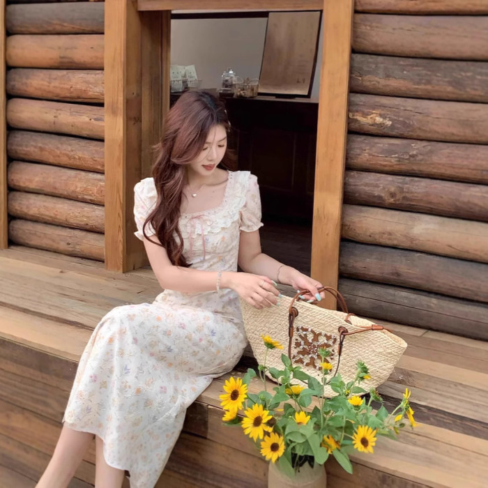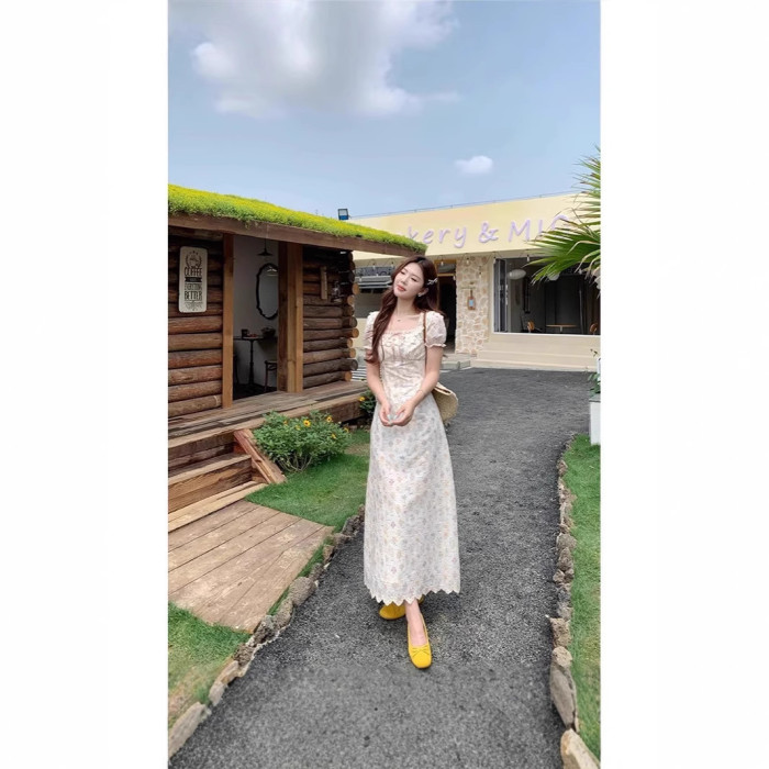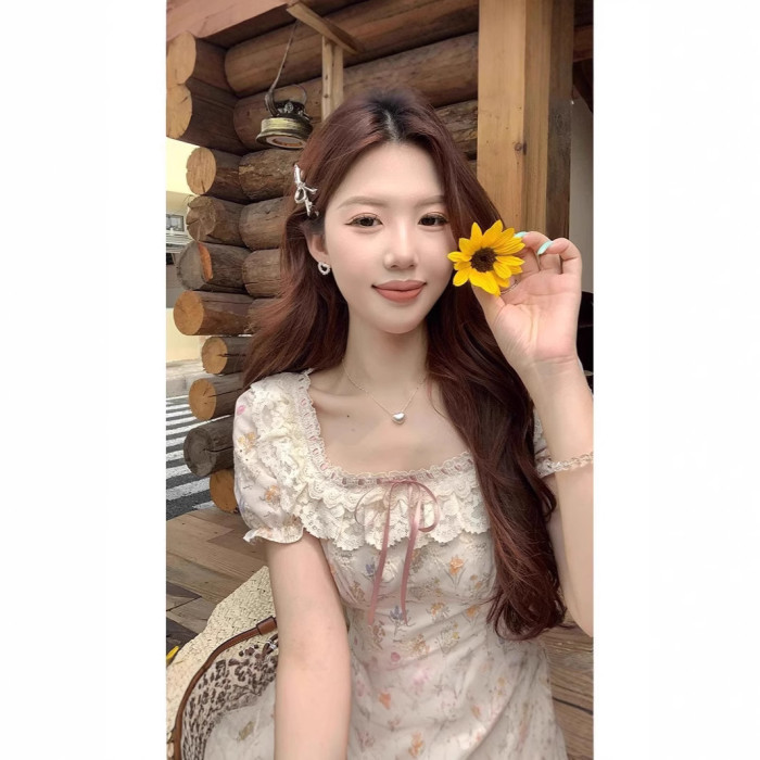方領印花連衣裙女夏季2025新款收腰顯瘦長裙