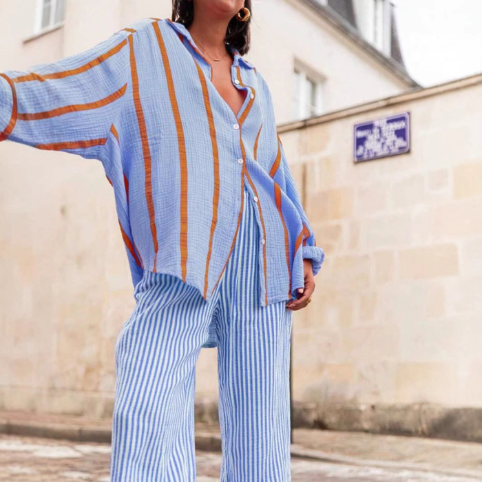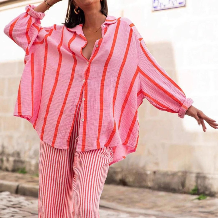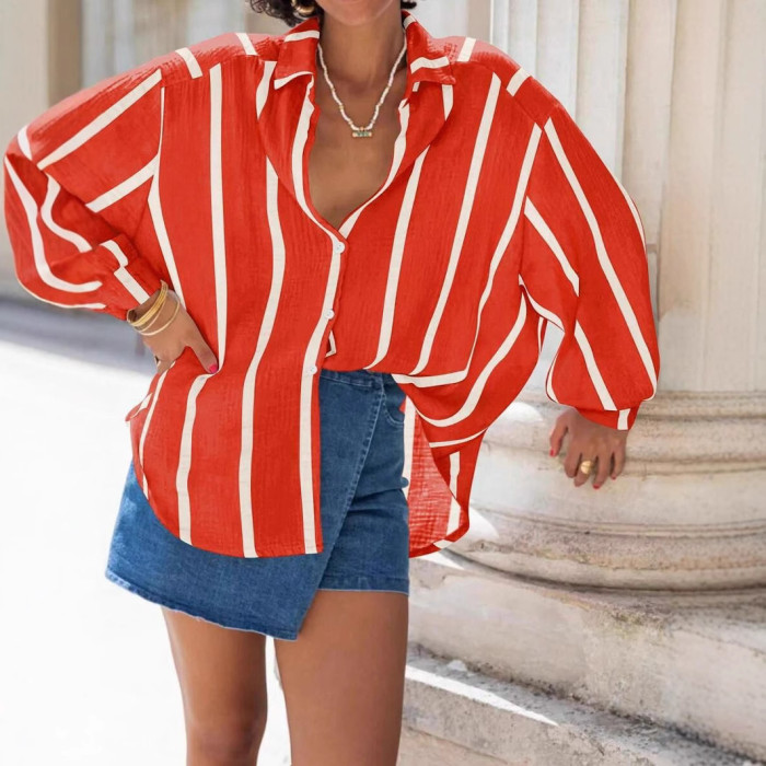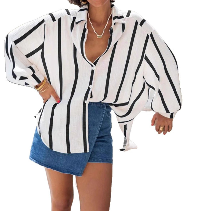 2025歐美獨立站秋冬新款長袖紐釦開衫女條紋襯衫女裝