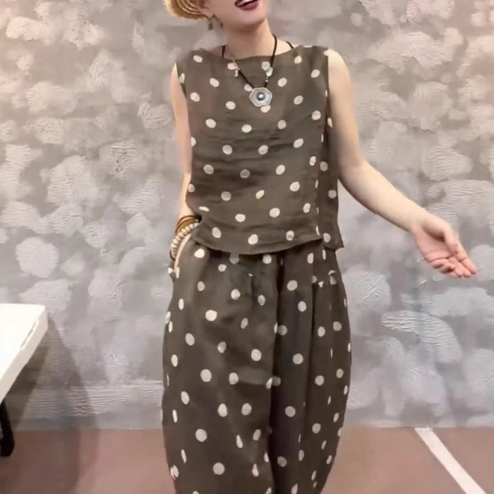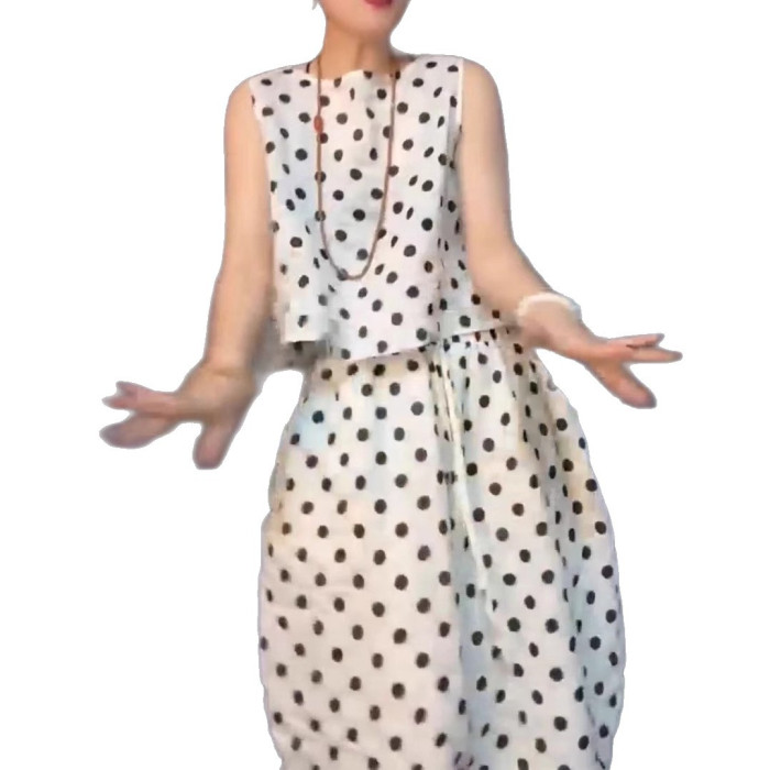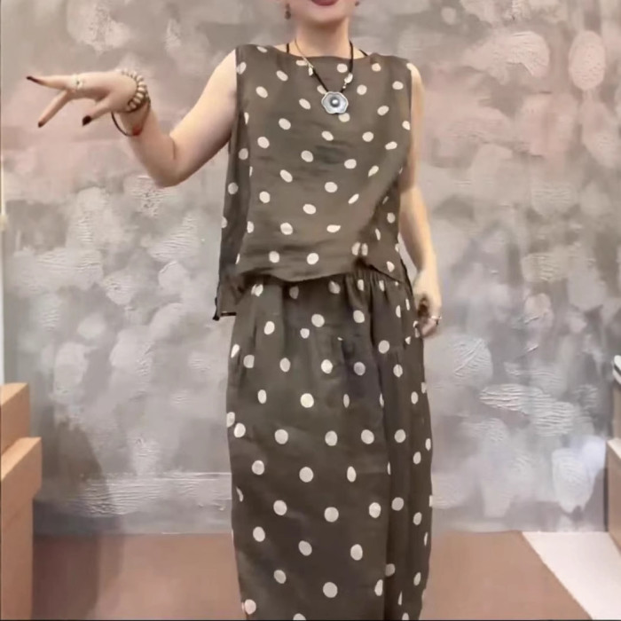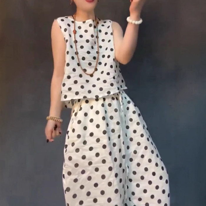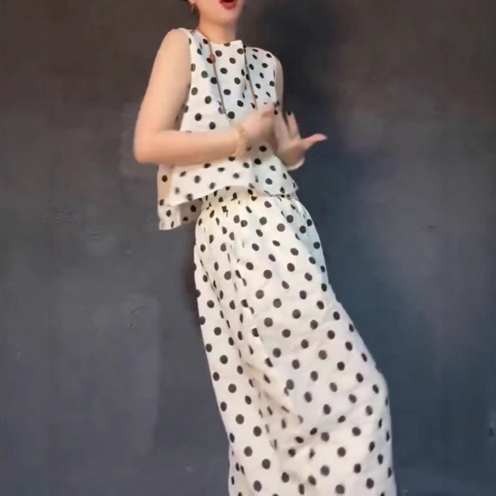 25738新大愛美依緣2025夏季新款韓版無袖減齡波點上衣濶腿褲套裝