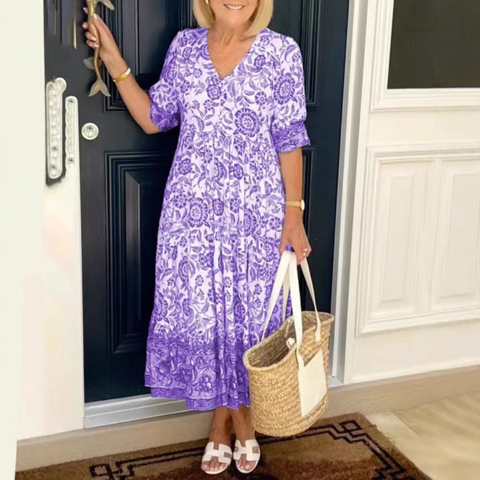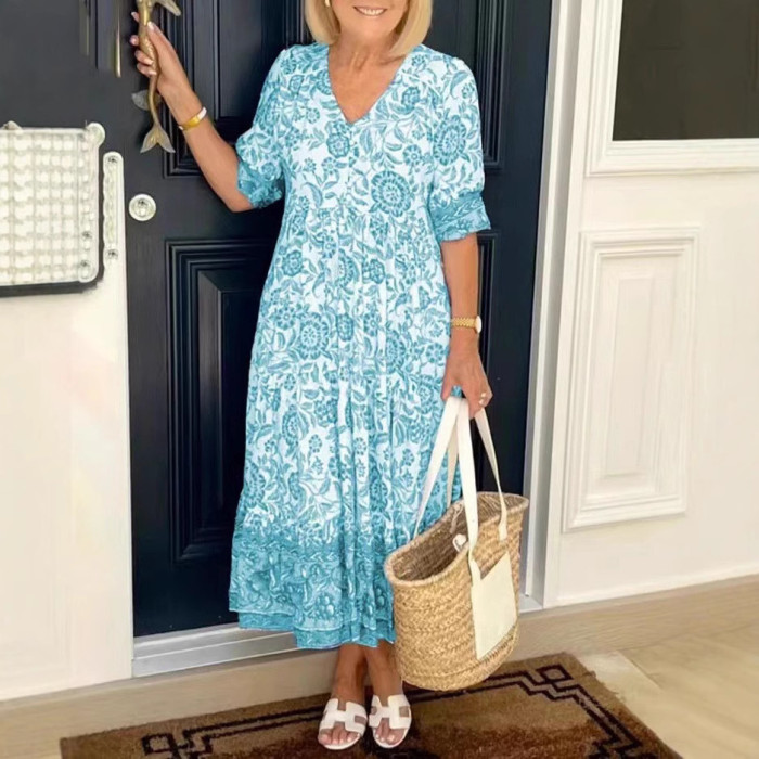 2025夏氣質通勤長款碎花紥染印花連衣裙