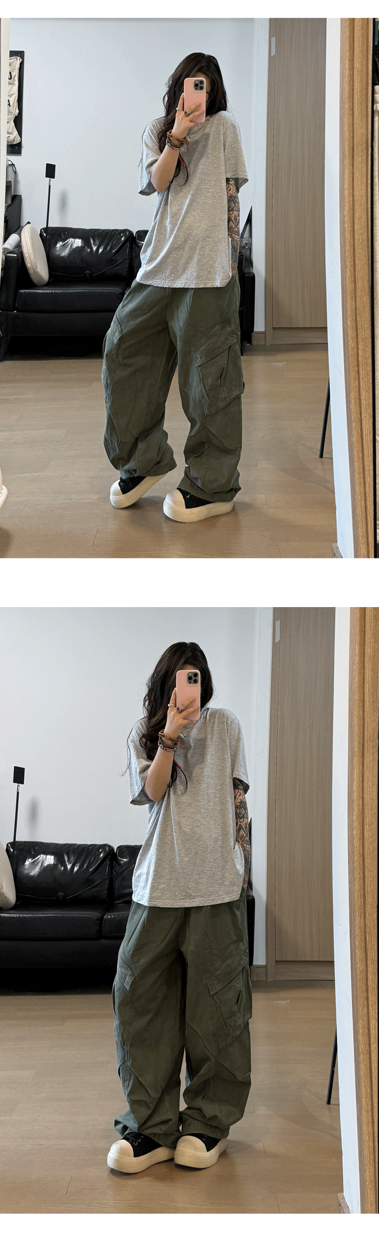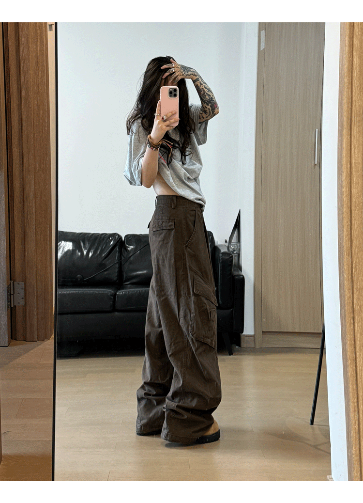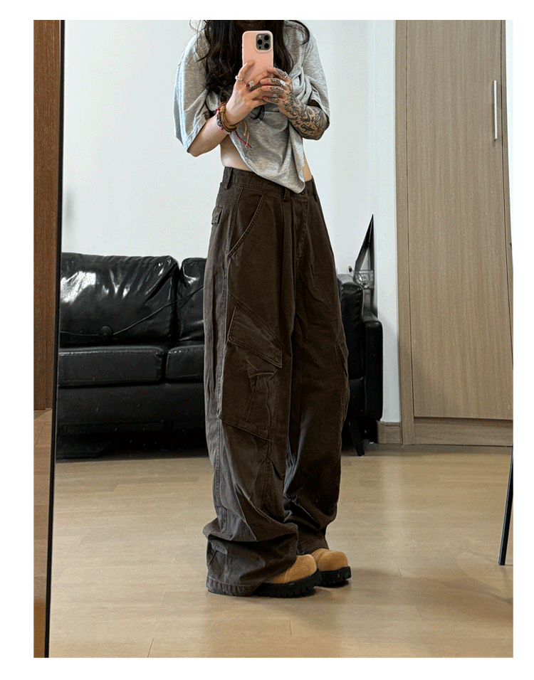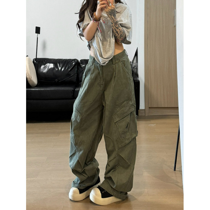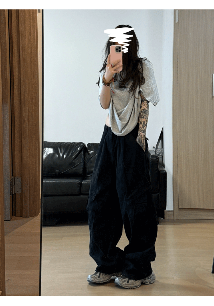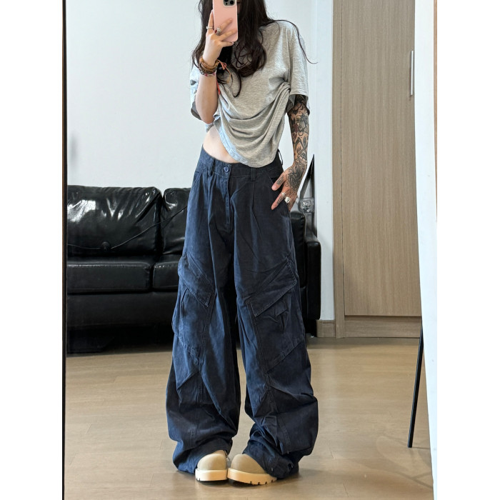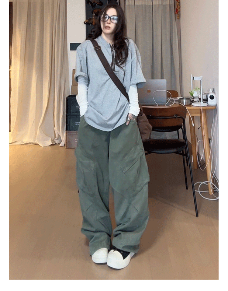 KUBU美式復古工裝褲oversize大口袋百搭濶腿褲男女夏季薄款繖兵褲