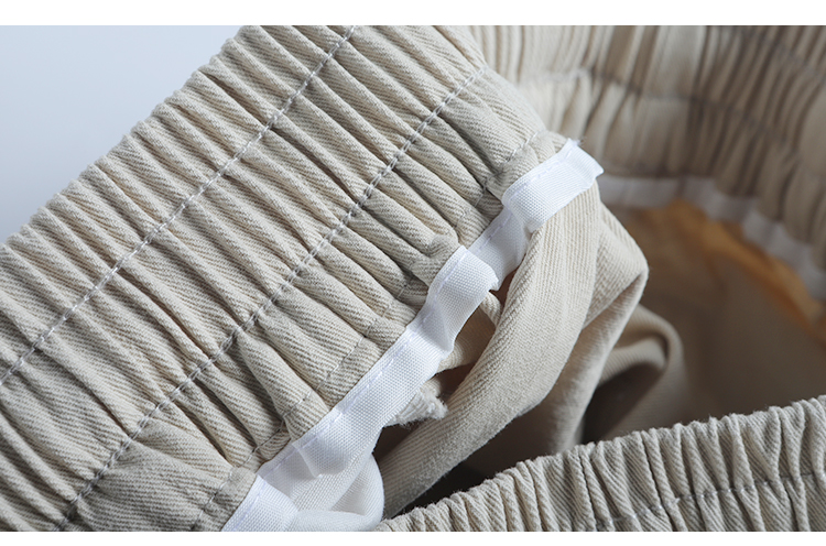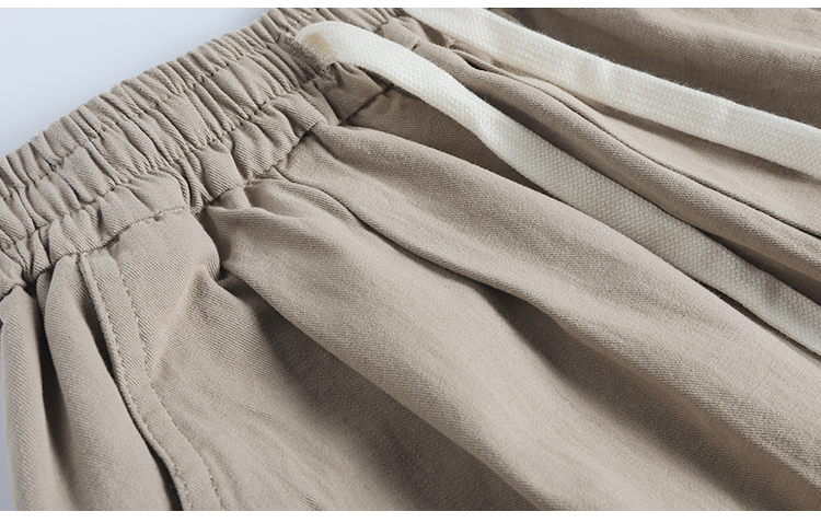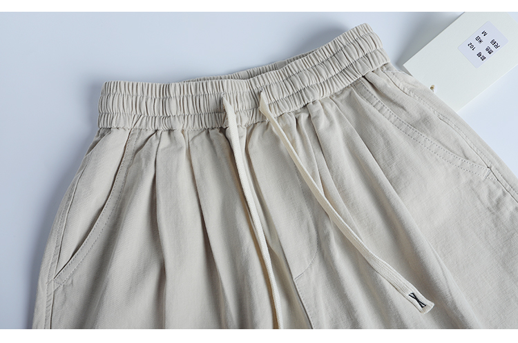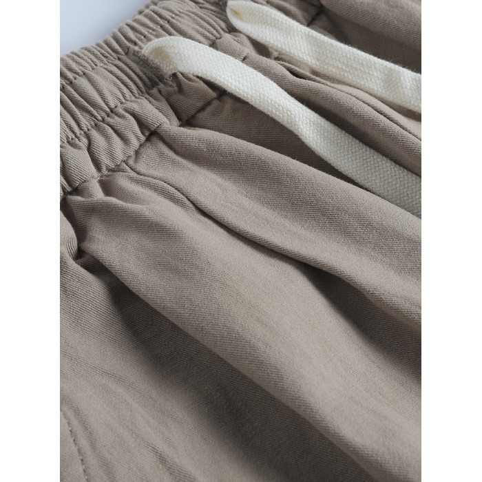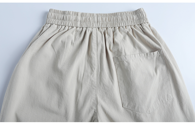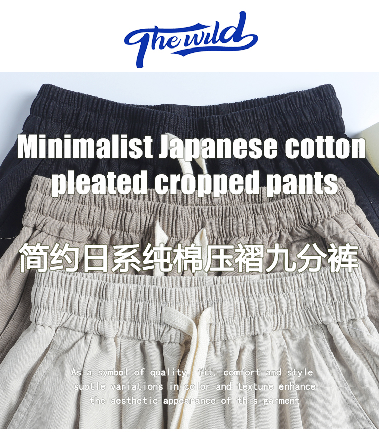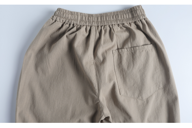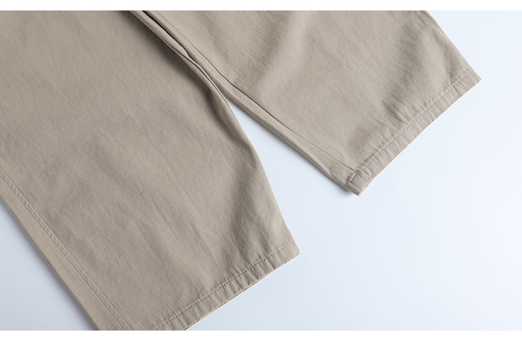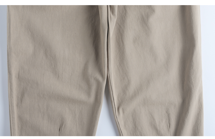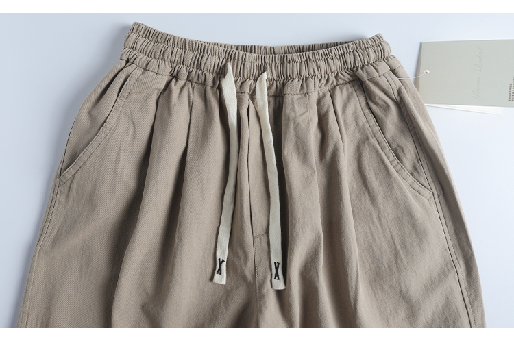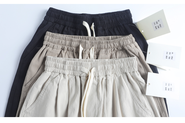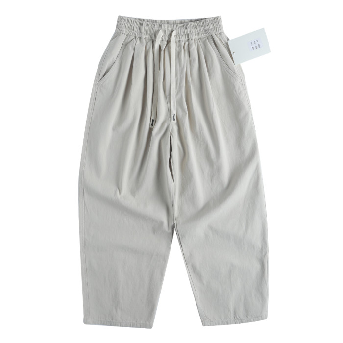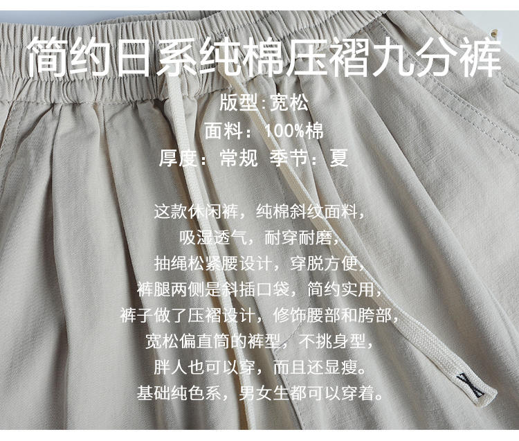 春季日系復古褶皺純棉卡其色濶腿褲寬松純色透氣休閒九分褲蘿蔔褲