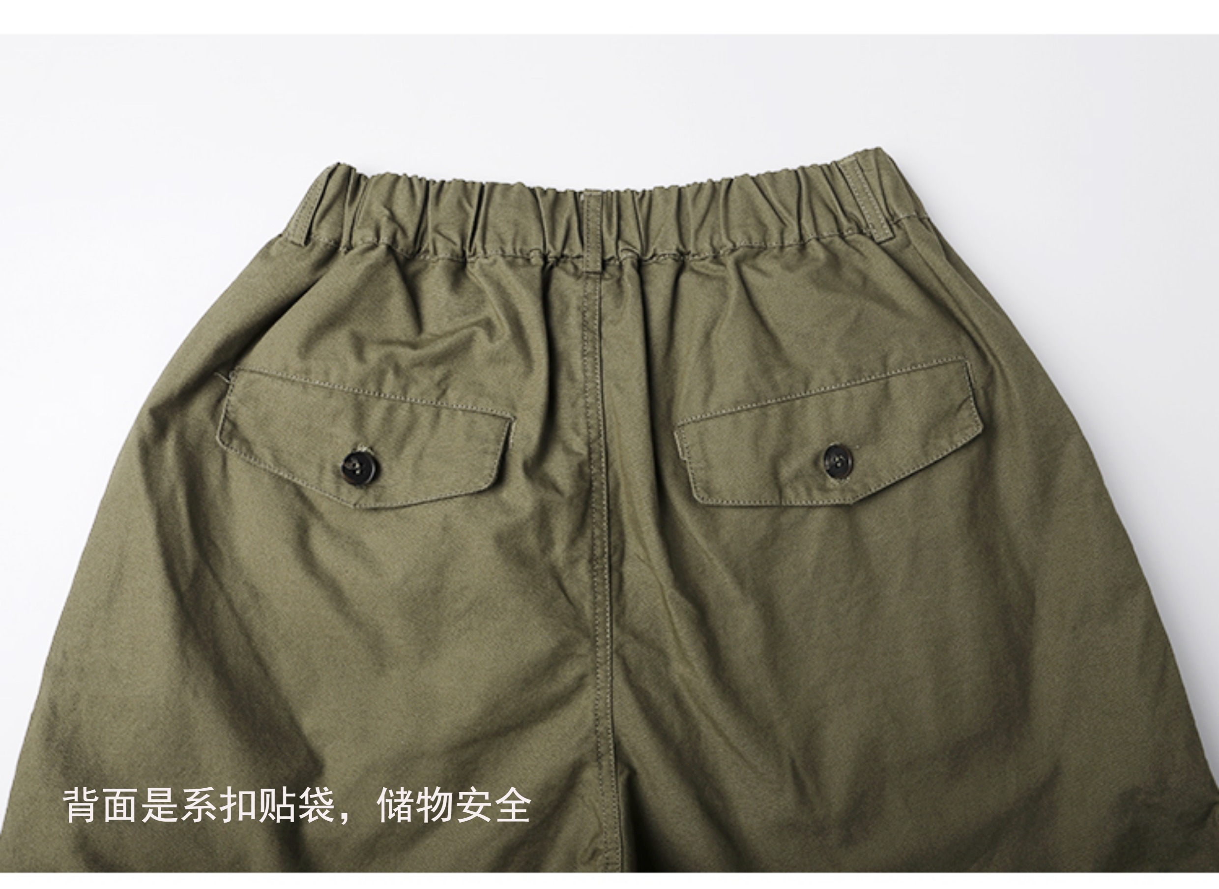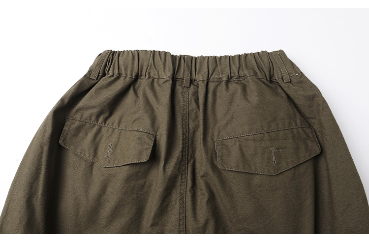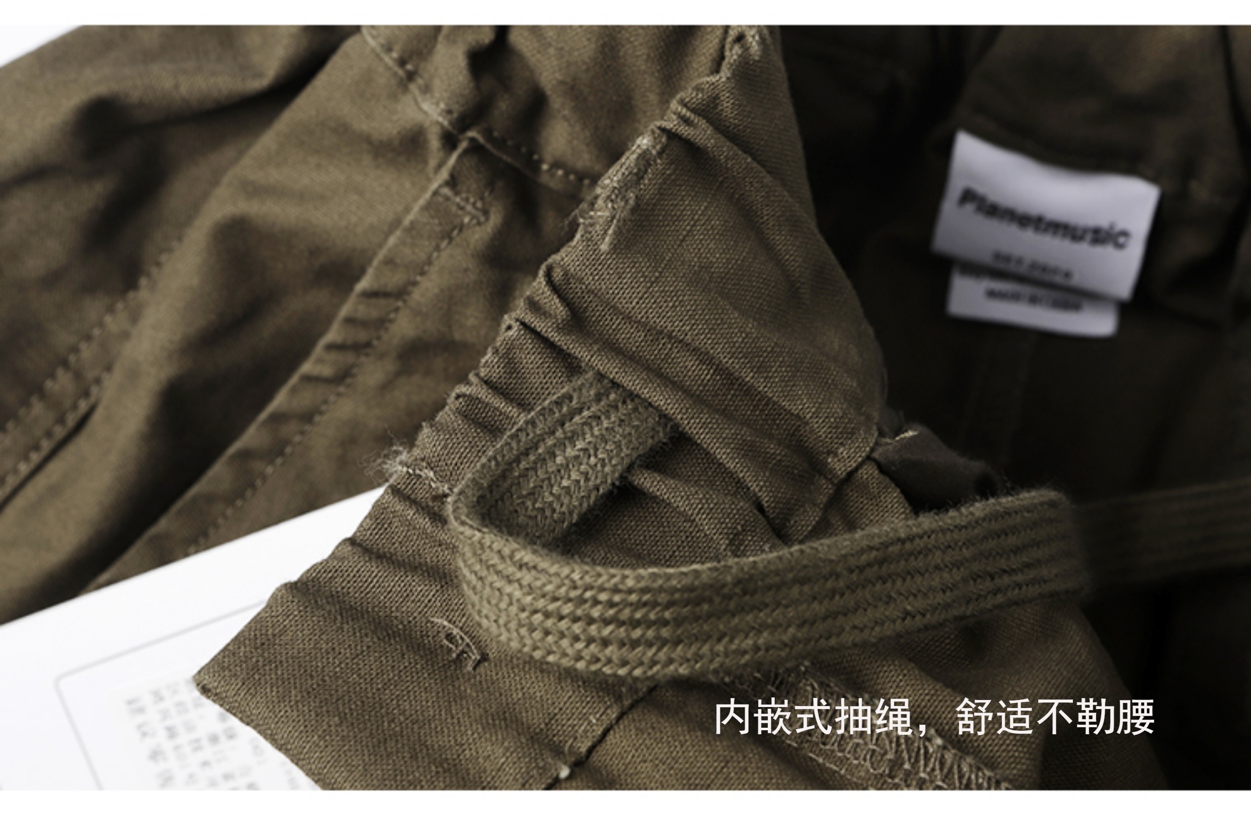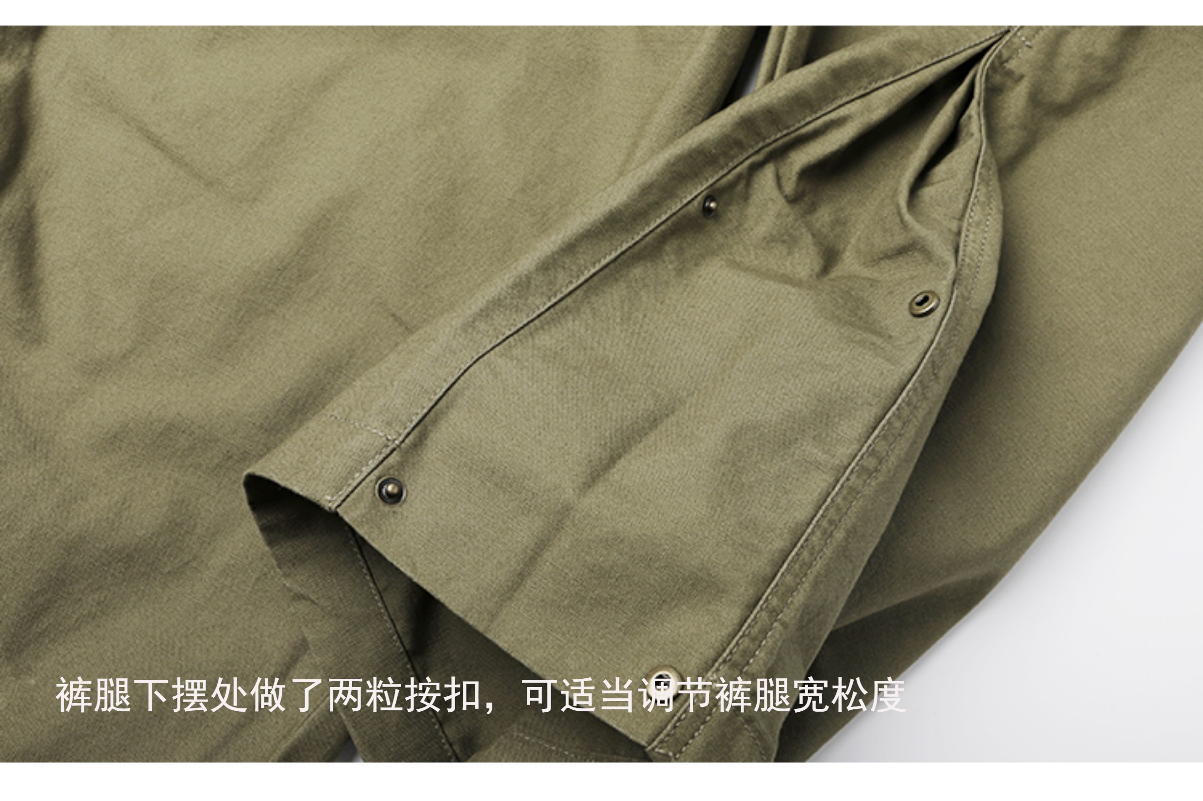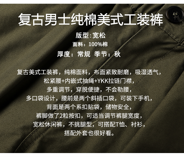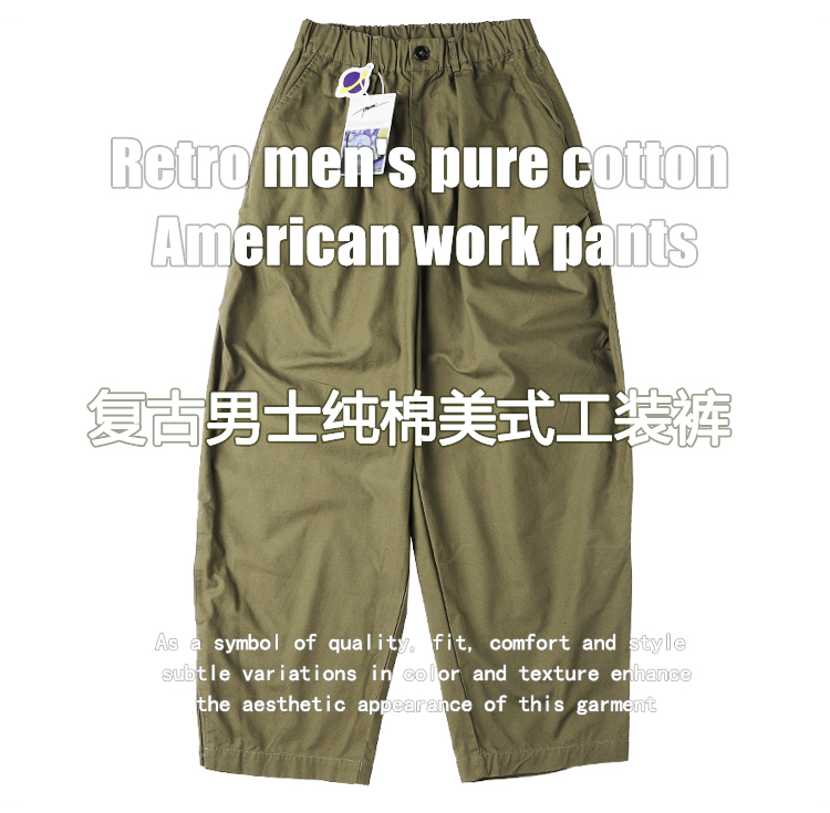 春季純棉美式復古工裝褲男抽繩松緊腰軍綠色濶腿褲寬松百搭長褲潮