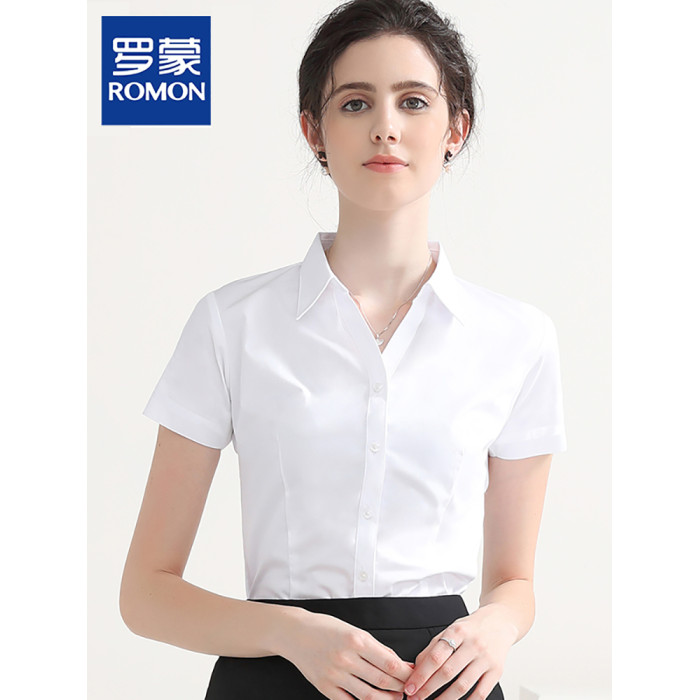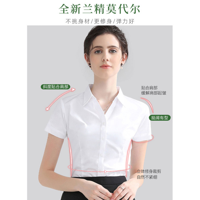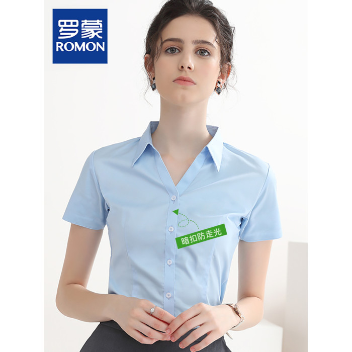 羅矇女士白色短袖襯衫夏季莫代爾職業正裝V領工作服免燙藍色襯衣