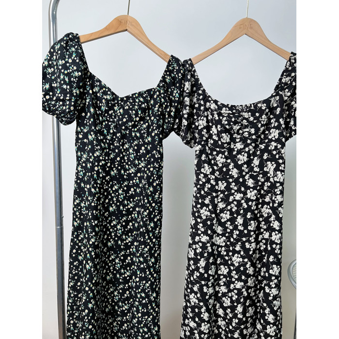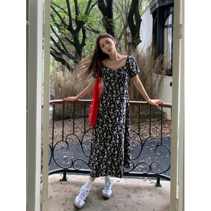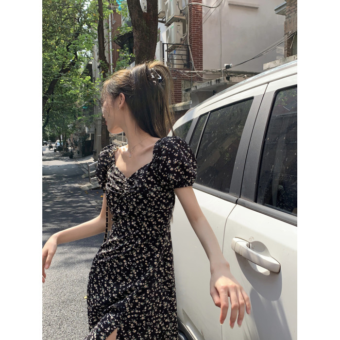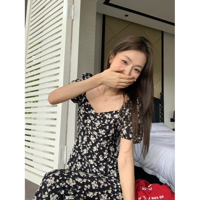 茶歇法式連衣裙女泡泡袖復古方領顯瘦碎花裙小黑裙夏季小個子裙子
