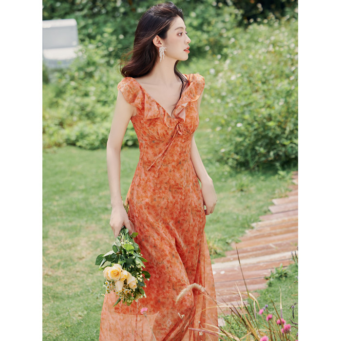 茶歇法式海邊度假雪紡碎花裙無袖收腰顯瘦荷葉邊V領橘色連衣裙夏