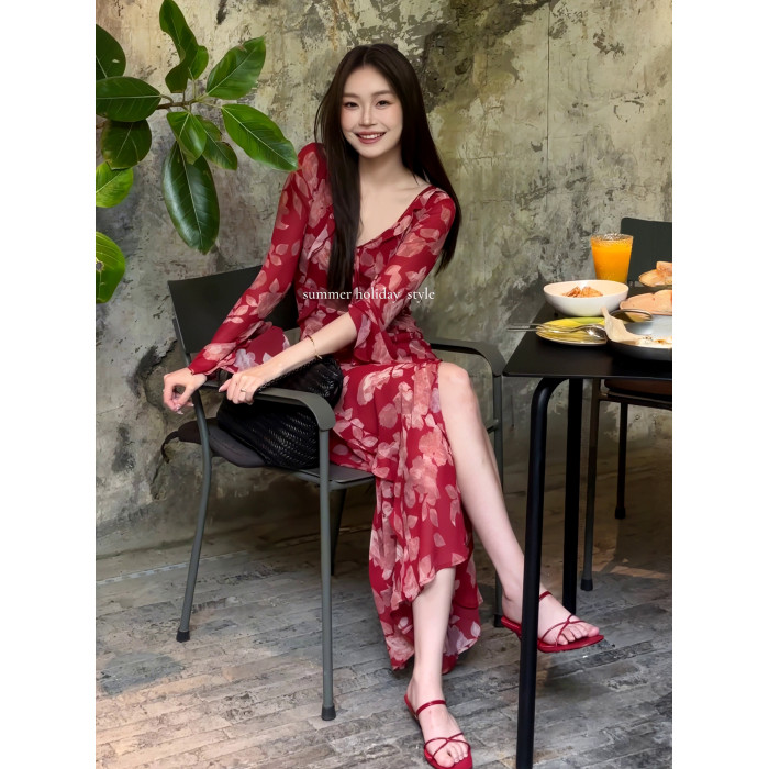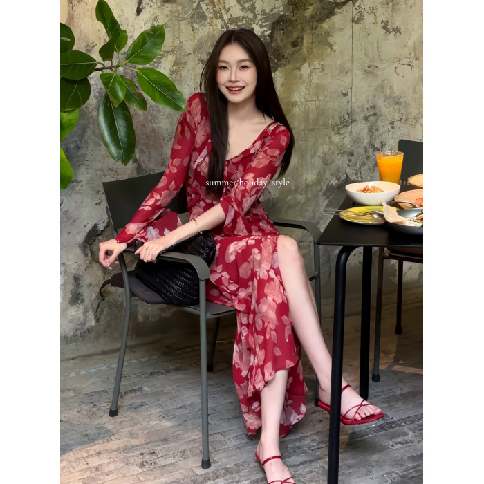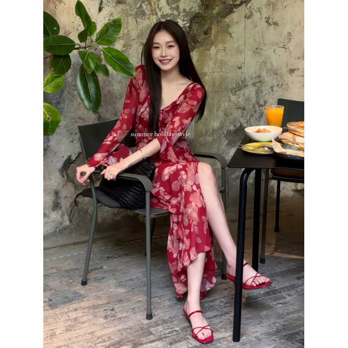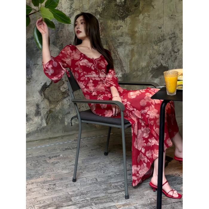 【漫野玫瑰】 法式荷葉邊輕松度假氛圍感吊帶開衩碎花裙連衣裙ins