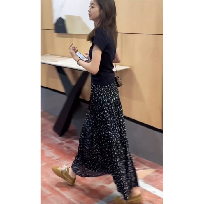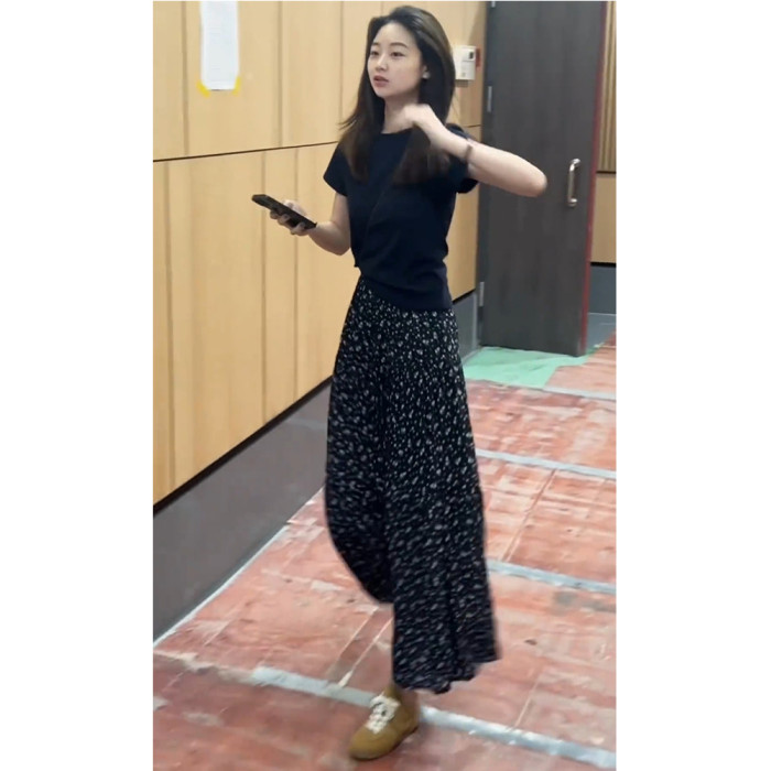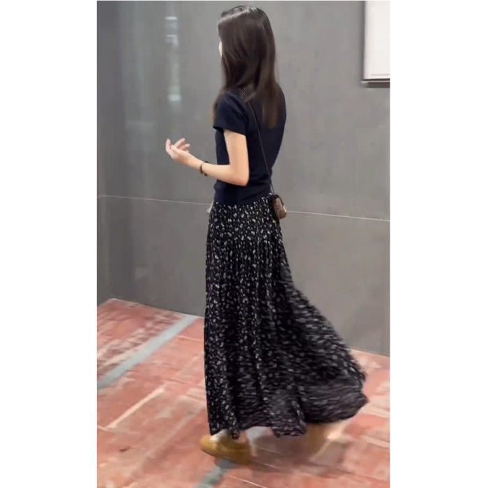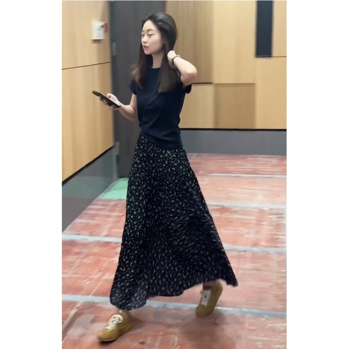 2025夏季超火小個子氣質系減齡藏青色T恤黑色碎花裙a字半身裙套裝