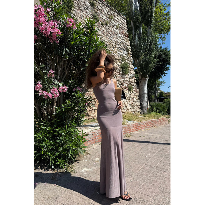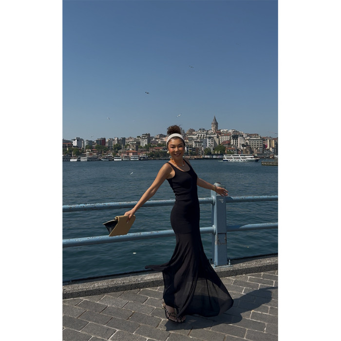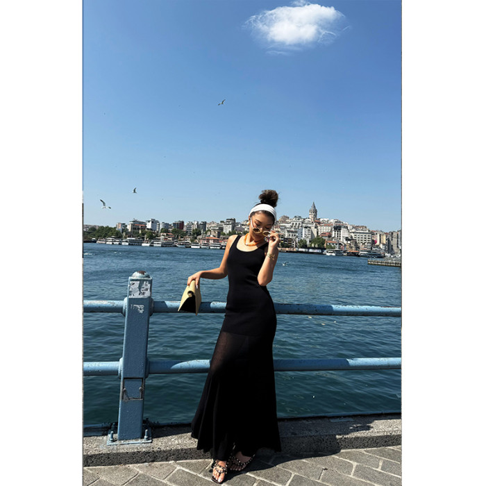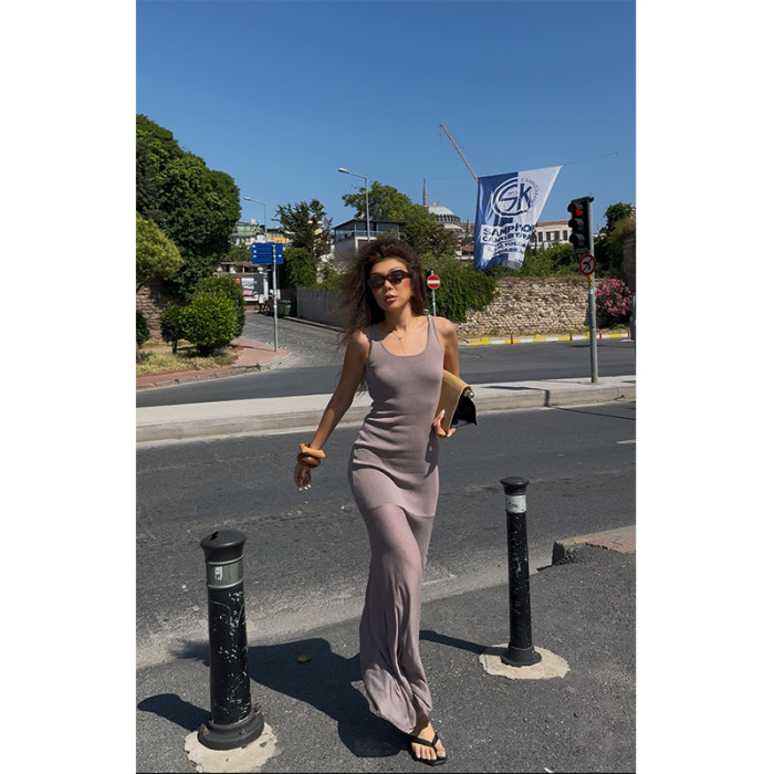 (小谿家)拼接透感網紗長款背心連衣裙度假風顯瘦氣質修身裙子