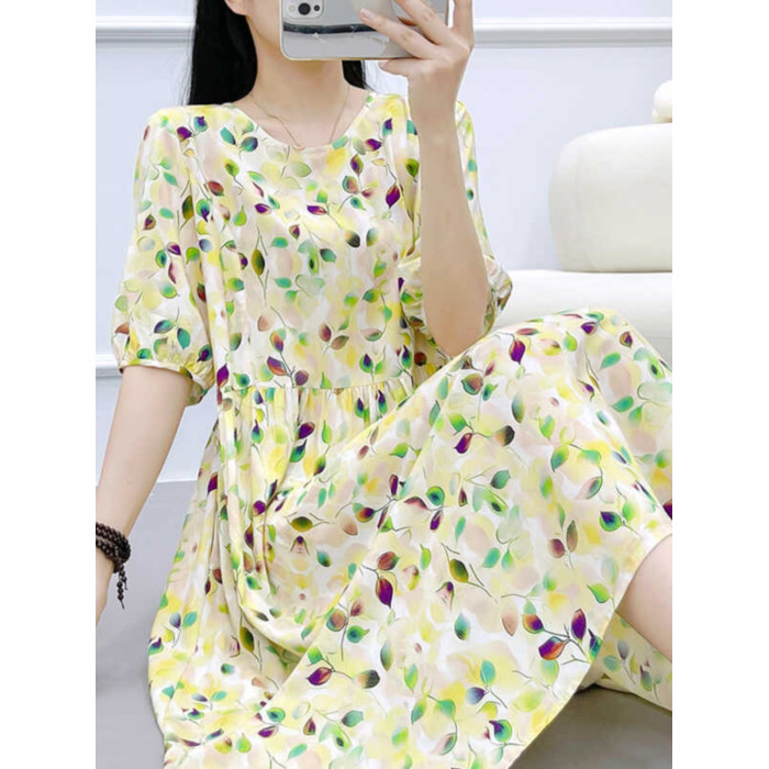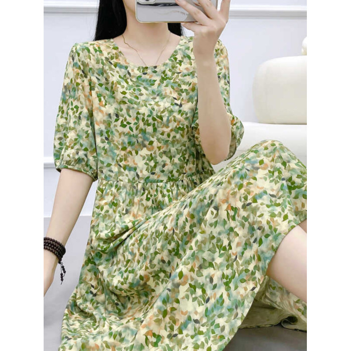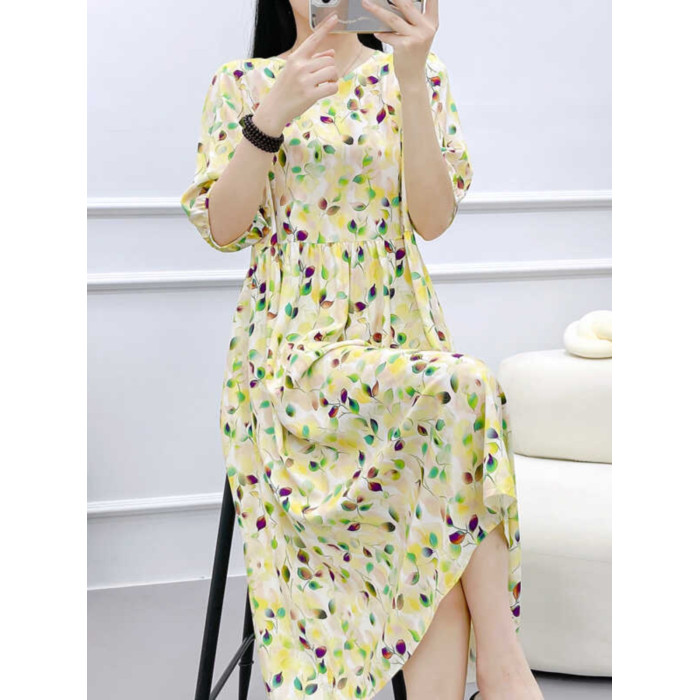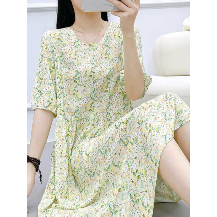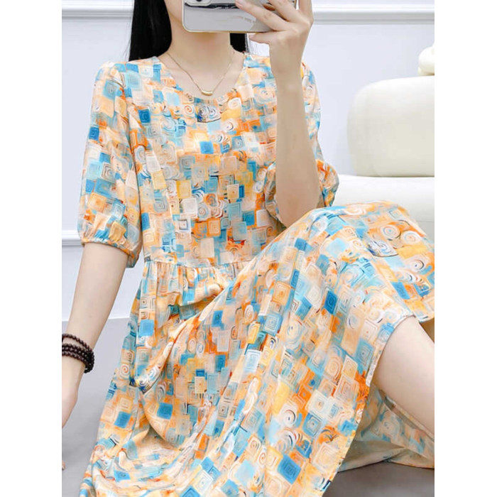 2025新款高級夏季棉綢連衣裙女中袖寬松氣質中長款人造棉外穿裙子