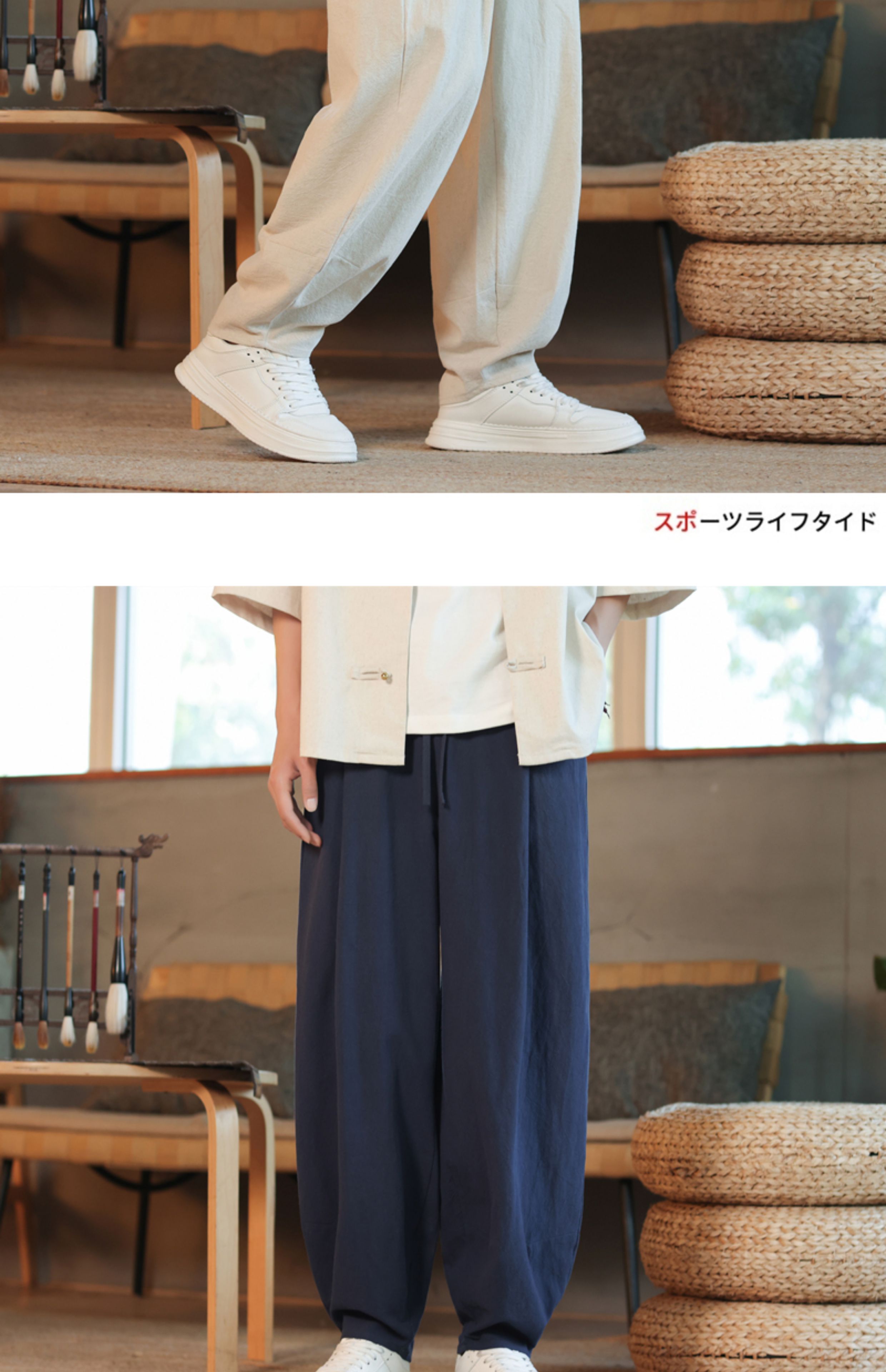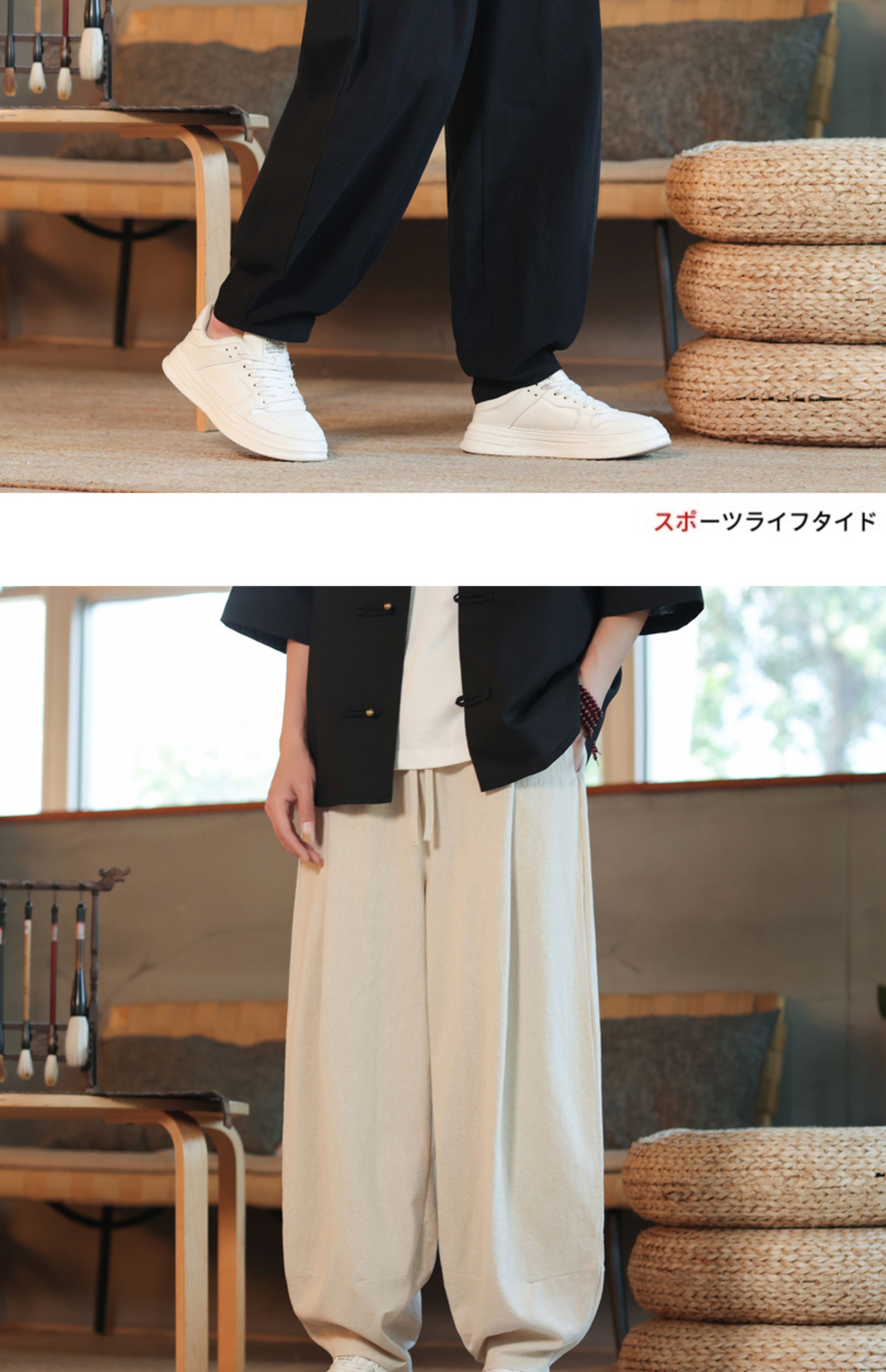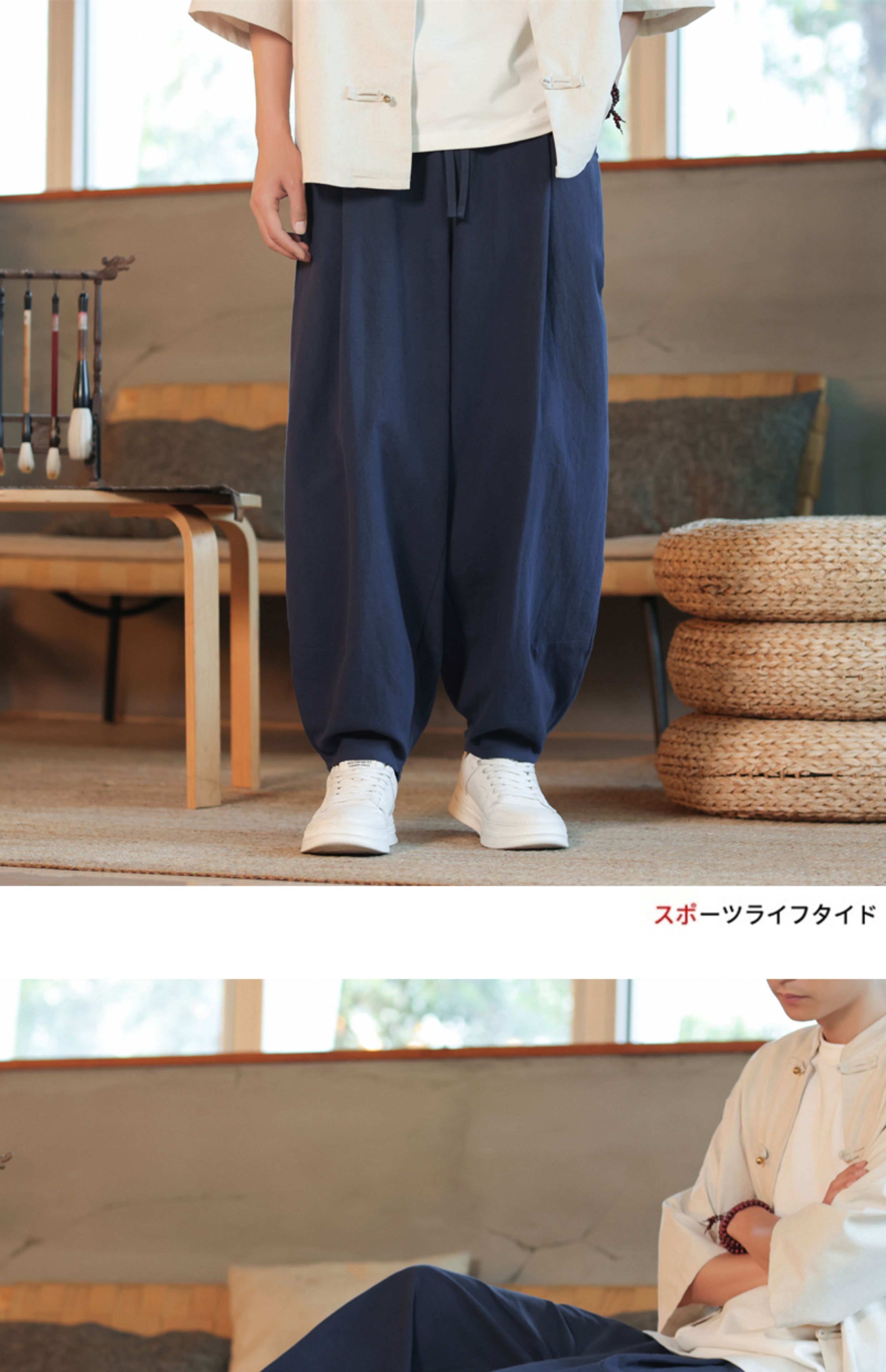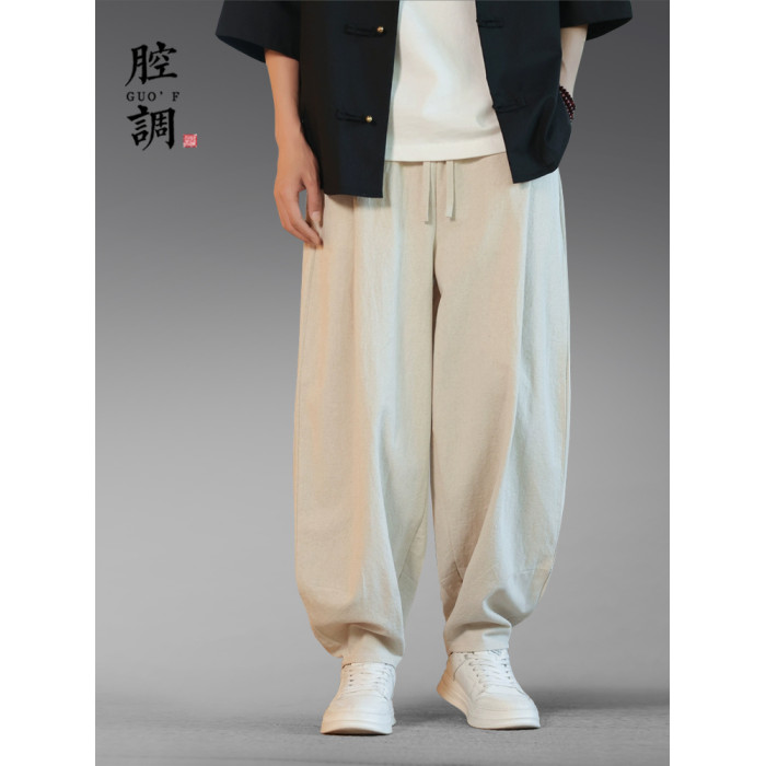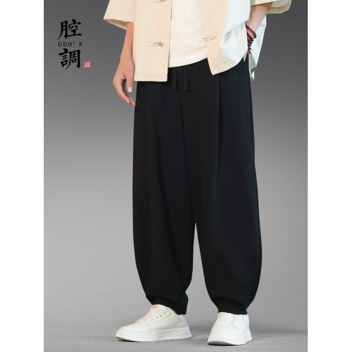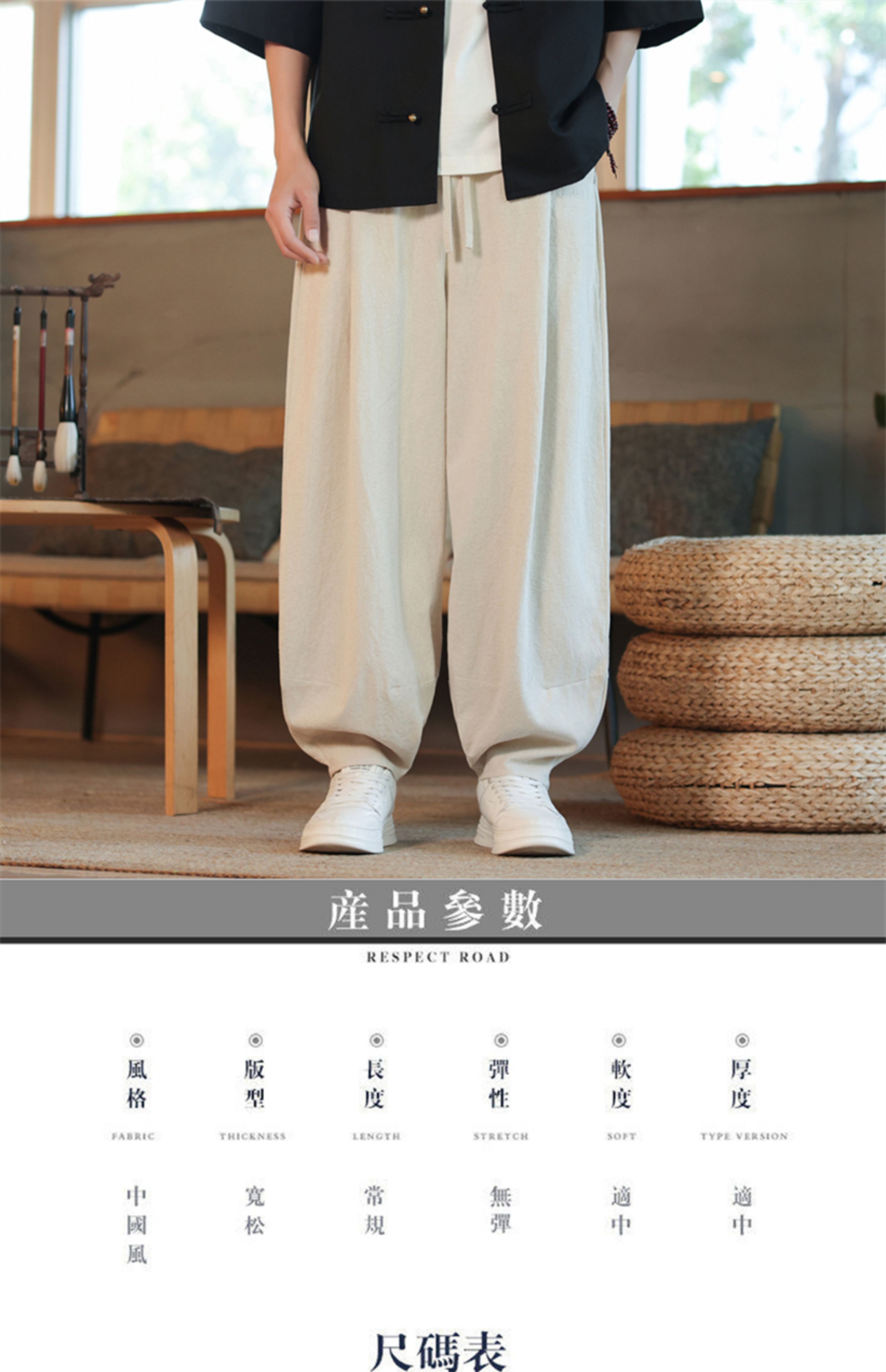 夏季中式休閒褲風男士純棉濶腿褲彎刀褲練功太極褲漢服燈籠褲