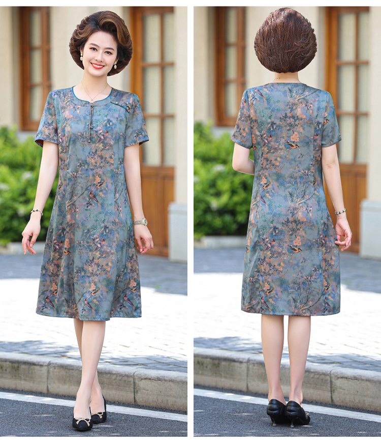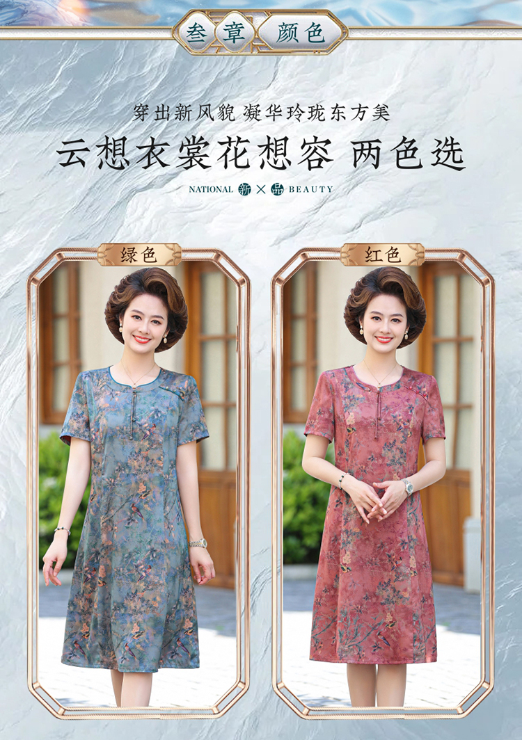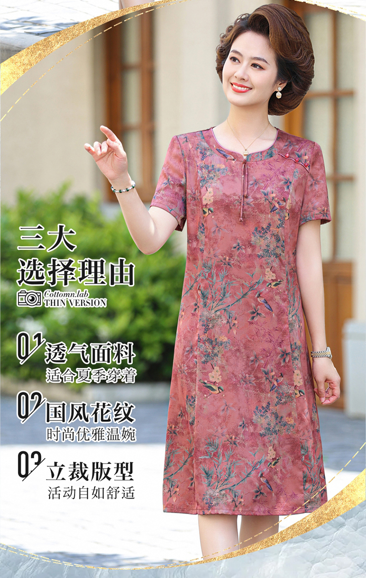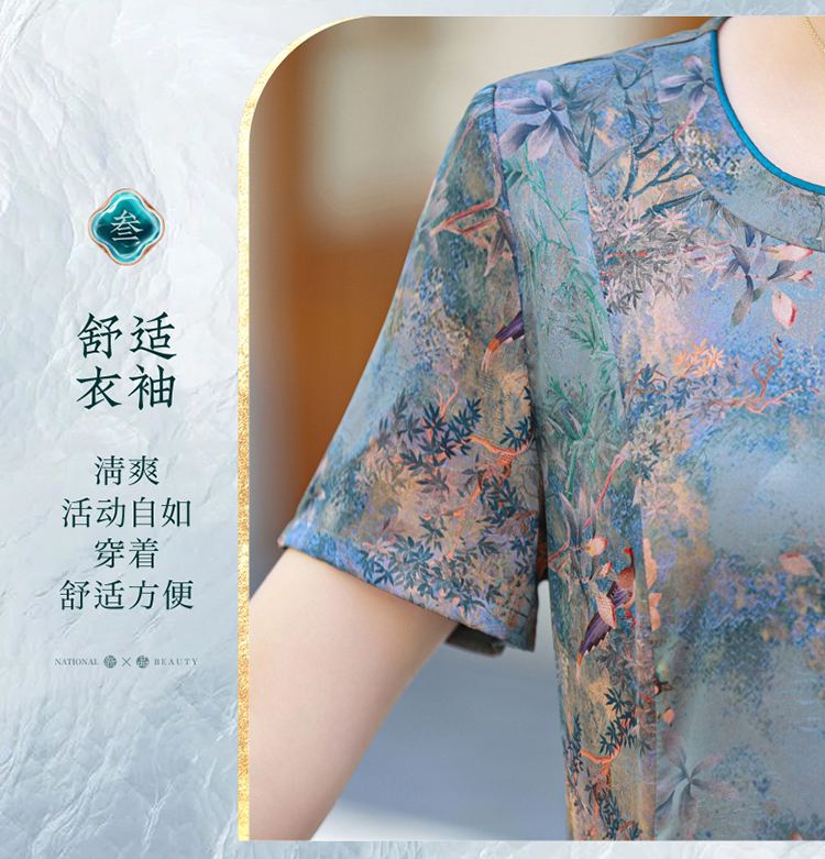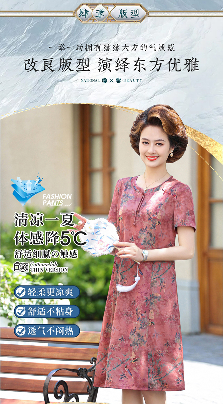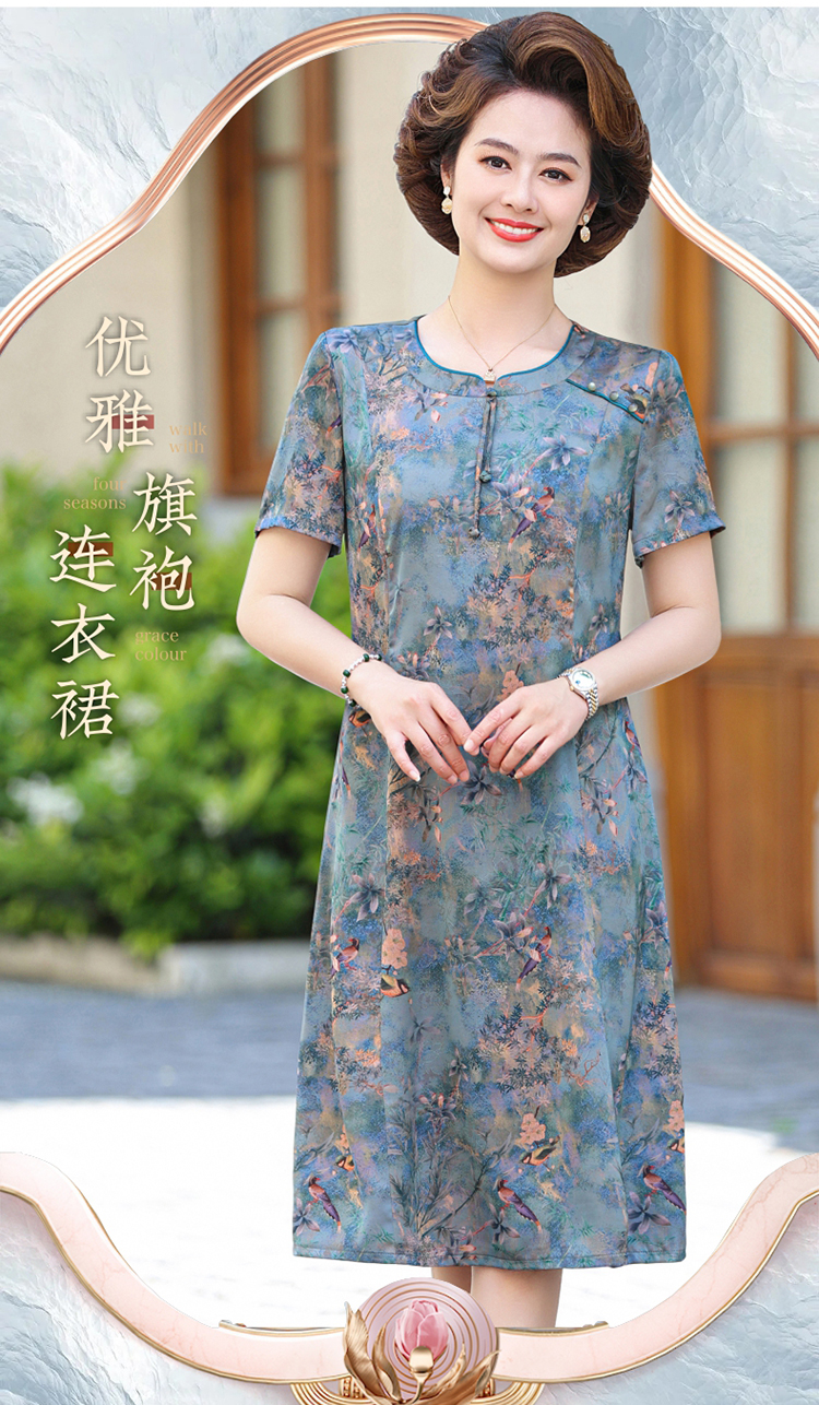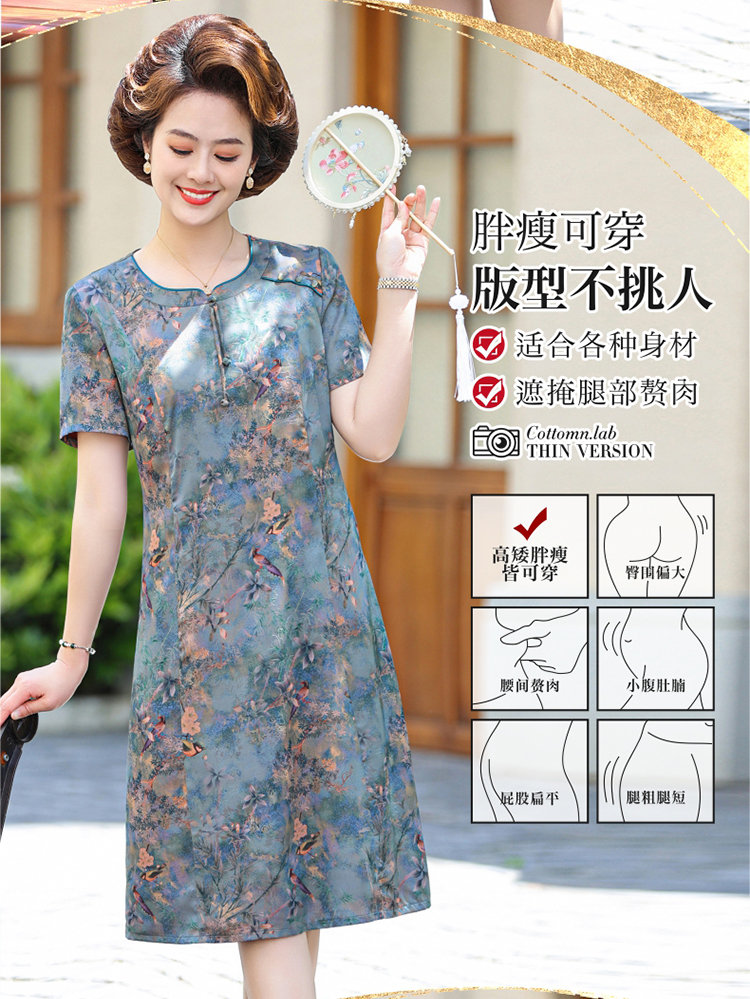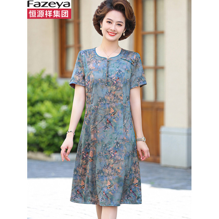 恒源祥集團彩羊中老年真絲連衣裙女夏季寬松媽媽裝薄款印花中長裙