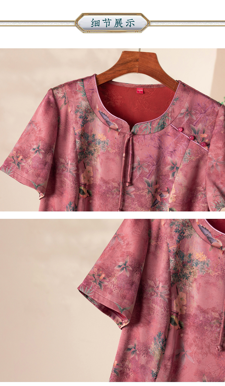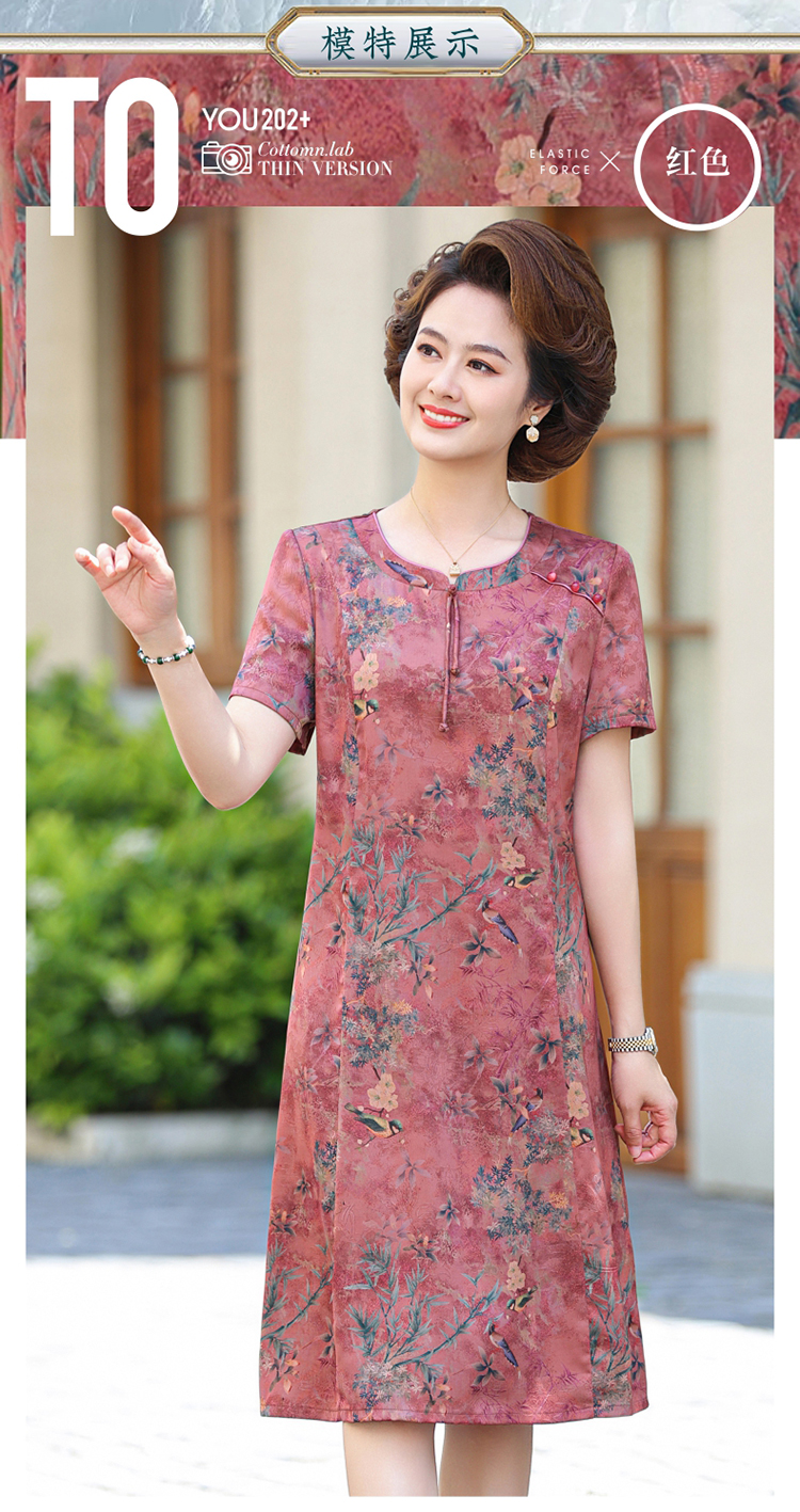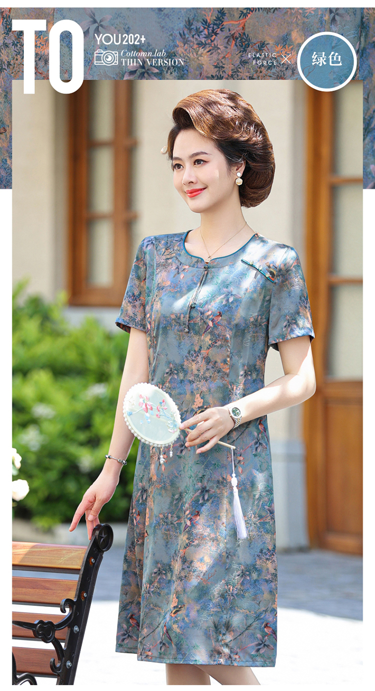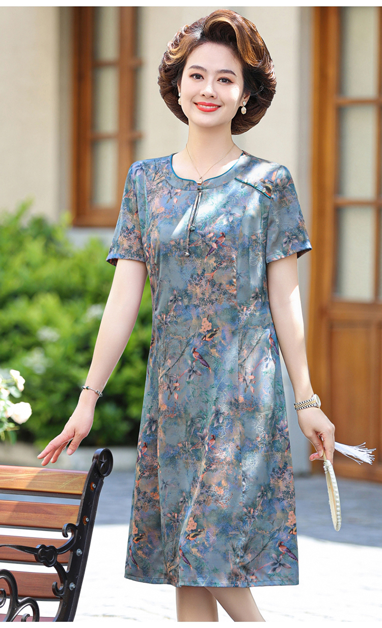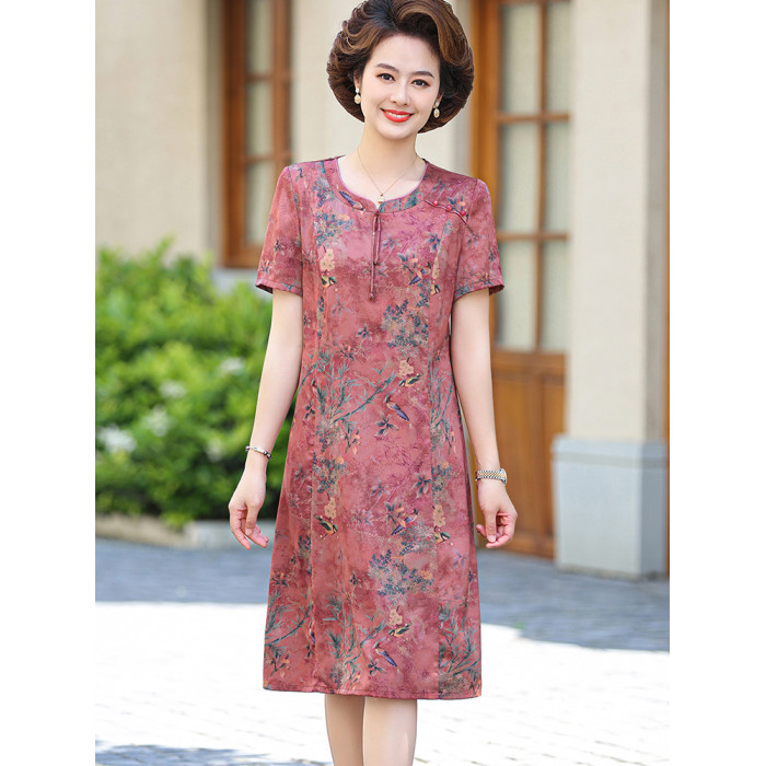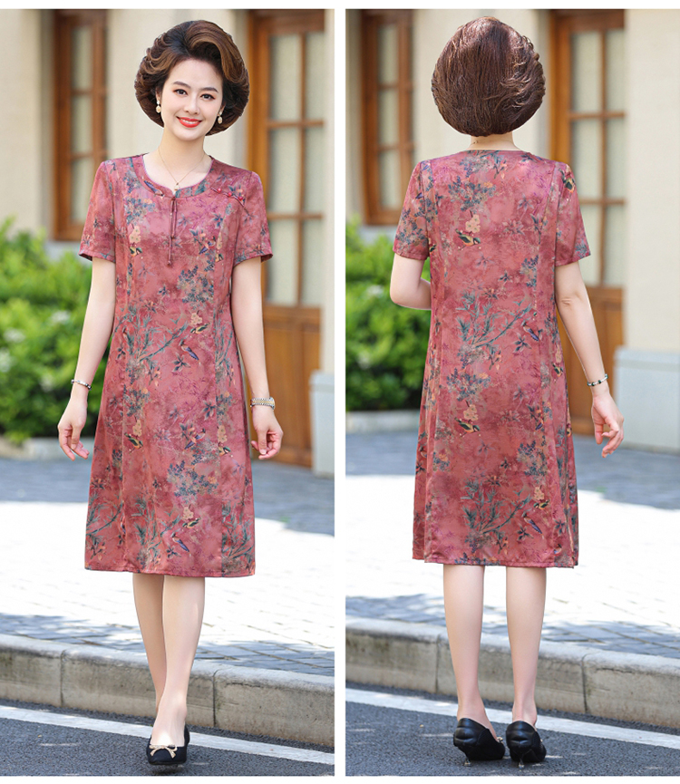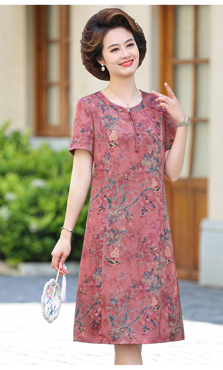 恒源祥集團彩羊中老年真絲連衣裙女夏季寬松媽媽裝薄款印花中長裙