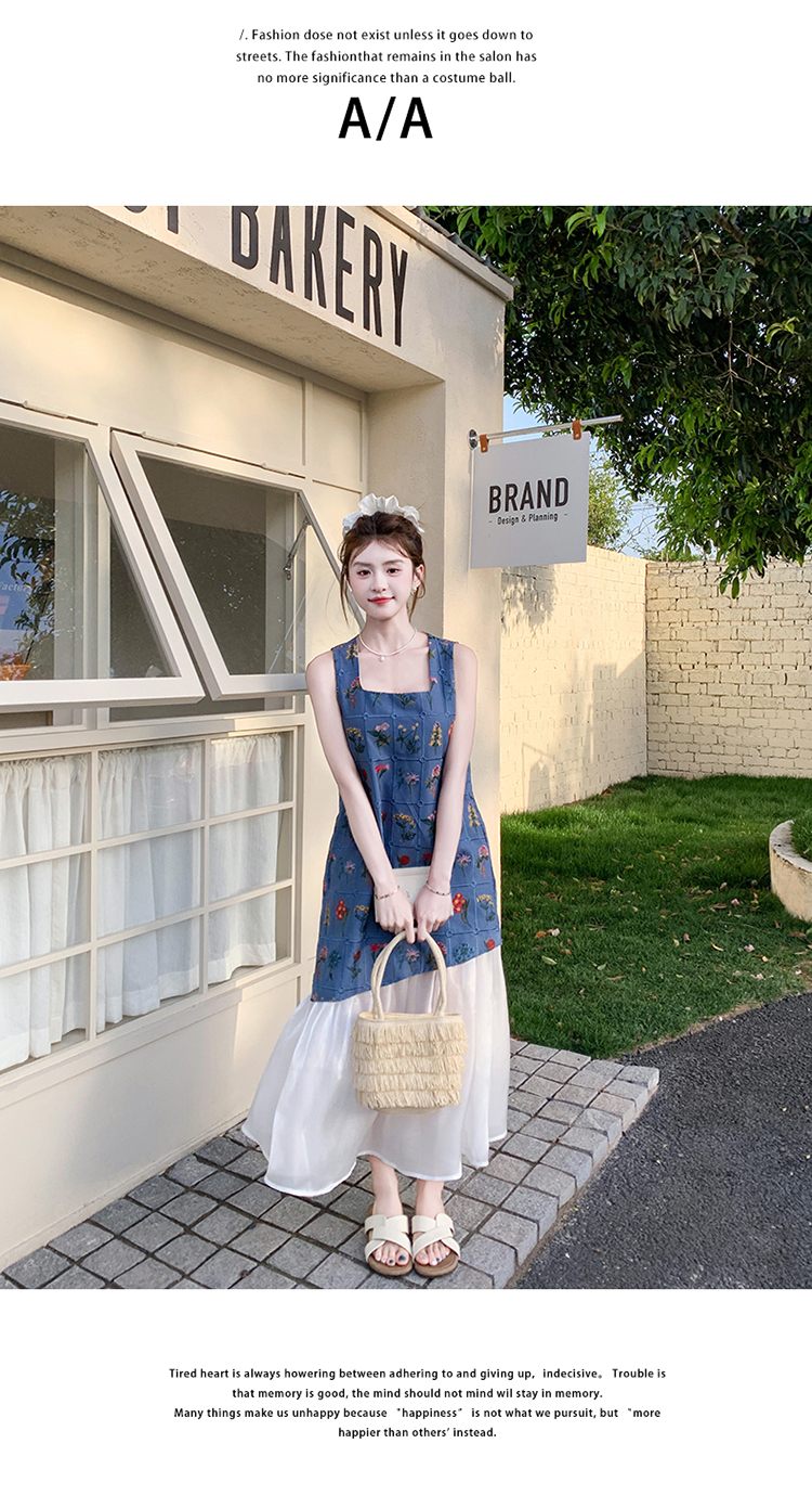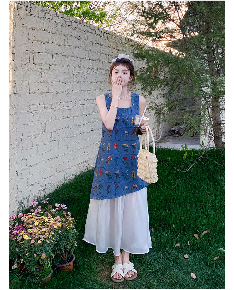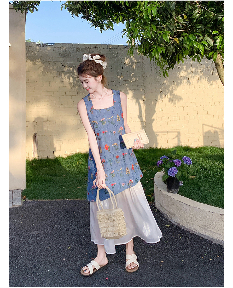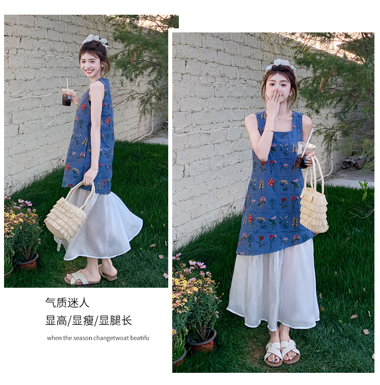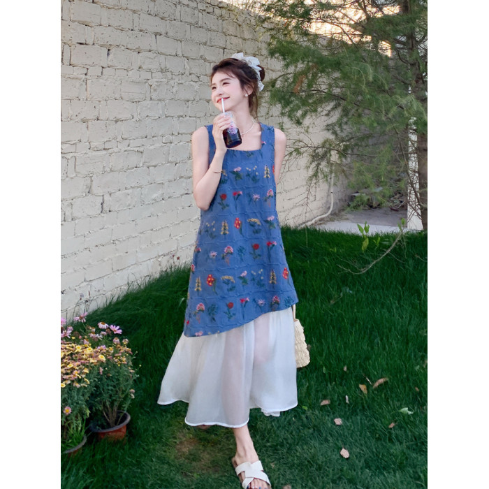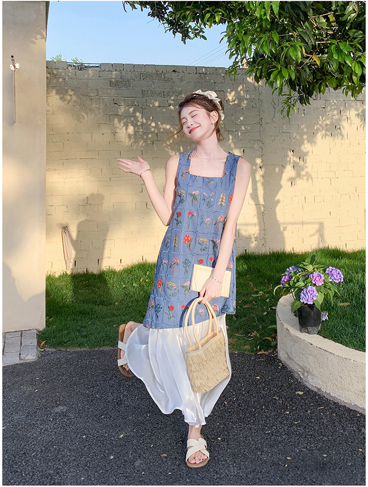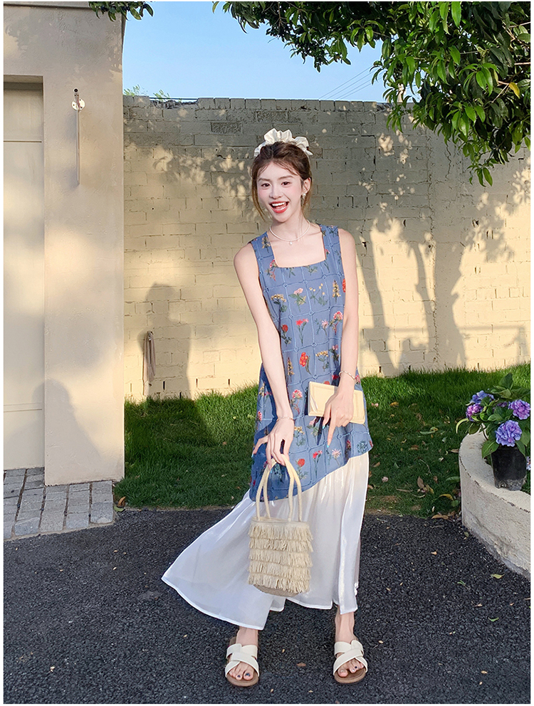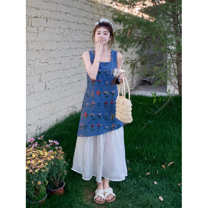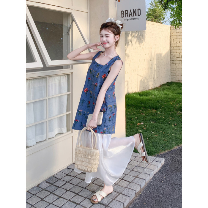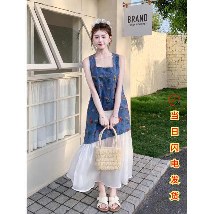 巨好看漂亮花朵小方領連衣裙女小個子夏季新款溫柔風假兩件背心裙
