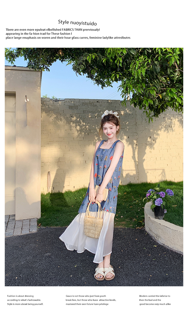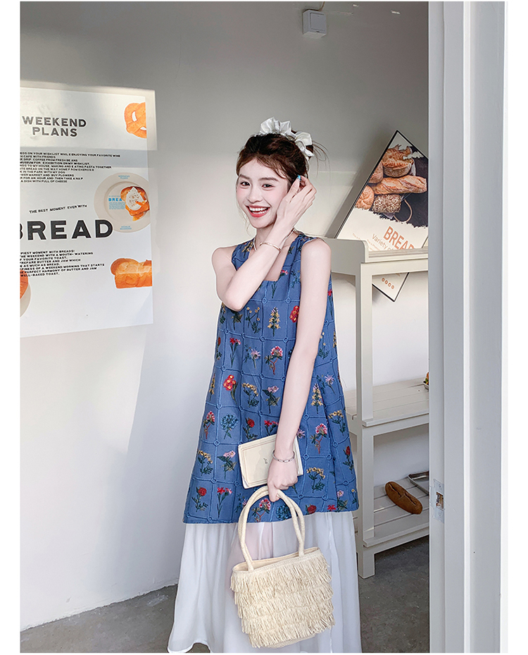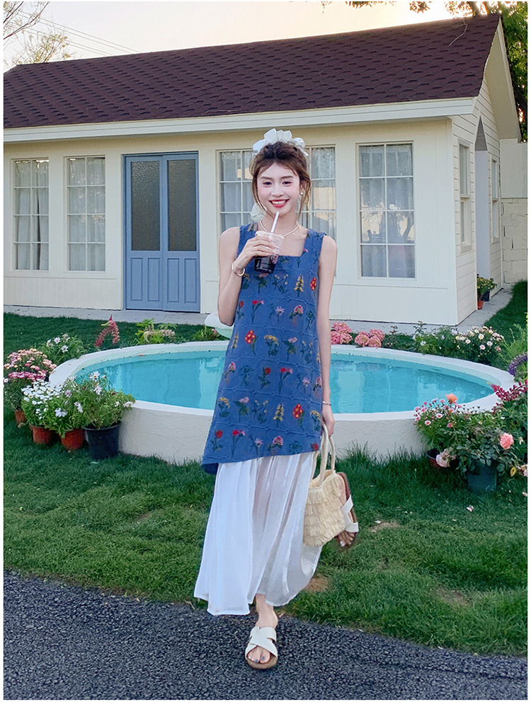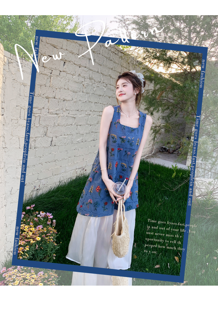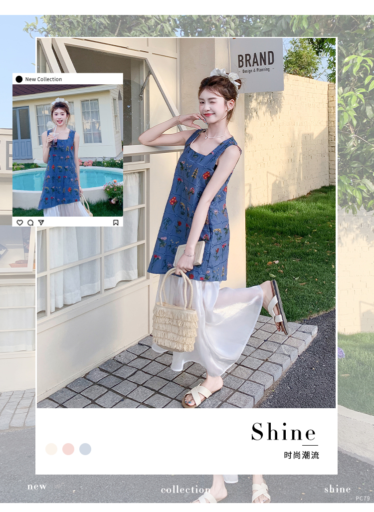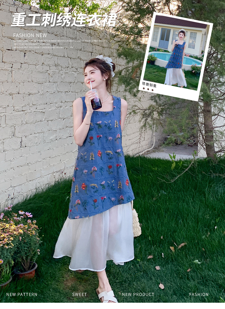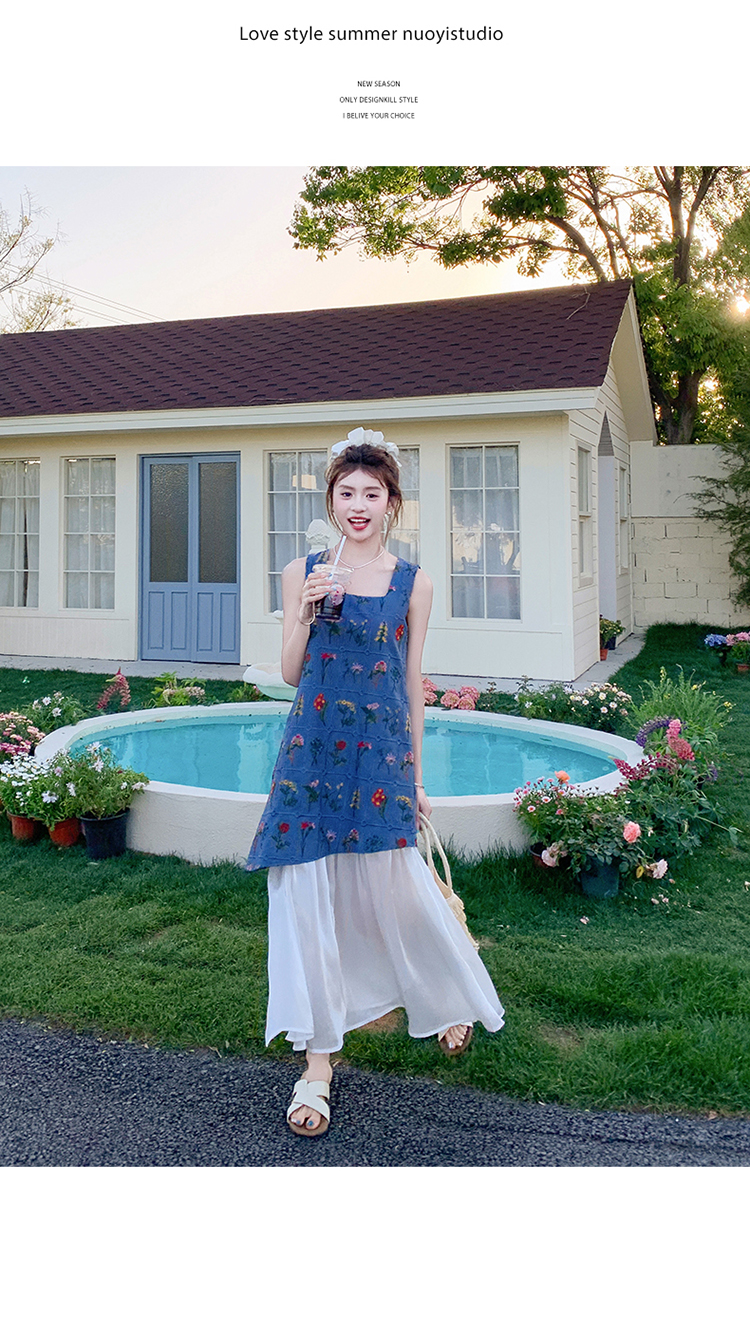巨好看漂亮花朵小方領連衣裙女小個子夏季新款溫柔風假兩件背心裙