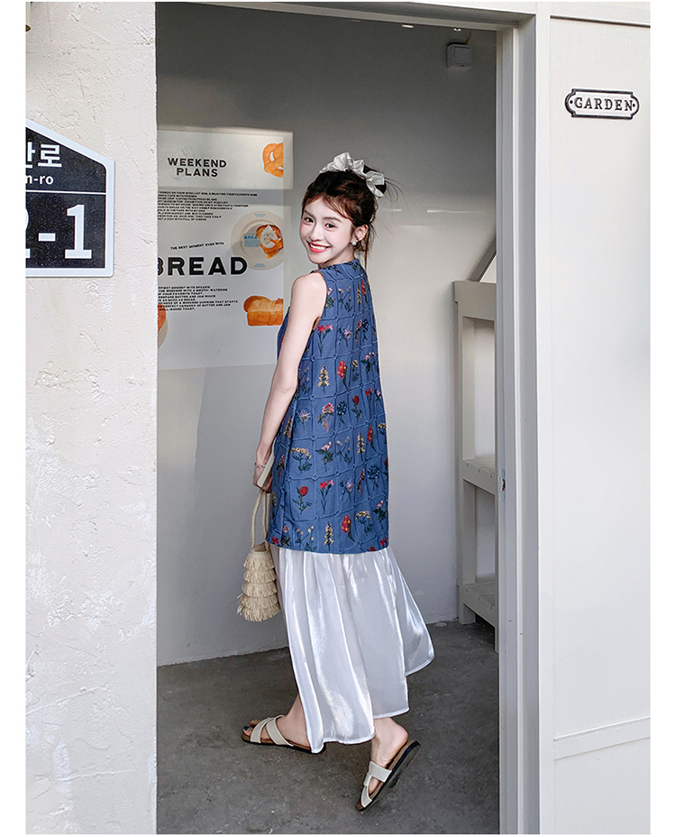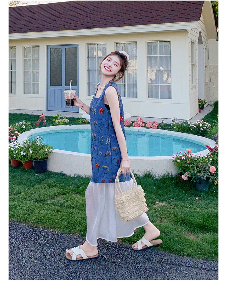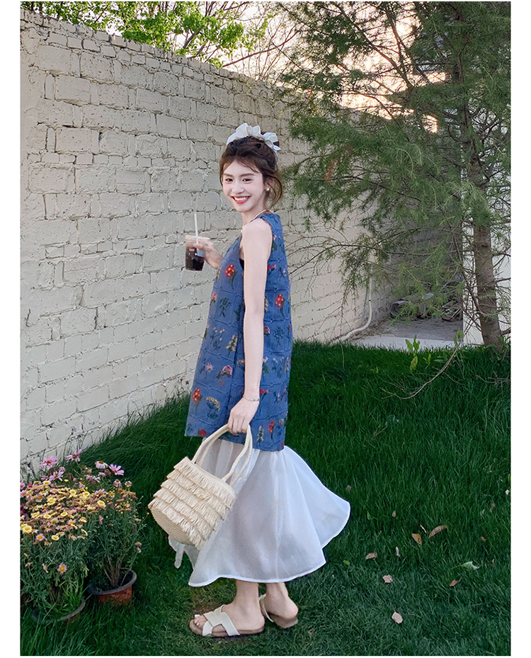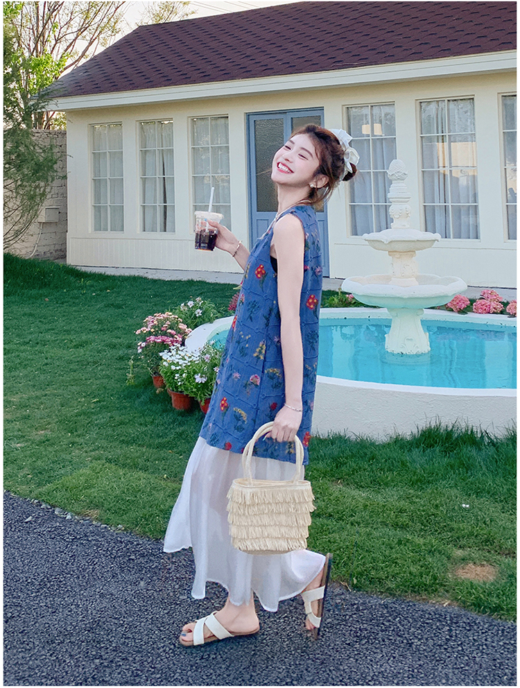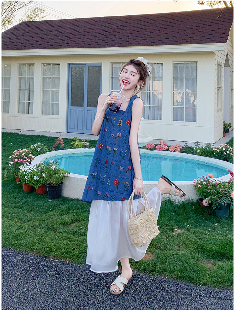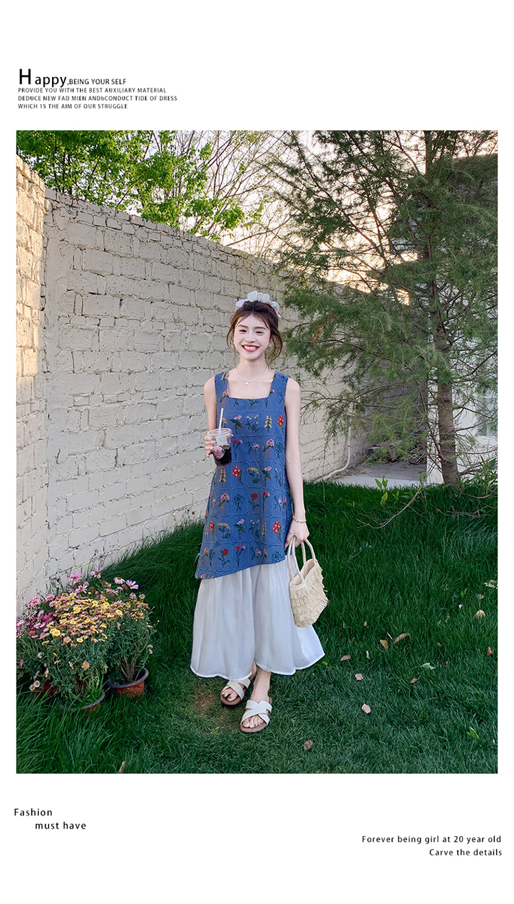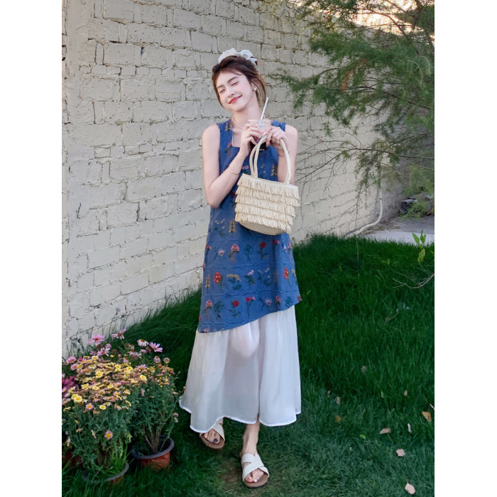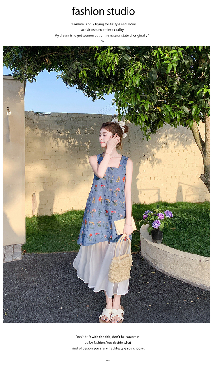 巨好看漂亮花朵小方領連衣裙女小個子夏季新款溫柔風假兩件背心裙