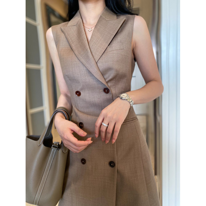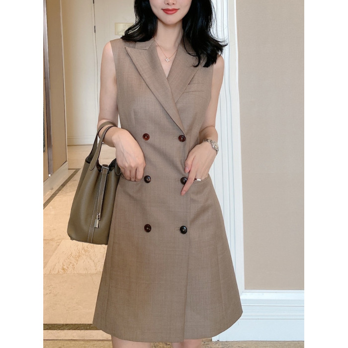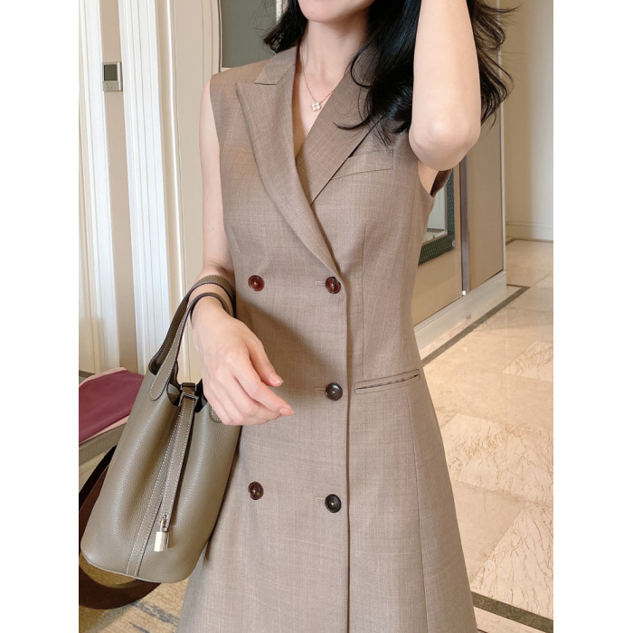 夏季薄款無袖雙排釦西裝裙女背心裙氣質時尚女神範高級職業連衣裙