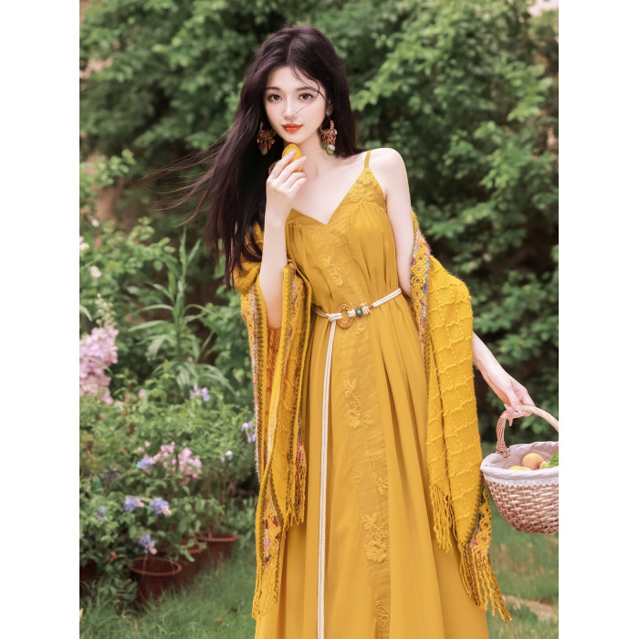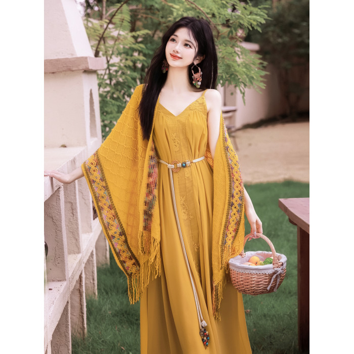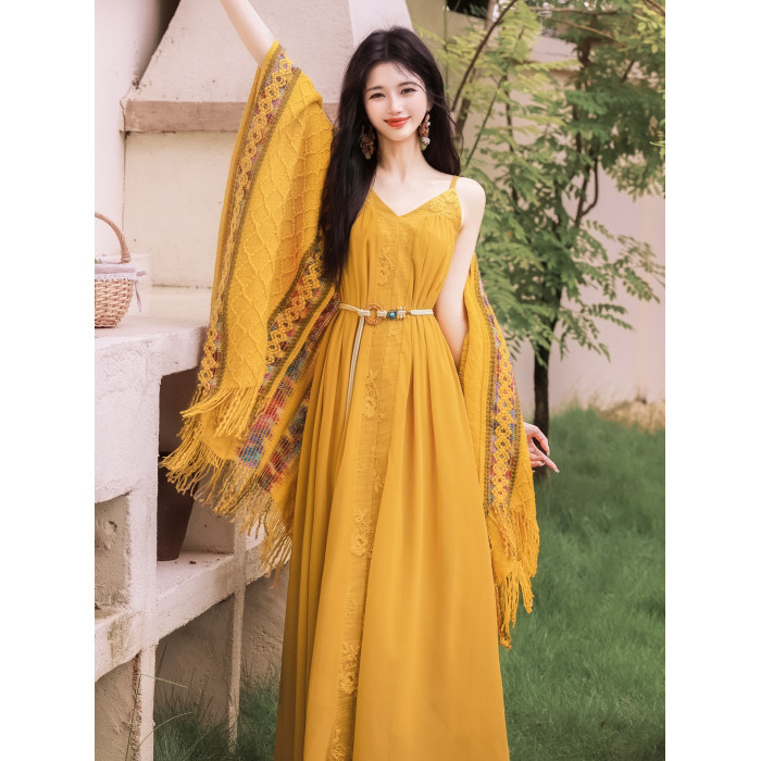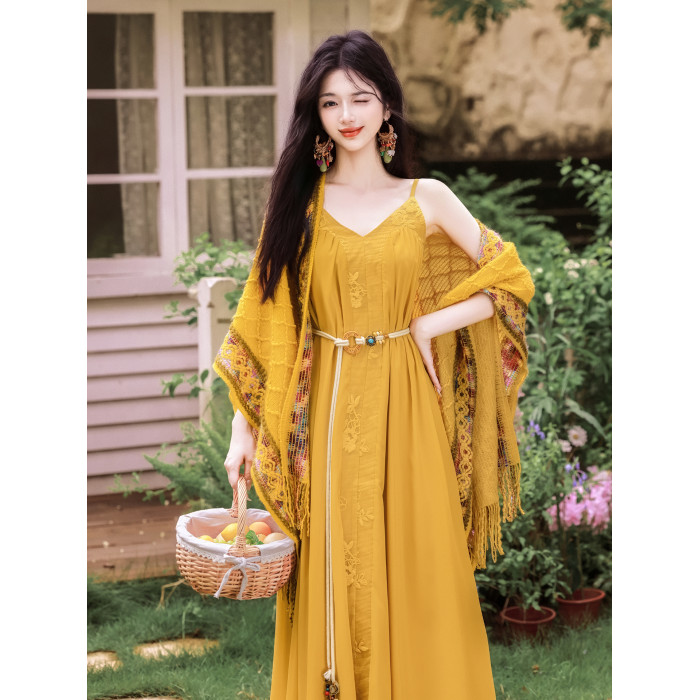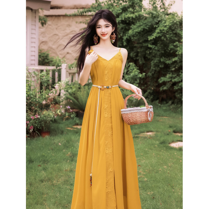 多巴胺絕美黃色海邊度假風吊帶連衣裙夏季明媚氛圍感飄逸寬松長裙
