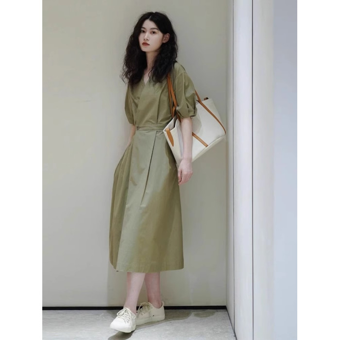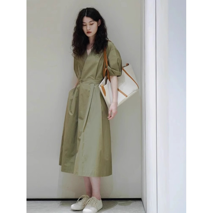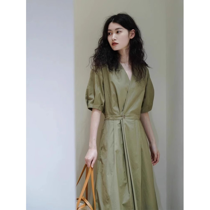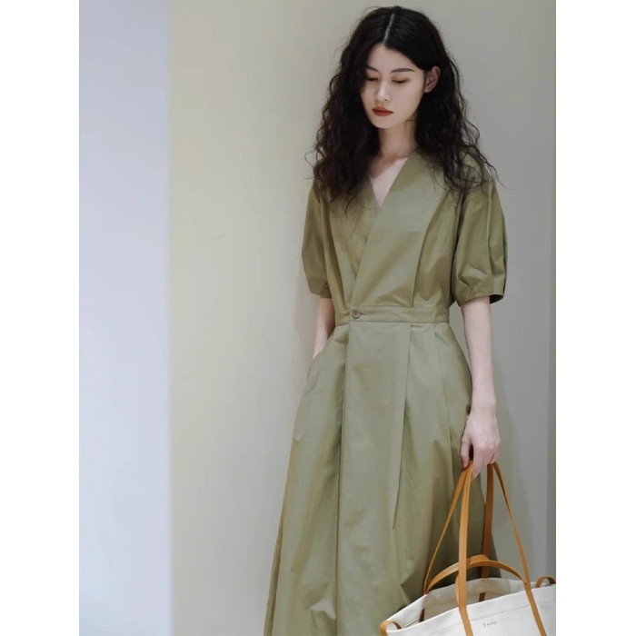 XZOXZO 法式精緻輕熟氣質收腰高級感綠色v領有口袋襯衫連衣裙女夏