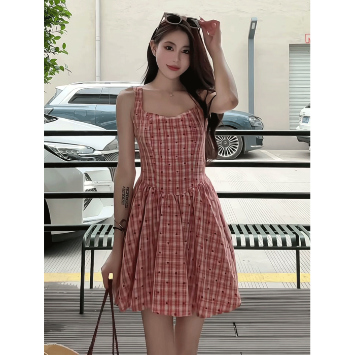 粉色愛心格子吊帶連衣裙女2025夏季新款法式氣質顯瘦收腰A字短裙