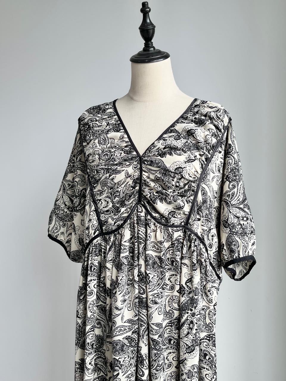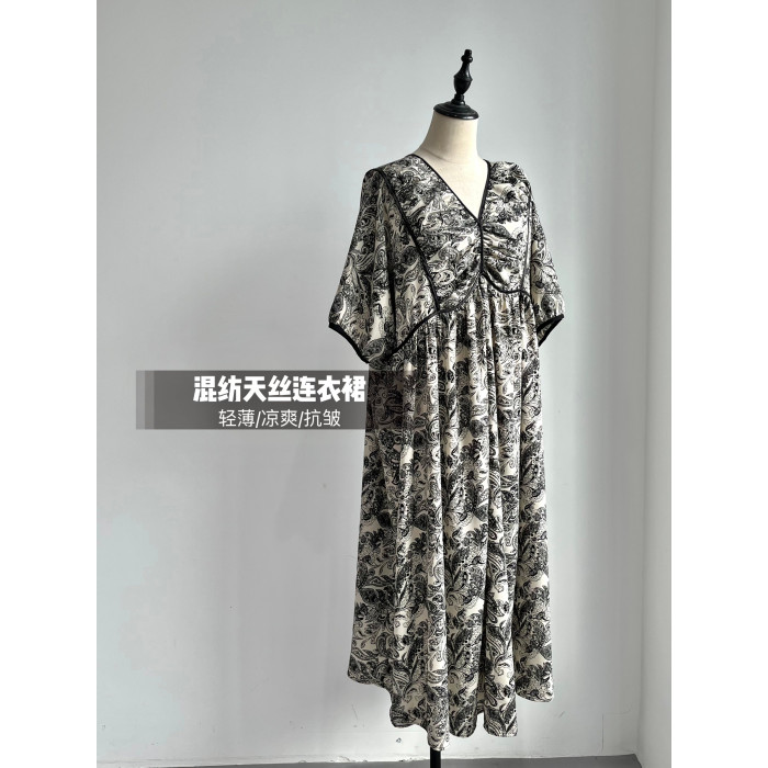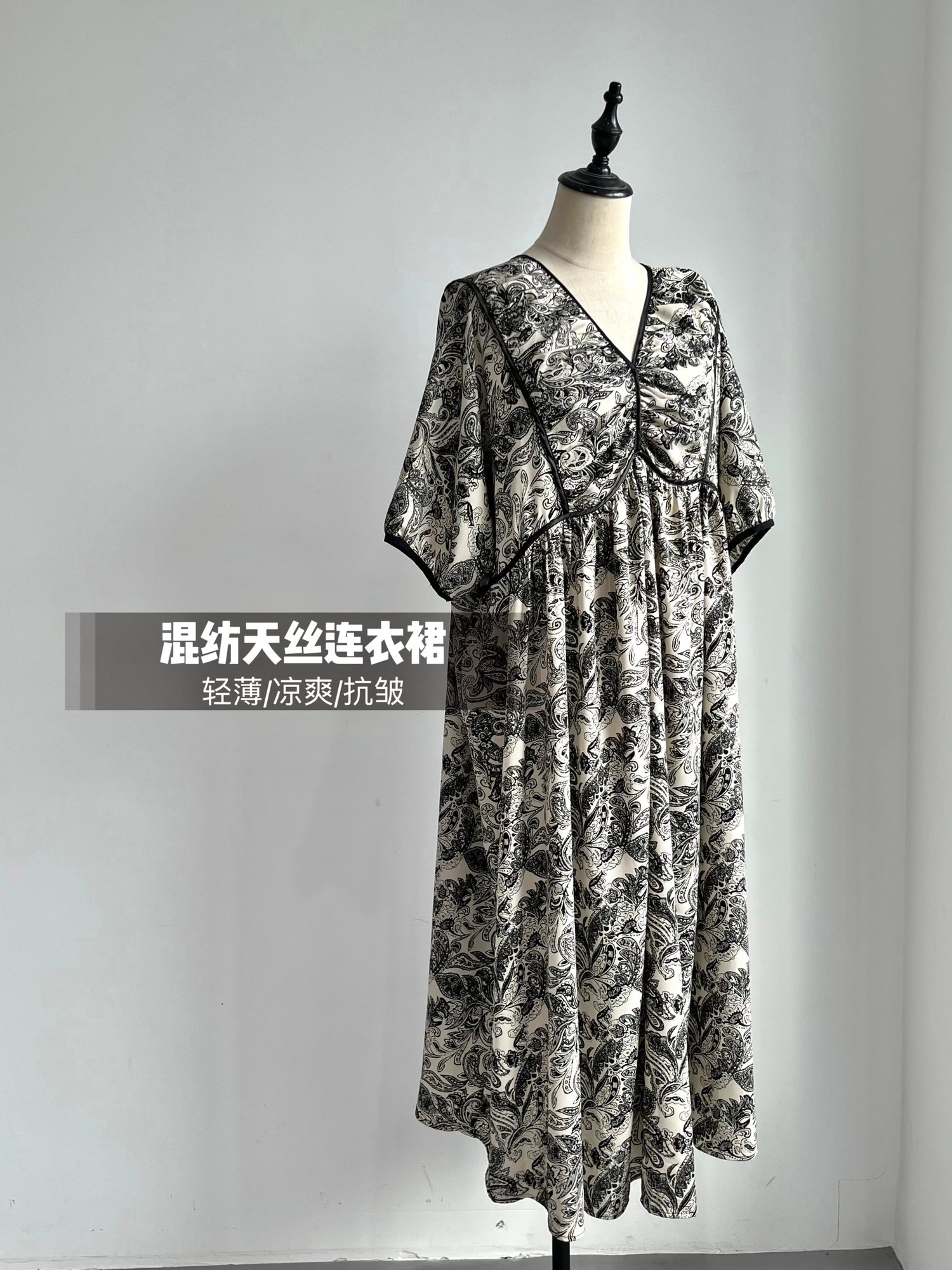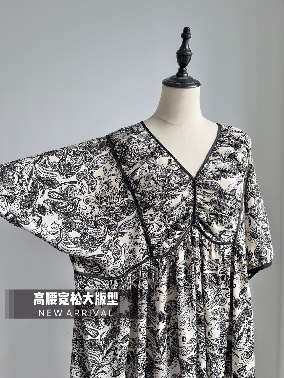 V領寬松天絲連衣裙 度假風大碼長裙子重磅高腰氣質中長款印花袍子