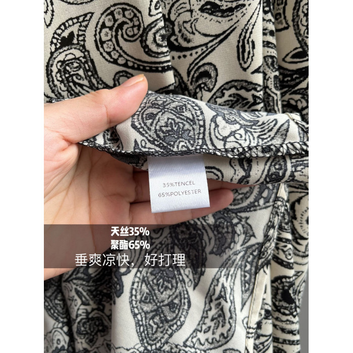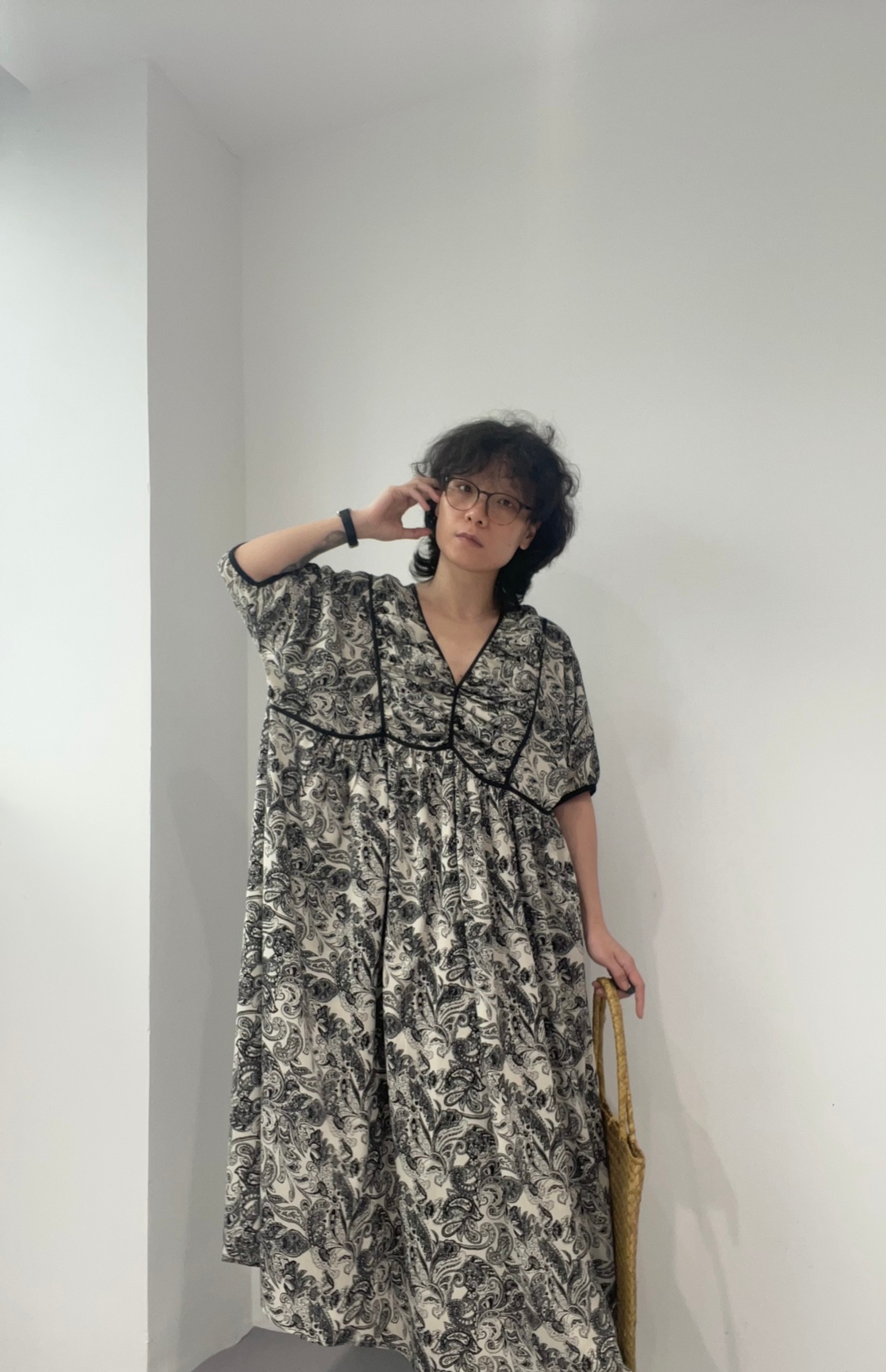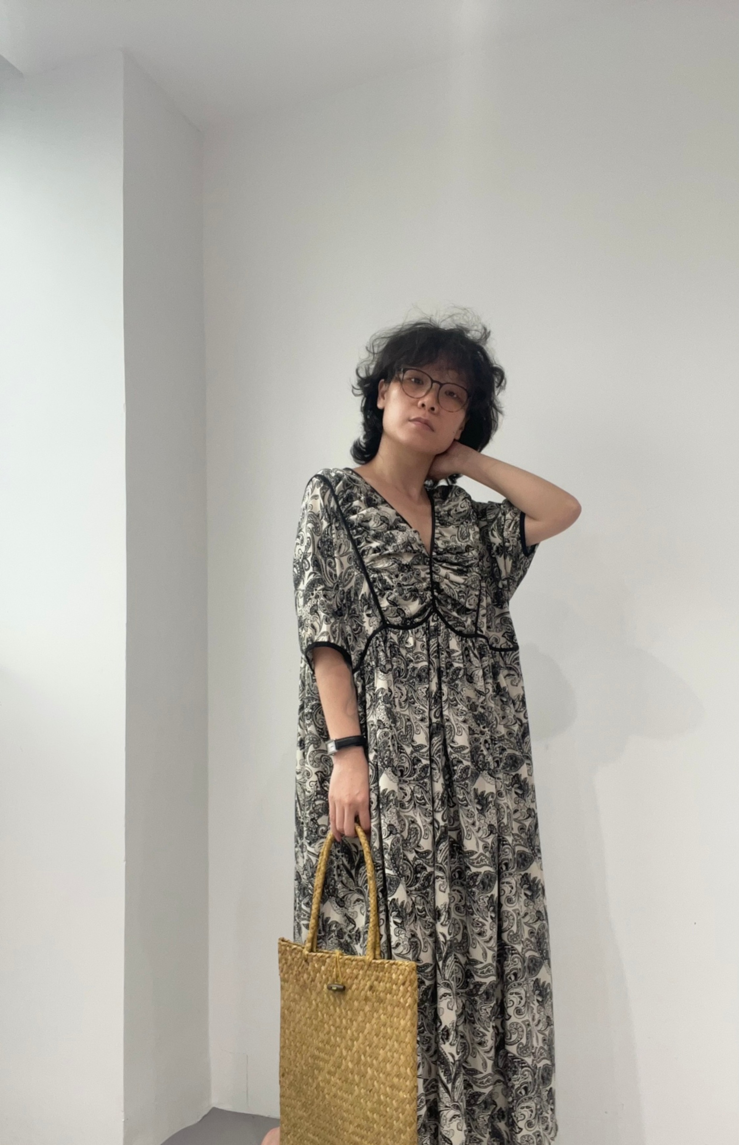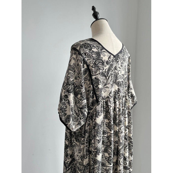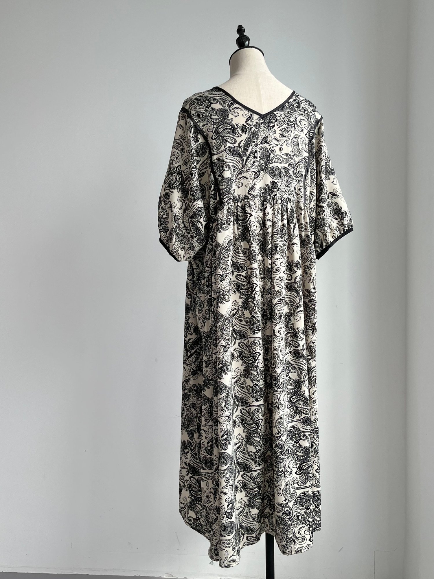 V領寬松天絲連衣裙 度假風大碼長裙子重磅高腰氣質中長款印花袍子