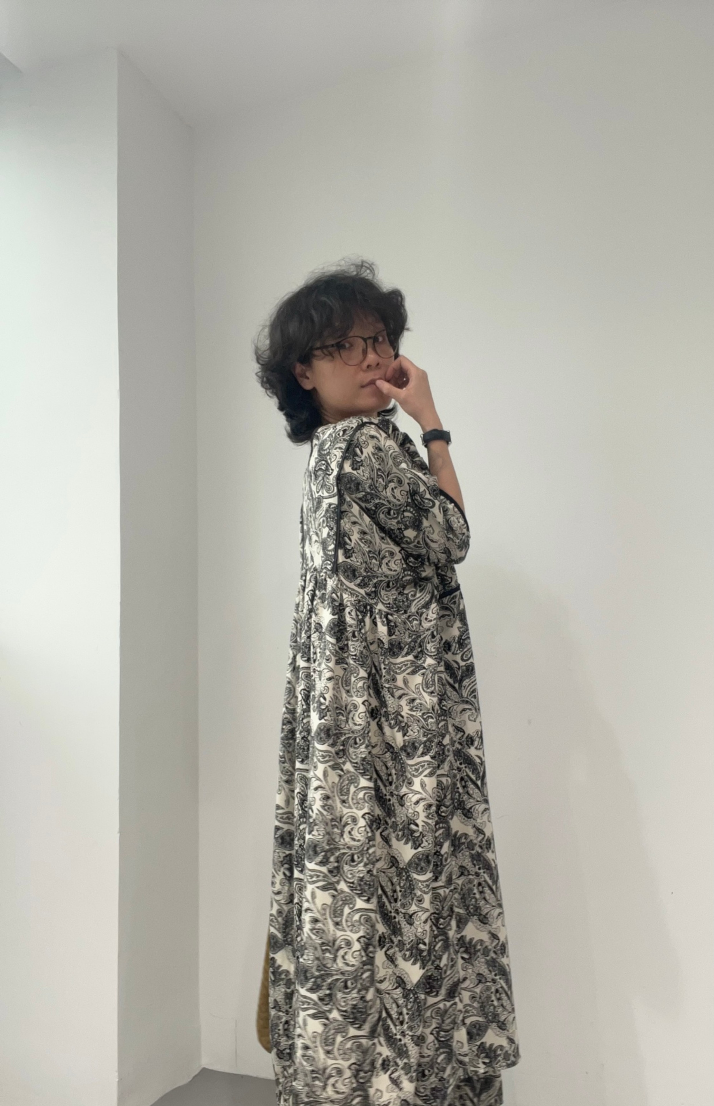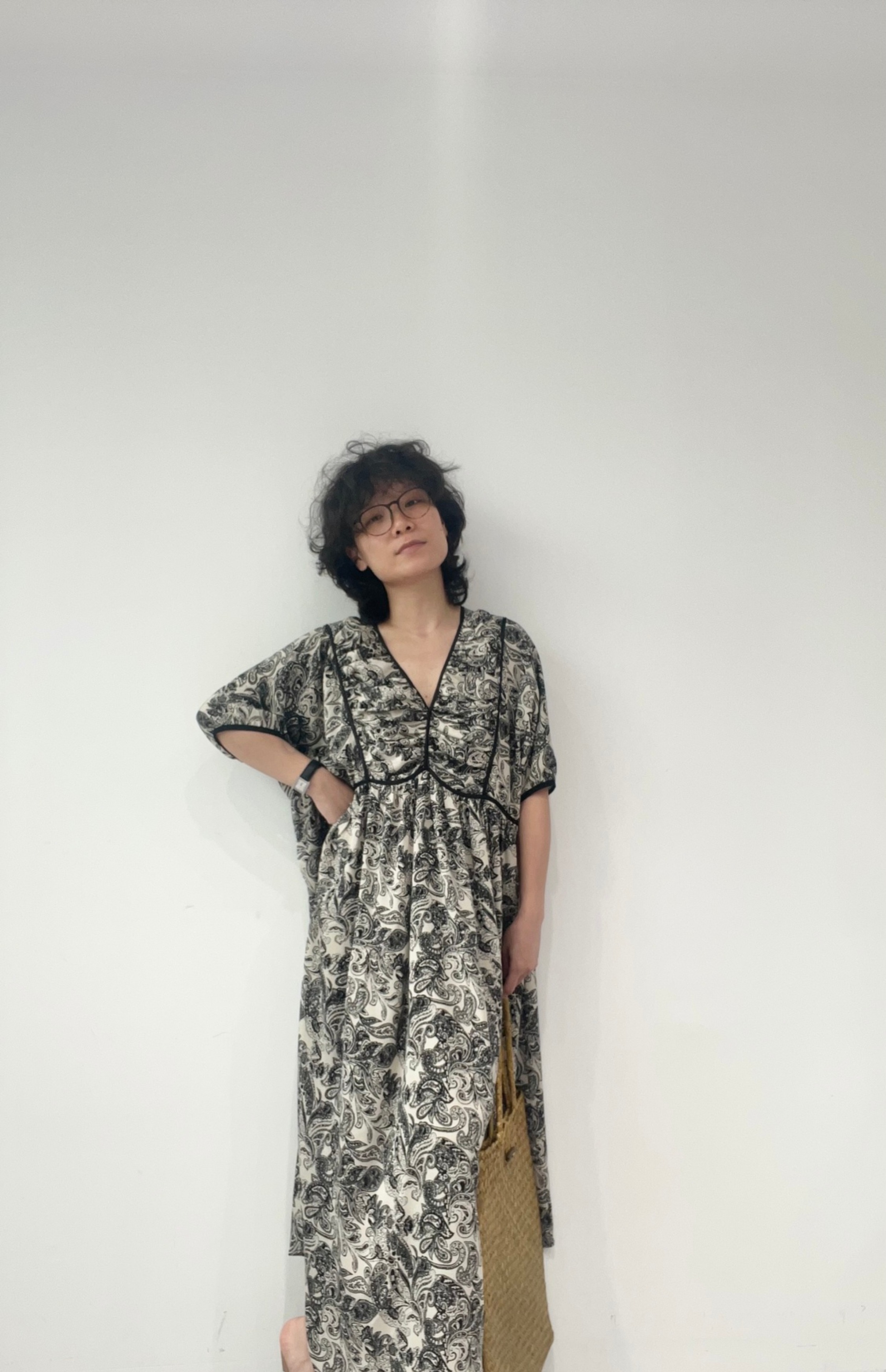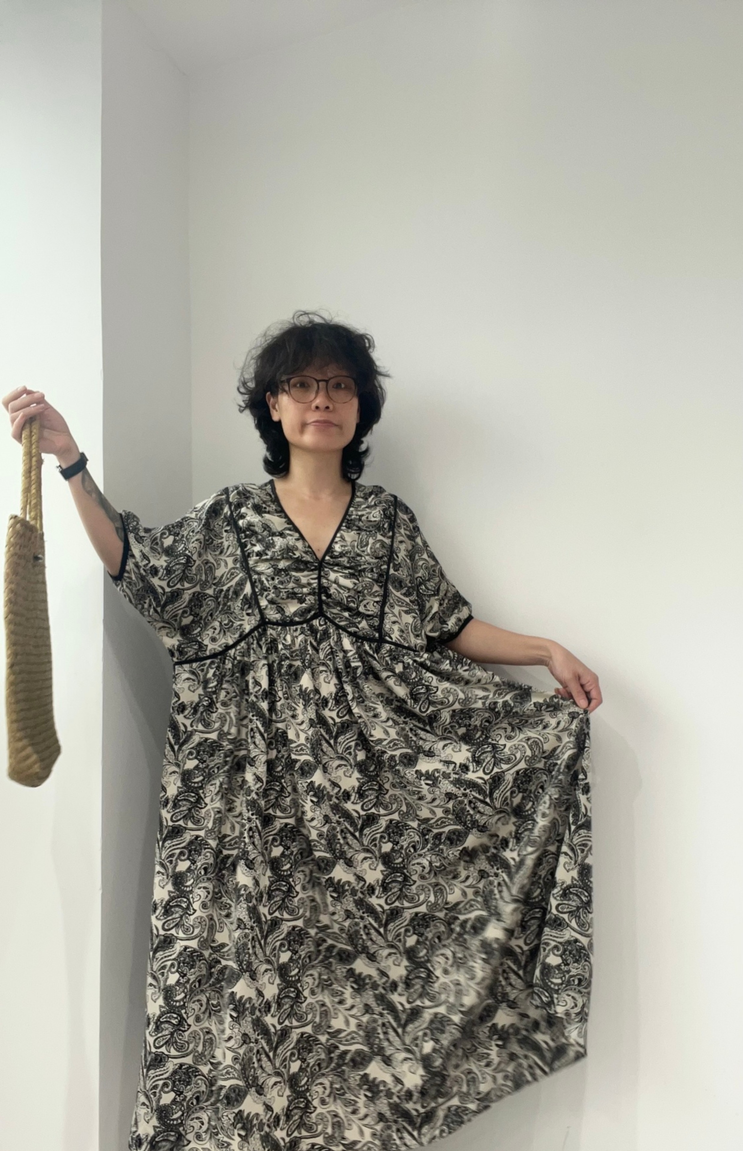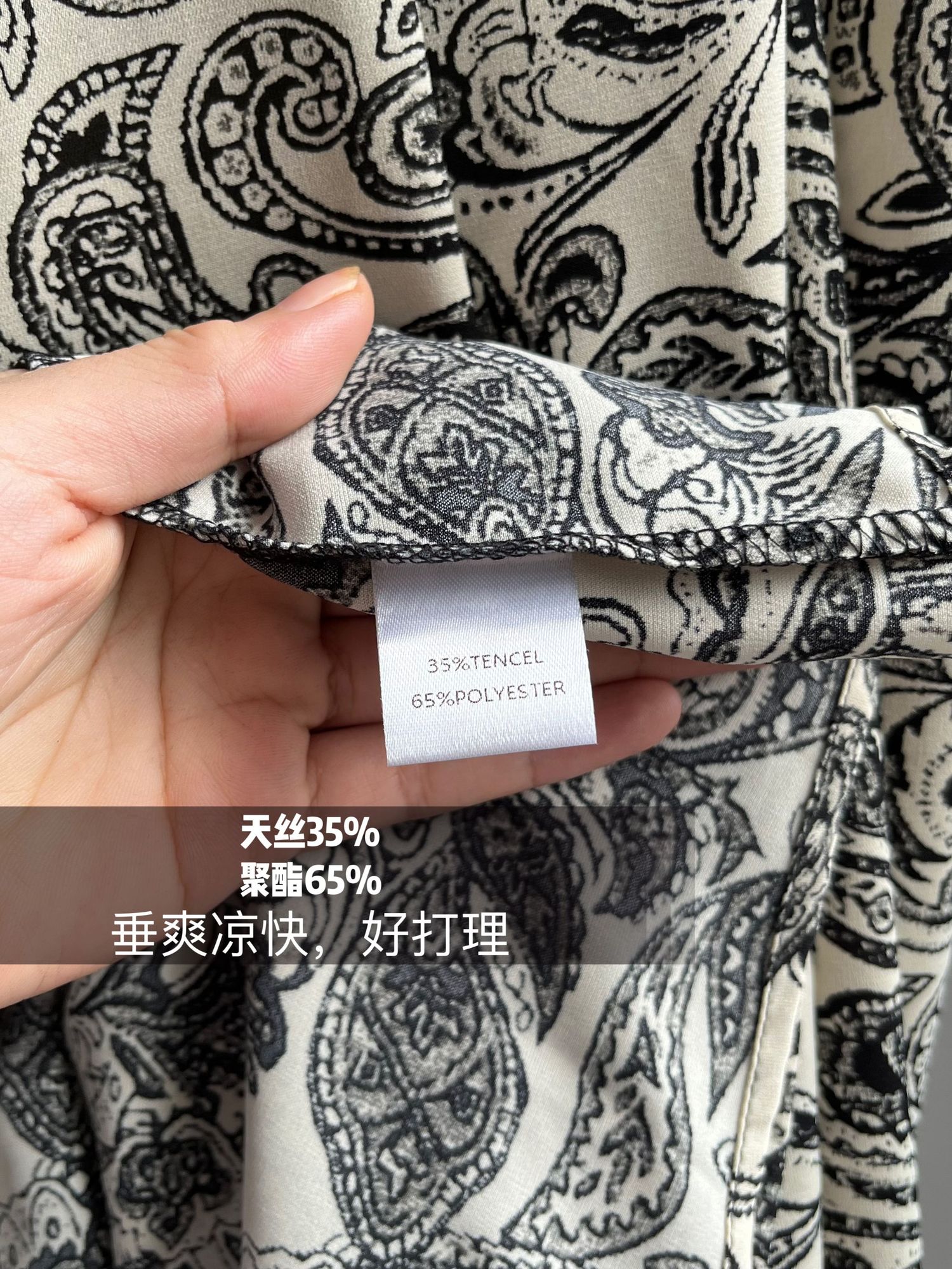 V領寬松天絲連衣裙 度假風大碼長裙子重磅高腰氣質中長款印花袍子