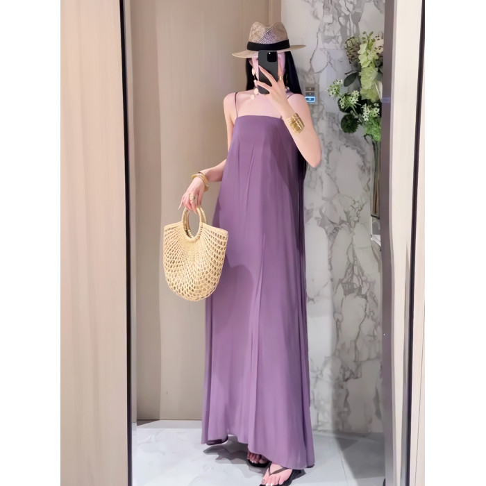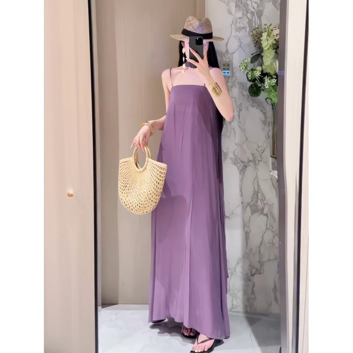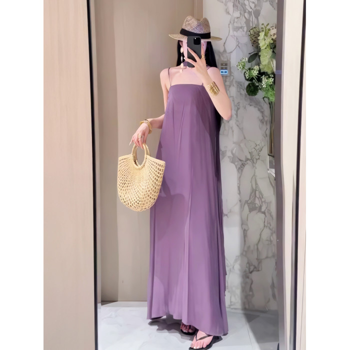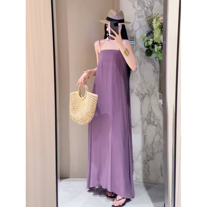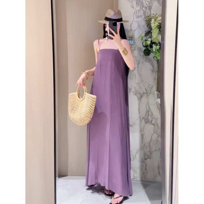赫本風小黑裙2025夏季配飄帶法式氣質度假風a字黑色吊帶連衣裙女