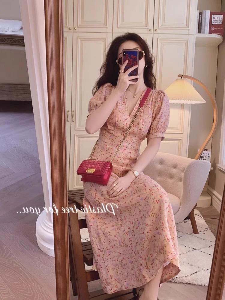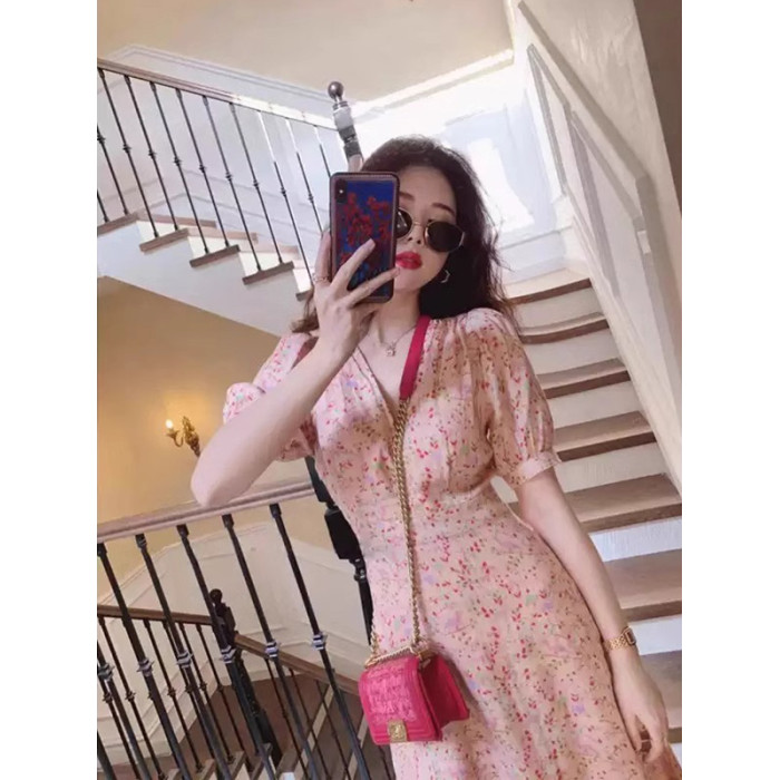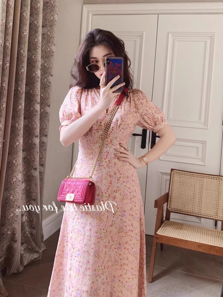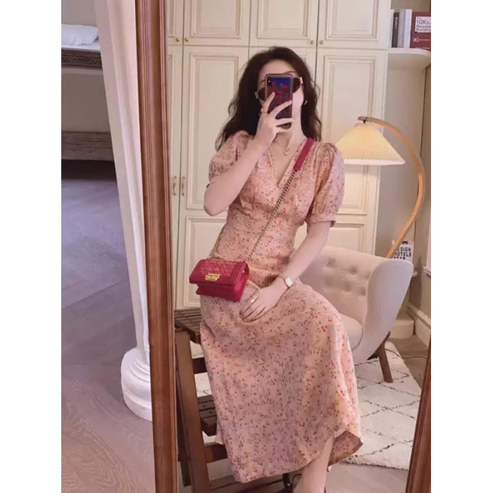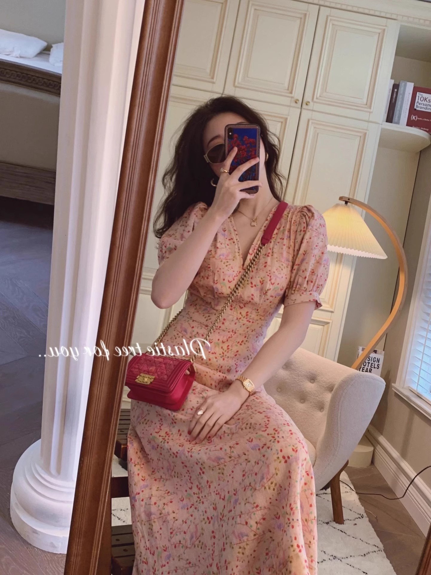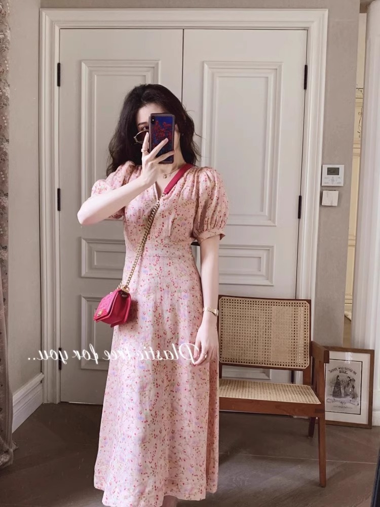 XZOXZO茶歇法式復古初戀可鹽可甜溫柔粉色碎花連衣裙子顯瘦長裙夏