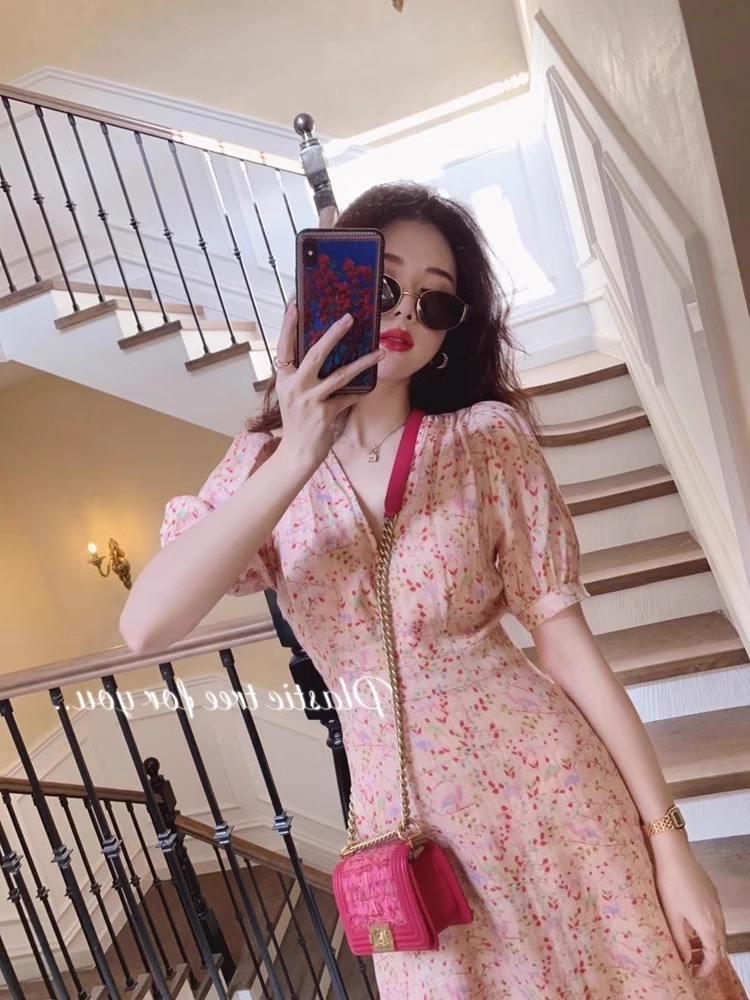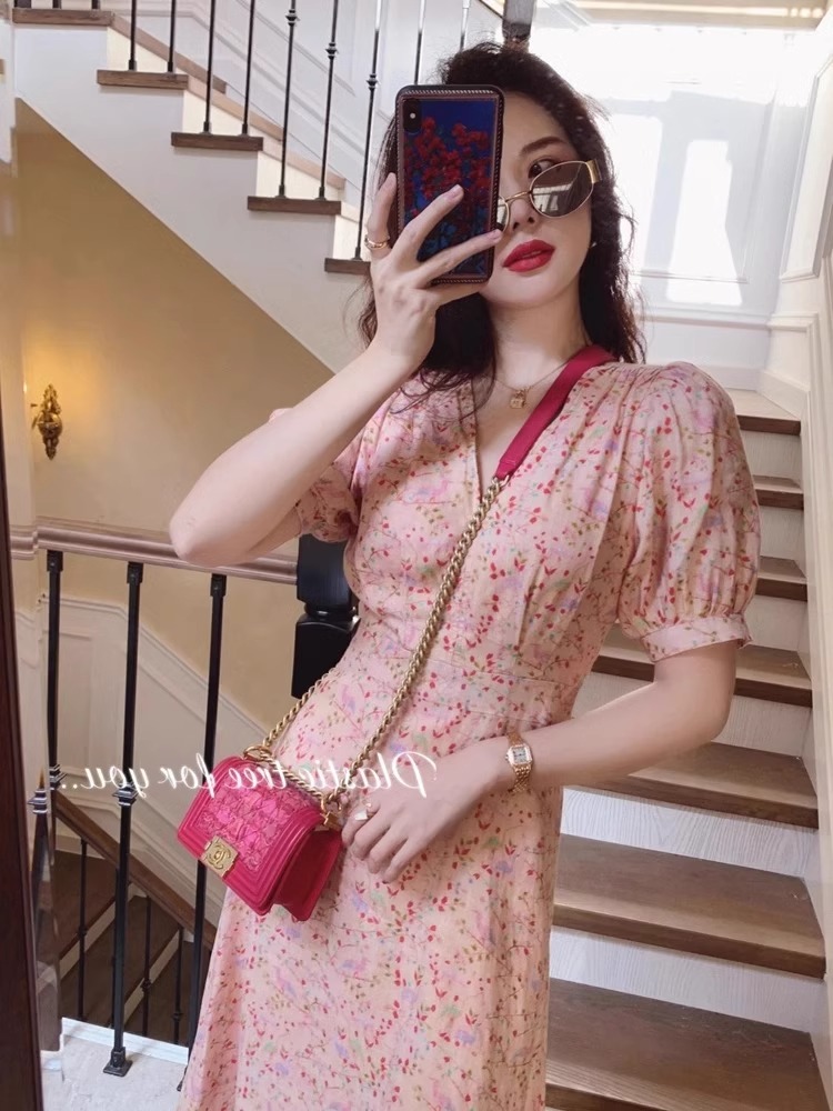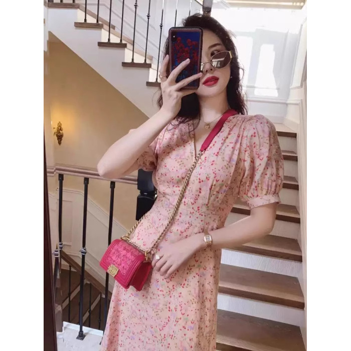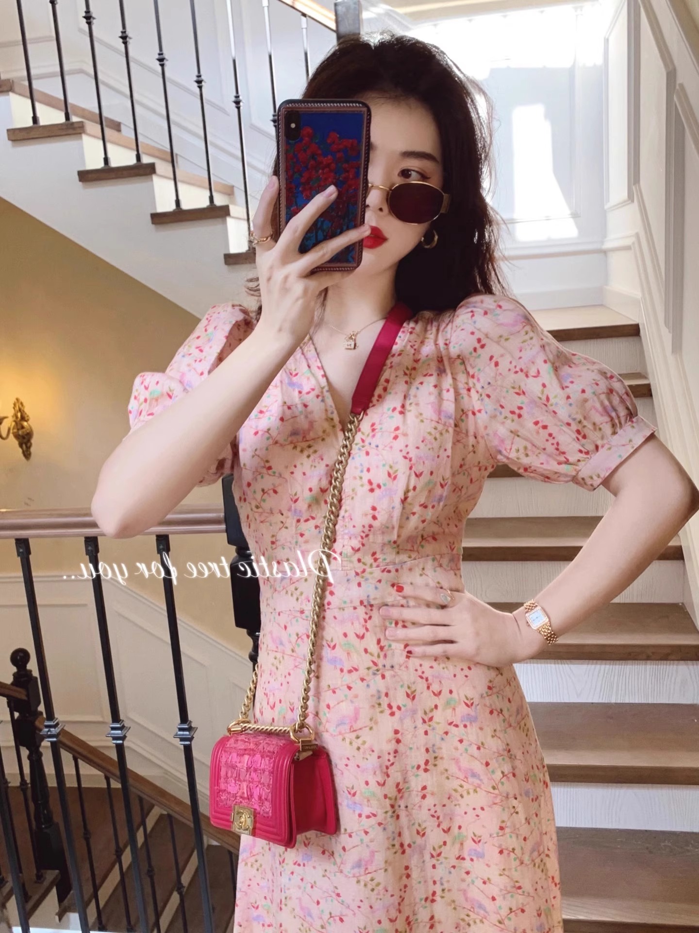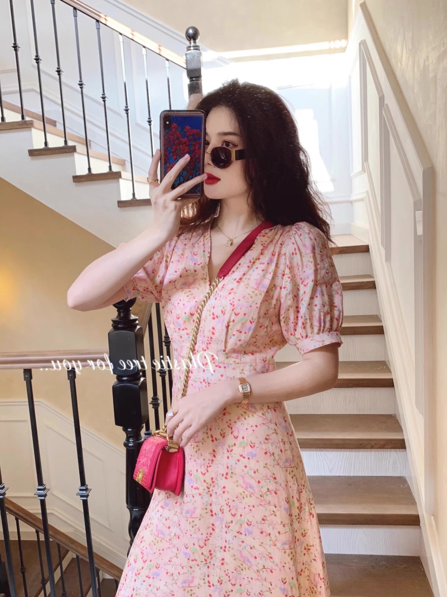 XZOXZO茶歇法式復古初戀可鹽可甜溫柔粉色碎花連衣裙子顯瘦長裙夏