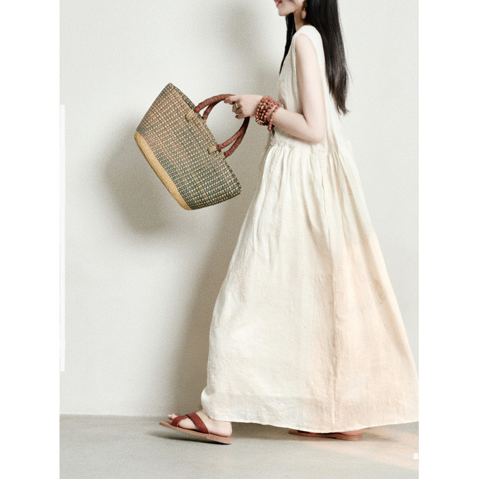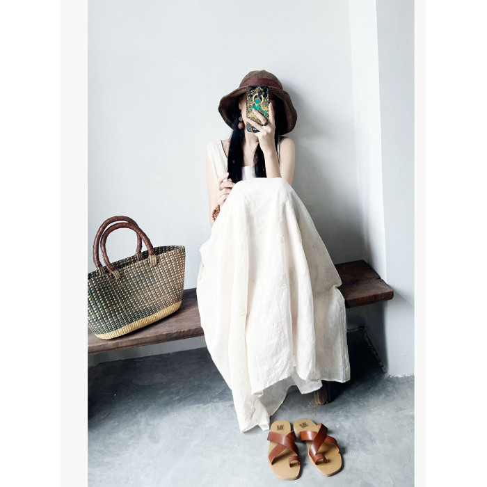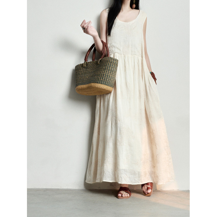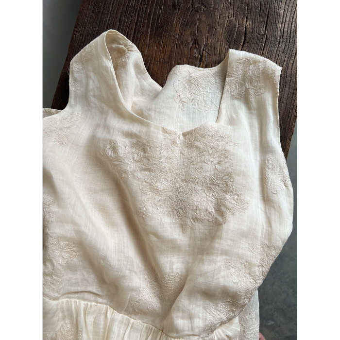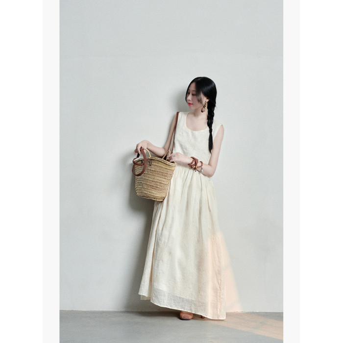 爲止/2025如夏 原創設計 文藝法式苧麻刺綉杏色U領連衣裙050614