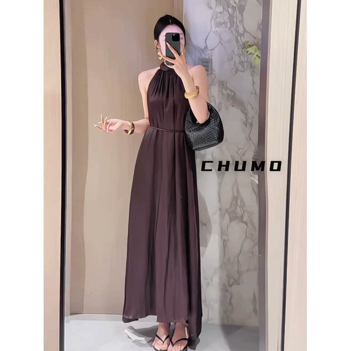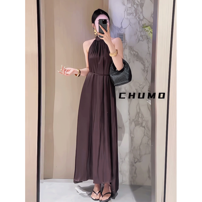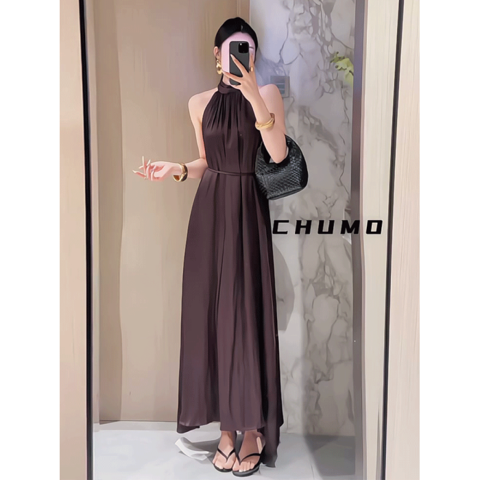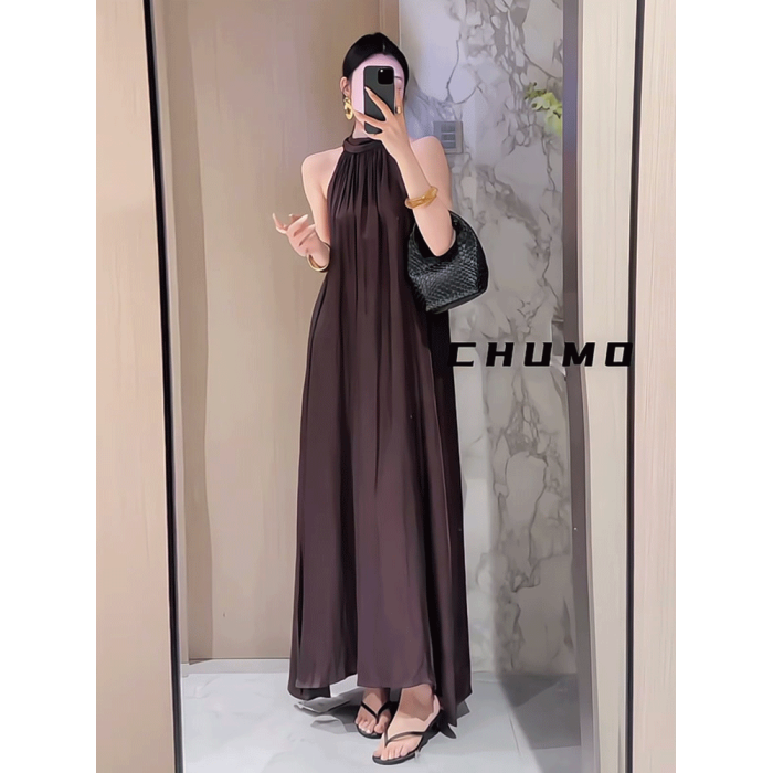 法式禦姐風無袖掛脖連衣裙女2025夏季新款高級感氣質寬松顯瘦長裙