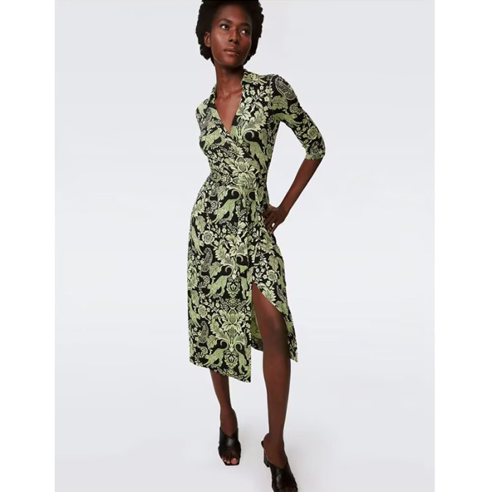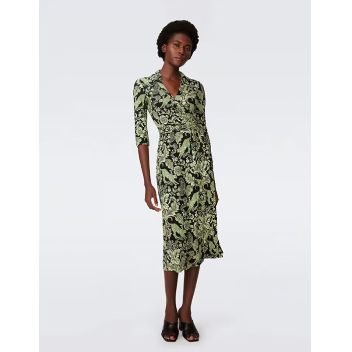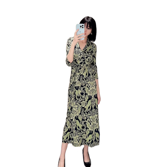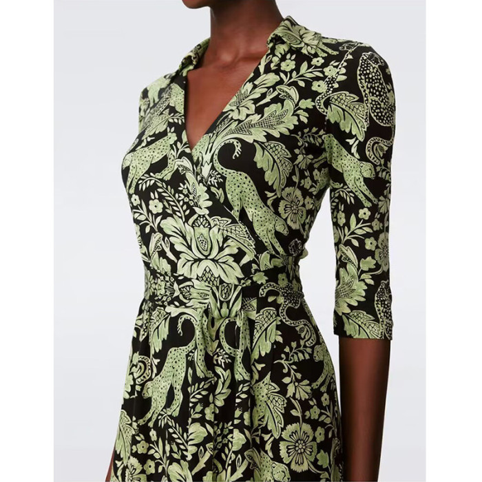 春季新款豹紋圖案裹身裙交叉POLO領簡約大方優雅氣質七分袖連衣裙