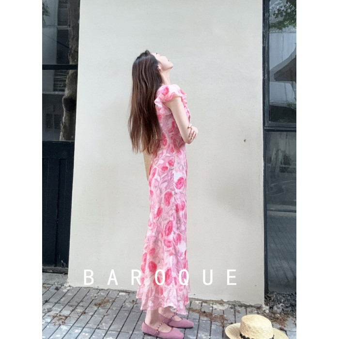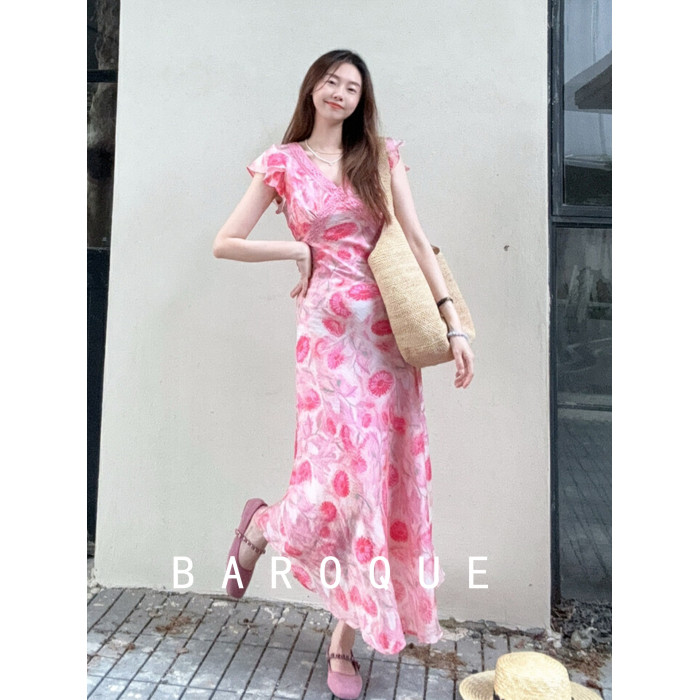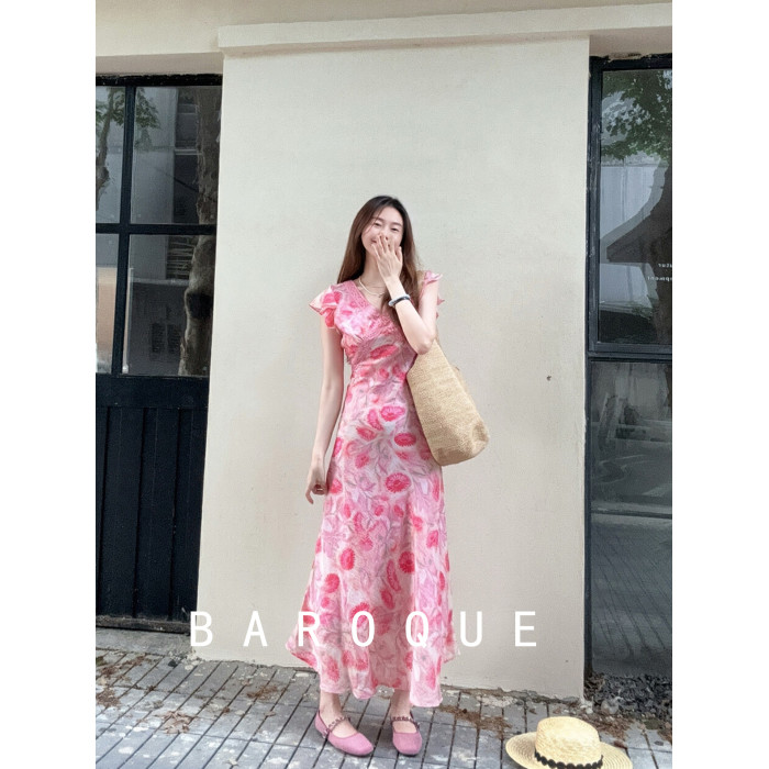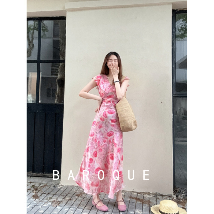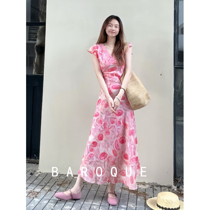 BAROQUE裙子夏季女2025新款收腰氣質流行法式飛袖花色V領連衣裙女