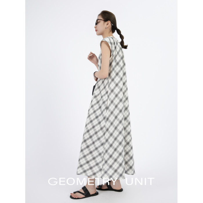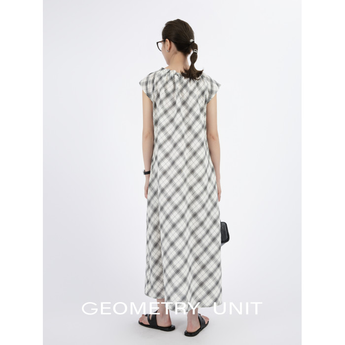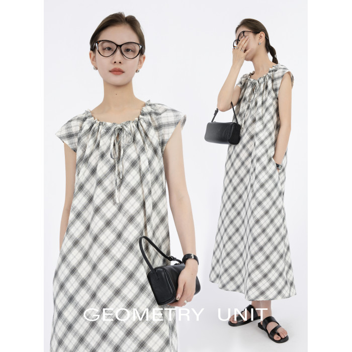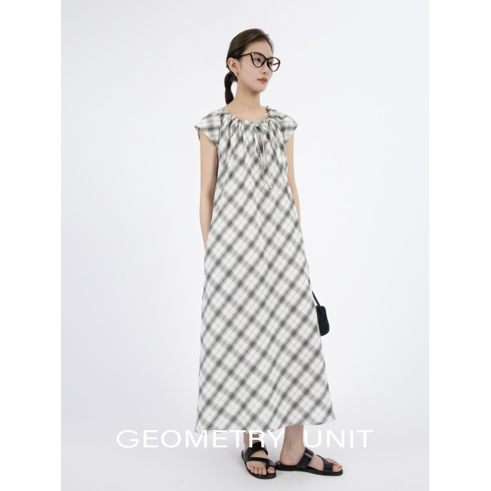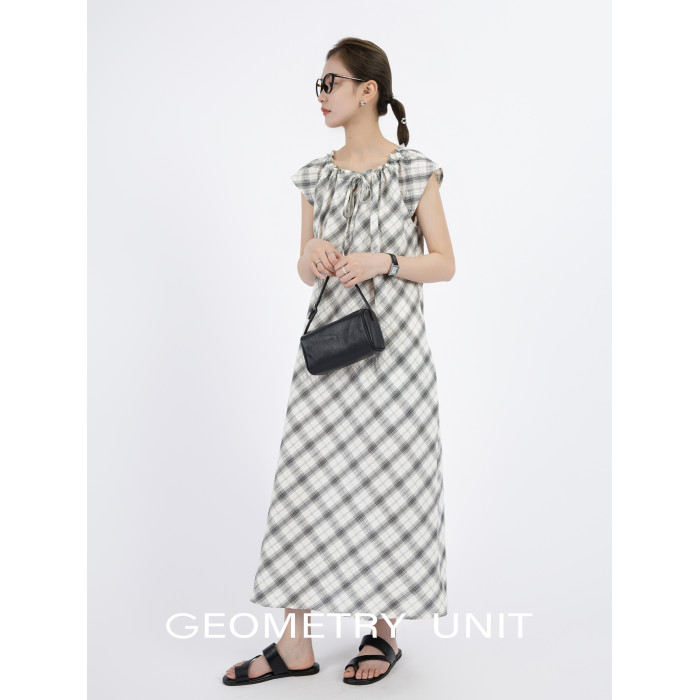 幾何單元法式減齡連衣裙2025夏季新款寬松顯瘦復古格紋小飛袖長裙