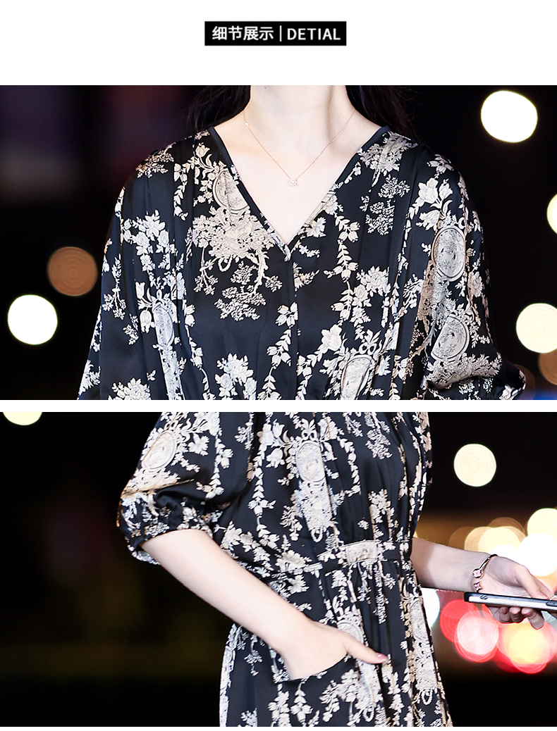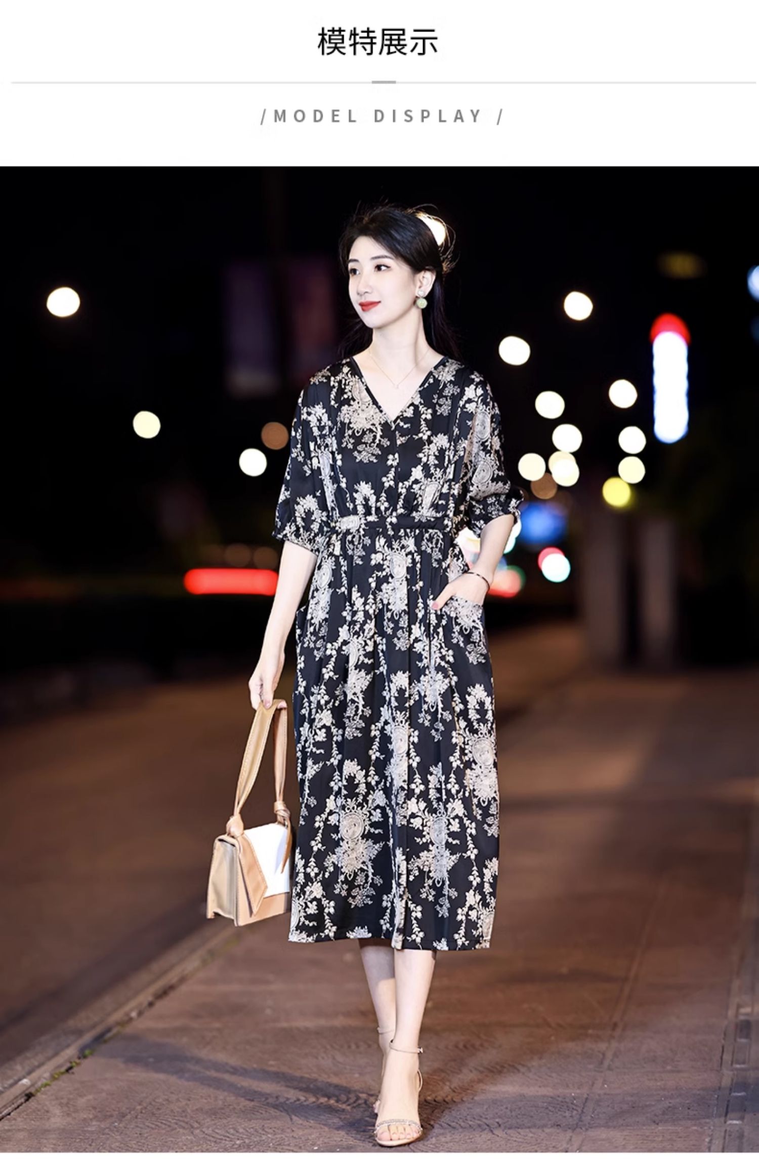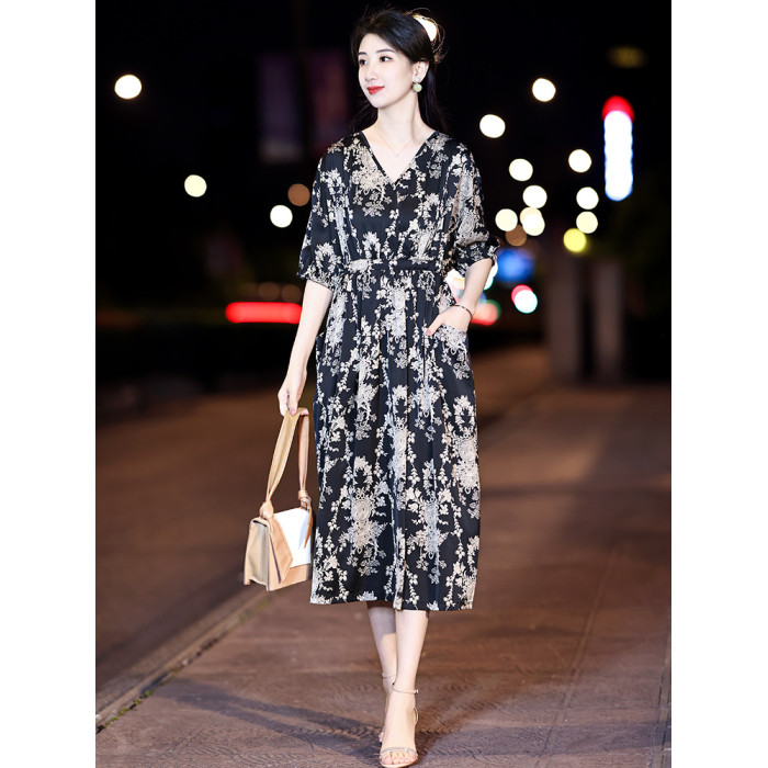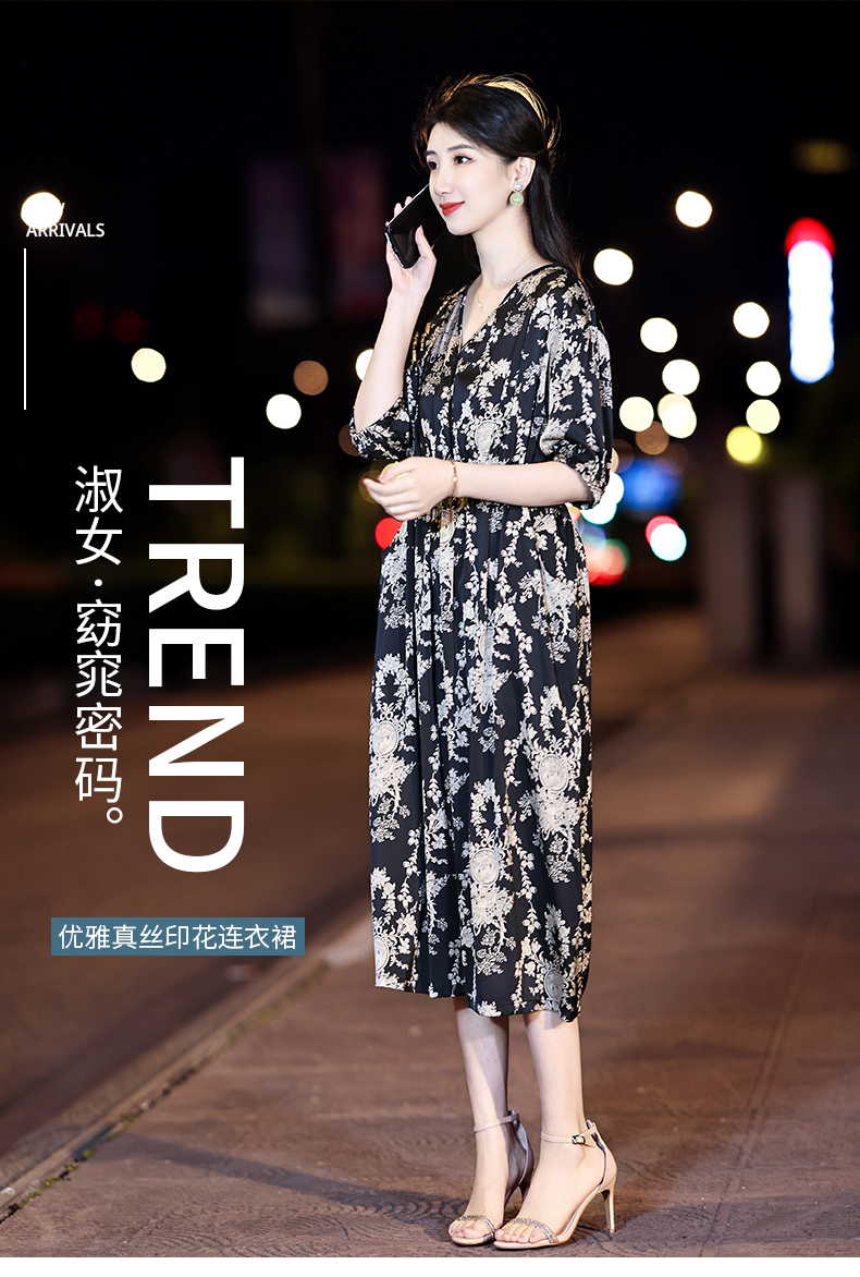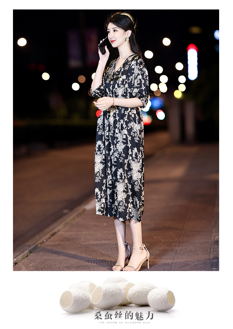 杭州真絲桑蠶絲連衣裙2025夏季新款女大碼碎花高級奢華寬松遮肚子