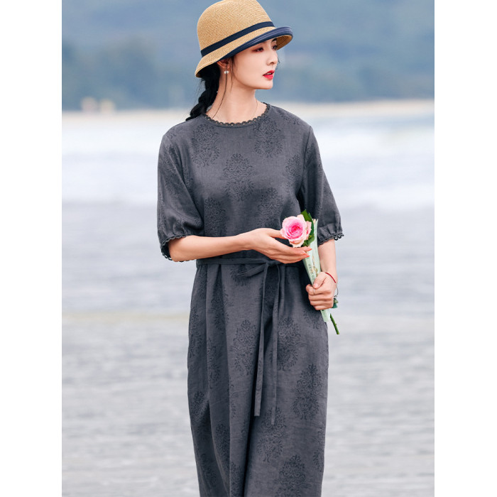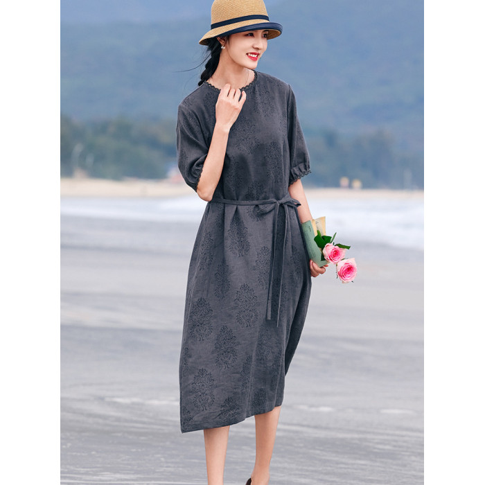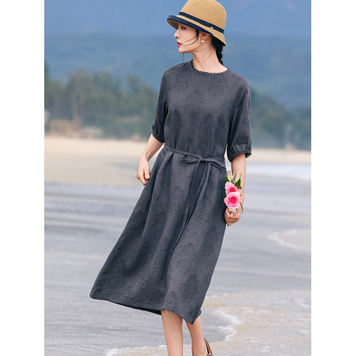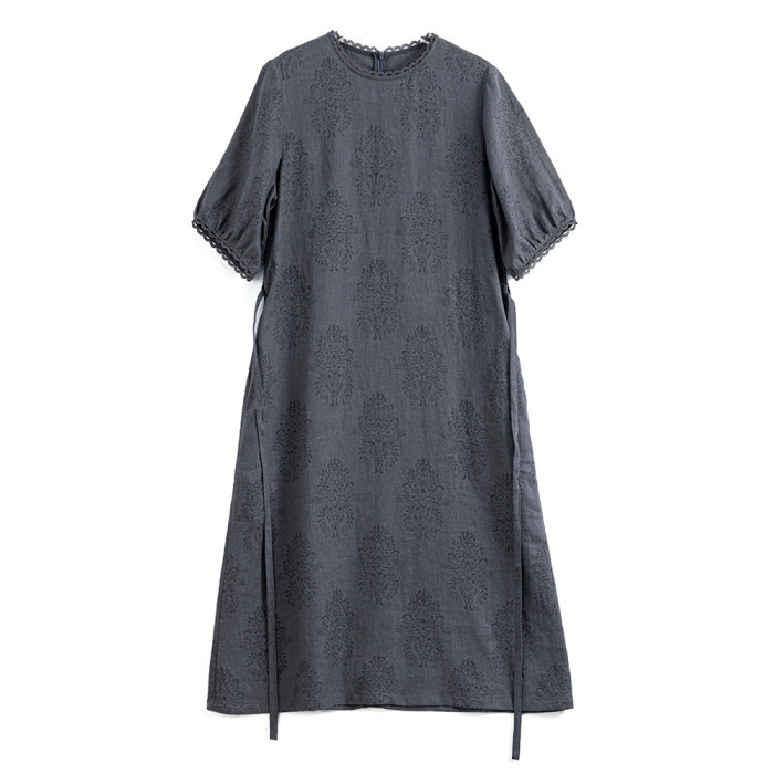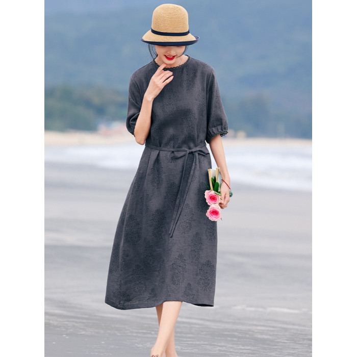 高定25夏季新款高品質復古亞麻燒花A字裙顯瘦氣質花邊系帶連衣裙