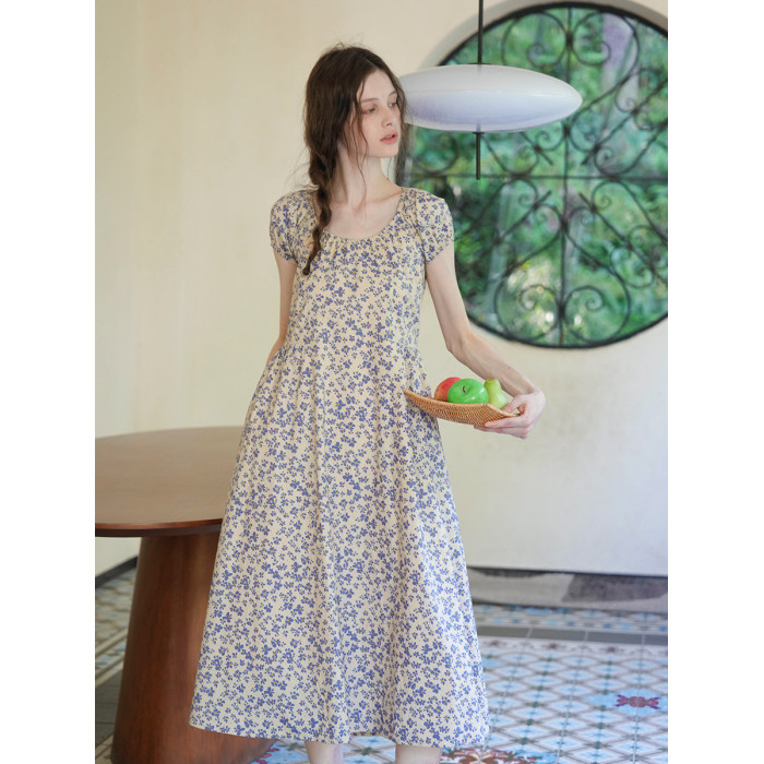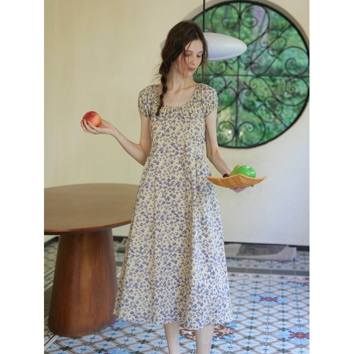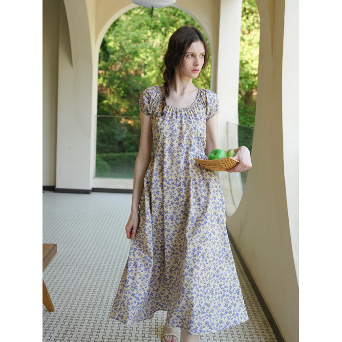 Bruland 柔美法式紫碎花連衣裙復古文藝感優雅顯瘦泡泡袖靈動長裙