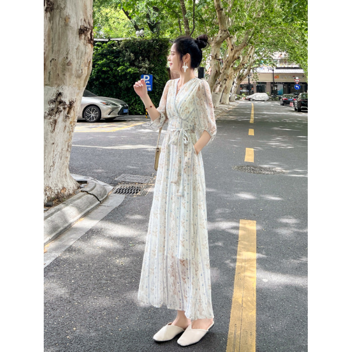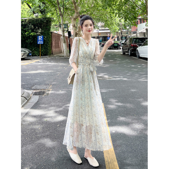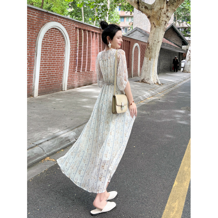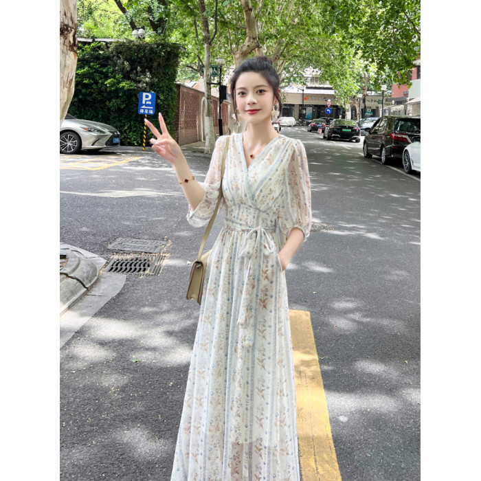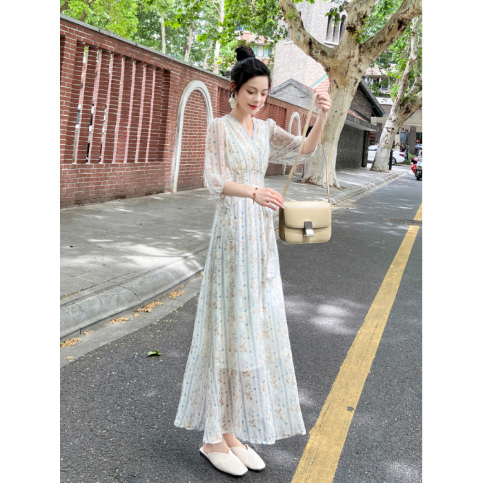 連衣裙2025夏季新款女裝小清新收腰高腰顯瘦燈籠袖V領長款茶歇裙