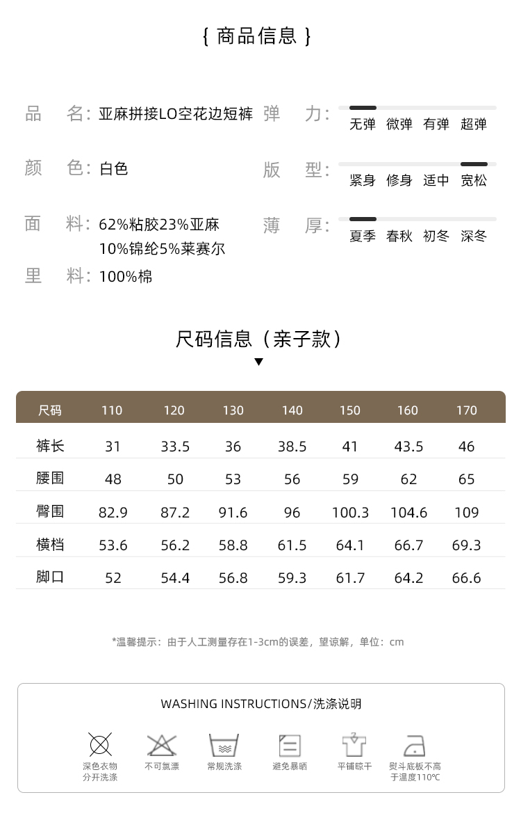 材質成分 粘膠纖維(粘纖)62% 亞麻23% 聚醯胺纖維(錦綸)10% 萊賽爾纖維(萊賽爾)5%