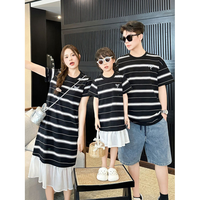 網紅條紋親子裝夏裝短袖一家三口四口小月齡拍照母子母女裝連衣裙