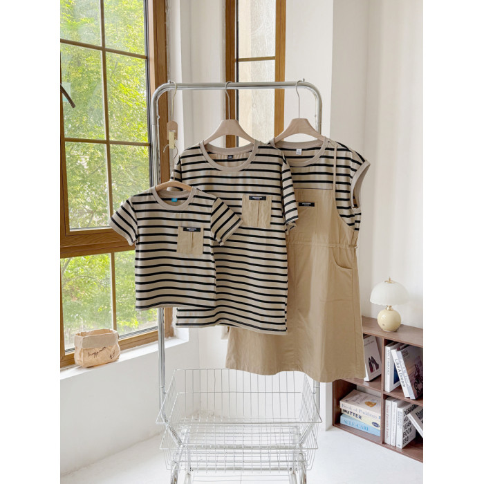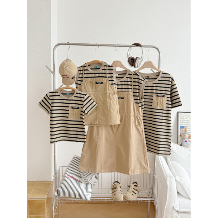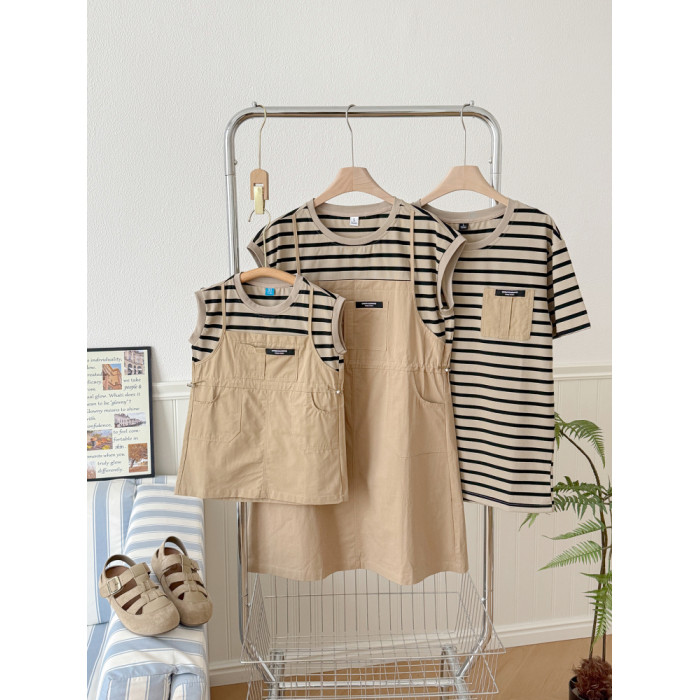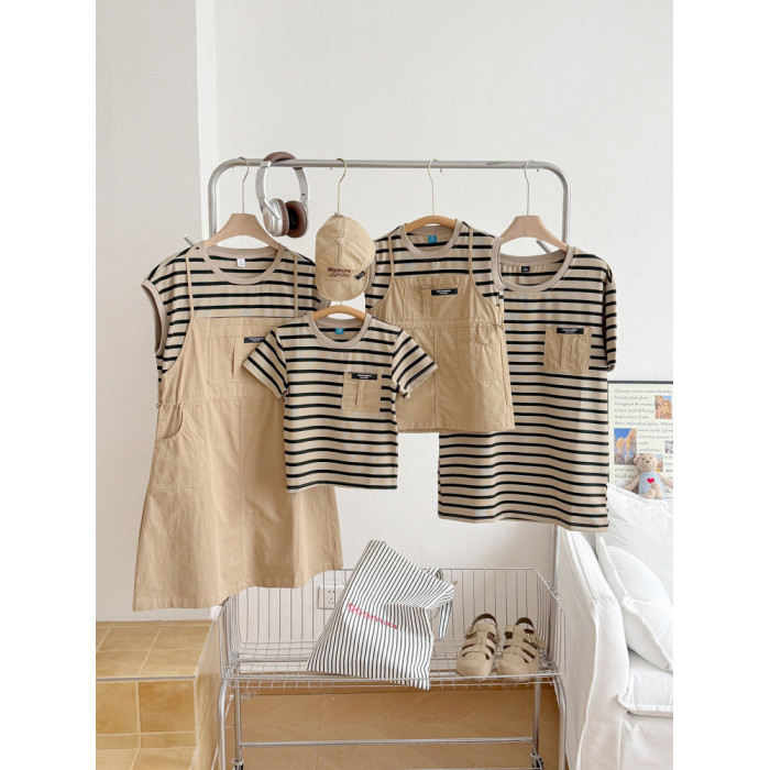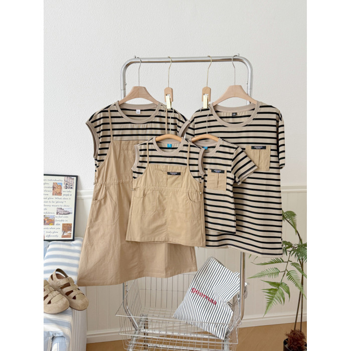 親子裝背帶裙套裝夏季條紋短袖母子母女一家三口幼兒園活動表演潮