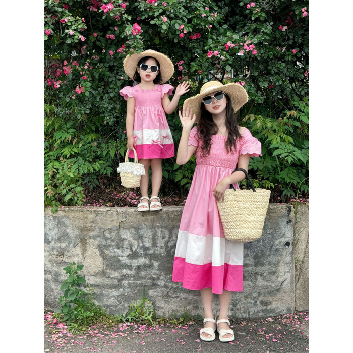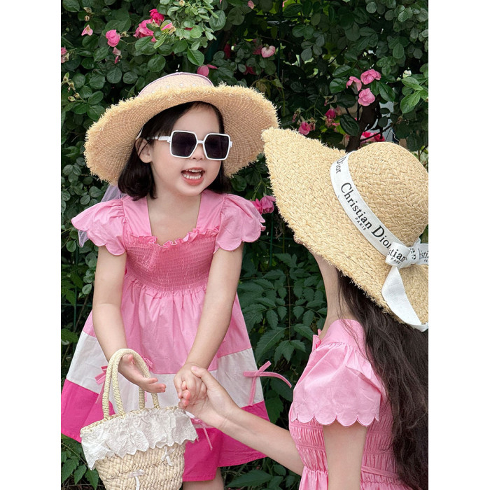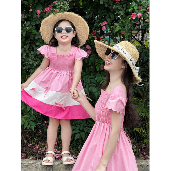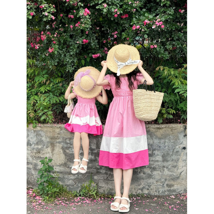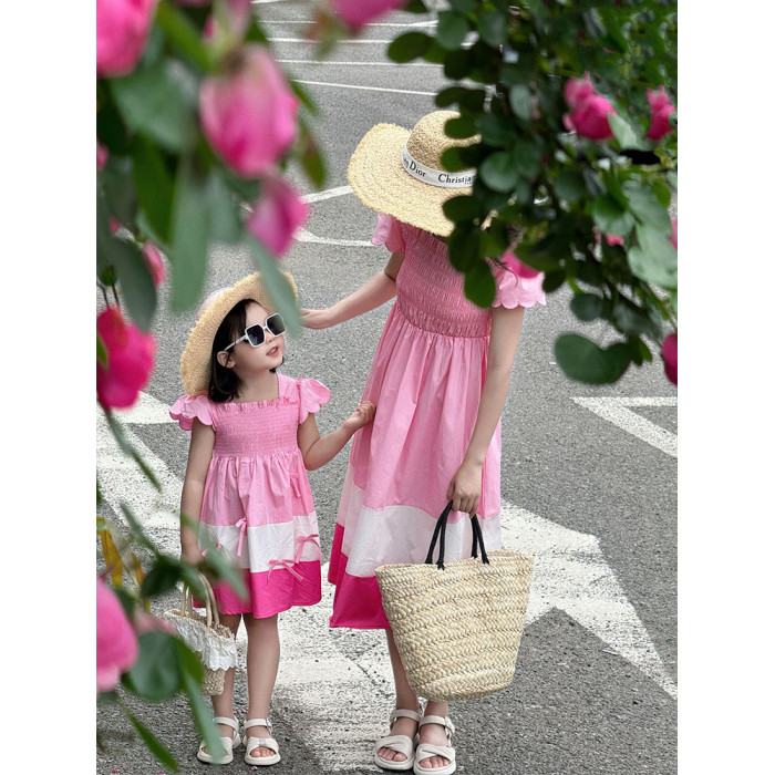 法式甜美母女裝粉色拼色公主裙2025新款旅遊出遊親子裝夏裝連衣裙