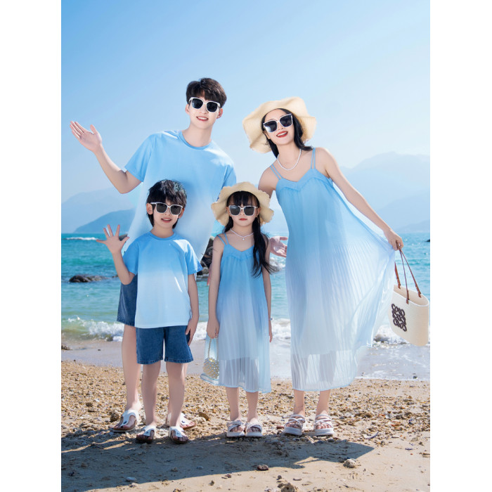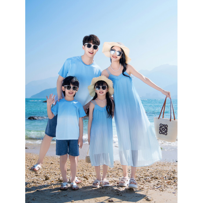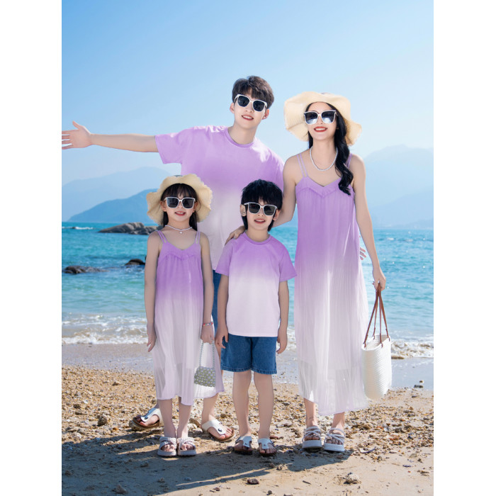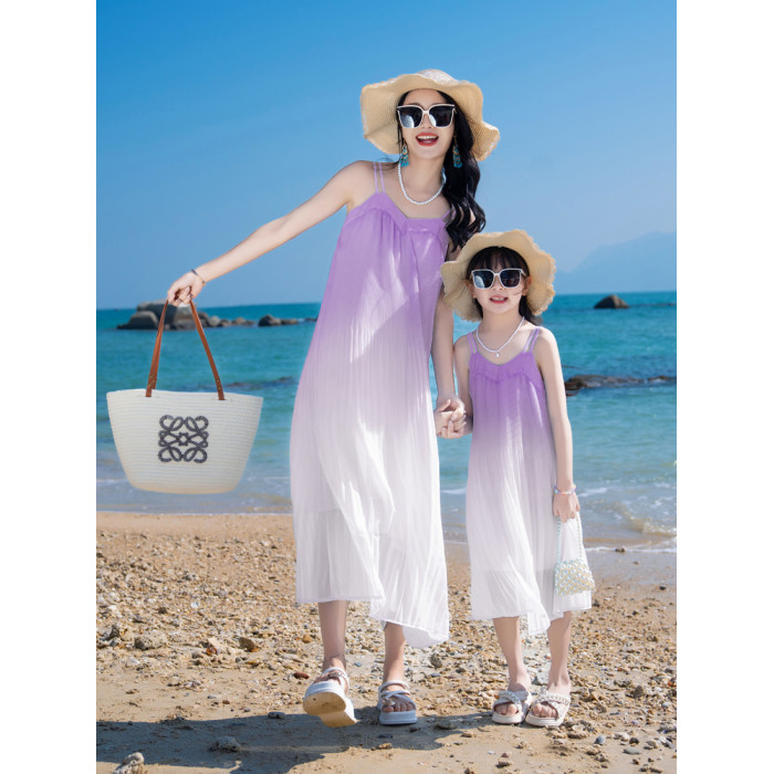 多巴胺沙灘親子裝2025夏季一家三四口三亞海邊母女度假吊帶連衣裙